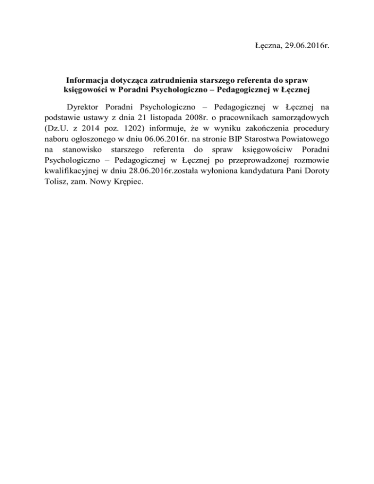 Łęczna, 29.06.2016r. Informacja dotycząca zatrudnienia starszego referenta do spraw księgowości w Poradni Psychologiczno – Pedagogicznej w Łęcznej Dyrektor Poradni Psychologiczno – Pedagogicznej w Łęcznej na podstawie ustawy z dnia 21 listopada 2008r. o pracownikach samorządowych (Dz.U. z 2014 poz. 1202) informuje, że w wyniku zakończenia procedury naboru ogłoszonego w dniu 06.06.2016r. na stronie BIP Starostwa Powiatowego na stanowisko starszego referenta do spraw księgowościw Poradni Psychologiczno – Pedagogicznej w Łęcznej po przeprowadzonej rozmowie kwalifikacyjnej w dniu 28.06.2016r.została wyłoniona kandydatura Pani Doroty Tolisz, zam. Nowy Krępiec.