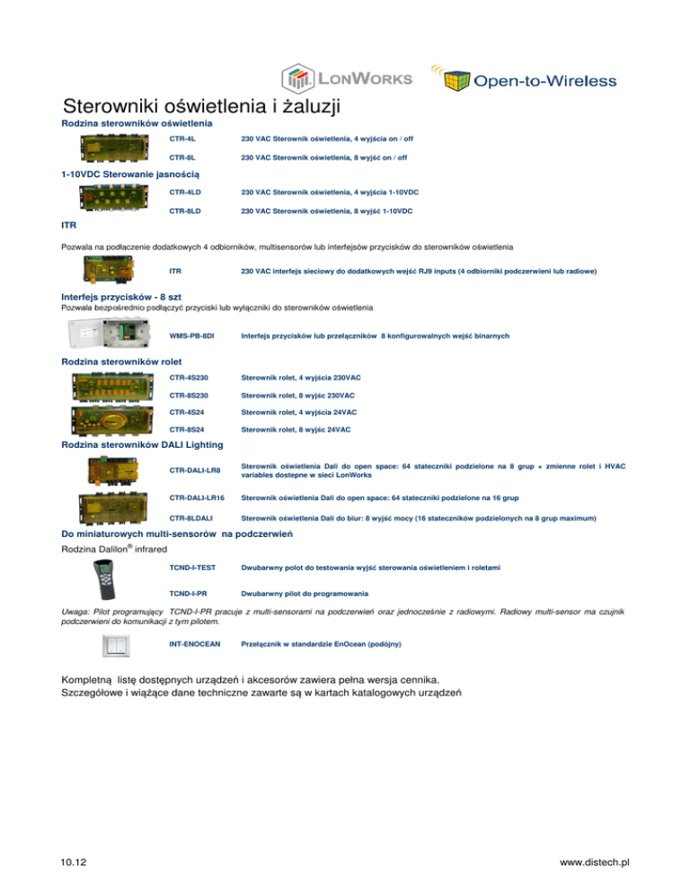 Sterowniki oświetlenia i żaluzji Rodzina sterowników oświetlenia CTR-4L 230 VAC Sterownik oświetlenia, 4 wyjścia on / off CTR-8L 230 VAC Sterownik oświetlenia, 8 wyjść on / off 1-10VDC Sterowanie jasnością CTR-4LD 230 VAC Sterownik oświetlenia, 4 wyjścia 1-10VDC CTR-8LD 230 VAC Sterownik oświetlenia, 8 wyjść 1-10VDC ITR Pozwala na podłączenie dodatkowych 4 odbiorników, multisensorów lub interfejsów przycisków do sterowników oświetlenia ITR 230 VAC interfejs sieciowy do dodatkowych wejść RJ9 inputs (4 odbiorniki podczerwieni lub radiowe) Interfejs przycisków - 8 szt Pozwala bezpośrednio podłączyć przyciski lub wyłączniki do sterowników oświetlenia WMS-PB-8DI Interfejs przycisków lub przełączników 8 konfigurowalnych wejść binarnych Rodzina sterowników rolet CTR-4S230 Sterownik rolet, 4 wyjścia 230VAC CTR-8S230 Sterownik rolet, 8 wyjśc 230VAC CTR-4S24 Sterownik rolet, 4 wyjścia 24VAC CTR-8S24 Sterownik rolet, 8 wyjśc 24VAC Rodzina sterowników DALI Lighting CTR-DALI-LR8 Sterownik oświetlenia Dali do open space: 64 stateczniki podzielone na 8 grup + zmienne rolet i HVAC variables dostepne w sieci LonWorks CTR-DALI-LR16 Sterownik oświetlenia Dali do open space: 64 stateczniki podzielone na 16 grup CTR-8LDALI Sterownik oświetlenia Dali do biur: 8 wyjść mocy (16 stateczników podzielonych na 8 grup maximum) Do miniaturowych multi-sensorów na podczerwień Rodzina Dalilon® infrared TCND-I-TEST Dwubarwny polot do testowania wyjść sterowania oświetleniem i roletami TCND-I-PR Dwubarwny pilot do programowania Uwaga: Pilot programujący TCND-I-PR pracuje z multi-sensorami na podczerwień oraz jednocześnie z radiowymi. Radiowy multi-sensor ma czujnik podczerwieni do komunikacji z tym pilotem. INT-ENOCEAN Przełącznik w standardzie EnOcean (podójny) Kompletną listę dostępnych urządzeń i akcesorów zawiera pełna wersja cennika. Szczegółowe i wiążące dane techniczne zawarte są w kartach katalogowych urządzeń 10.12 www.distech.pl