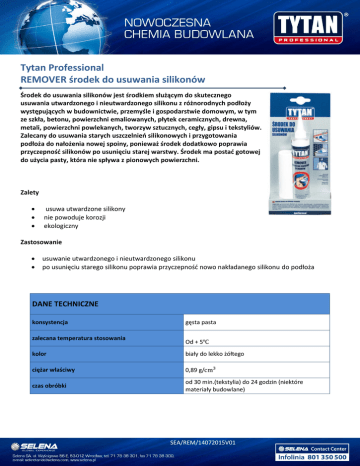 Tytan Professional REMOVER środek do usuwania silikonów Środek do usuwania silikonów jest środkiem służącym do skutecznego usuwania utwardzonego i nieutwardzonego silikonu z różnorodnych podłoży występujących w budownictwie, przemyśle i gospodarstwie domowym, w tym ze szkła, betonu, powierzchni emaliowanych, płytek ceramicznych, drewna, metali, powierzchni powlekanych, tworzyw sztucznych, cegły, gipsu i tekstyliów. Zalecany do usuwania starych uszczelnień silikonowych i przygotowania podłoża do nałożenia nowej spoiny, ponieważ środek dodatkowo poprawia przyczepność silikonów po usunięciu starej warstwy. Środek ma postać gotowej do użycia pasty, która nie spływa z pionowych powierzchni. Zalety usuwa utwardzone silikony nie powoduje korozji ekologiczny Zastosowanie usuwanie utwardzonego i nieutwardzonego silikonu po usunięciu starego silikonu poprawia przyczepność nowo nakładanego silikonu do podłoża DANE TECHNICZNE konsystencja zalecana temperatura stosowania gęsta pasta Od + 5℃ kolor biały do lekko żółtego ciężar właściwy 0,89 g/cm3 czas obróbki od 30 min.(tekstylia) do 24 godzin (niektóre materiały budowlane) SEA/REM/14072015V01 SPOSÓB UŻYCIA stosowanie preparatu nie wymaga żadnego specjalnego przygotowania podłoża . jedynym wymogiem jest mechaniczne usunięcie starego silikonu do grubości około 3 mm, co skraca czas oddziaływania środka oraz zmniejsza jego zużycie. w przypadku wrażliwych powierzchni (tworzywa sztuczne, powierzchnie powlekane, tekstylia) zaleca się przeprowadzenie wstępnej próby odporności podłoża tzn. nałożenie w niewidocznym miejscu niewielkiej ilości preparatu i sprawdzenie po paru godzinach stanu powierzchni. nałożyć warstwę środka do usuwania silikonu na starą spoinę. grubość warstwy preparatu powinna być 2-3 razy większa od grubości pozostałego silikonu i powinna wynosić co najmniej 4 mm pozostawić środek do przereagowania na około 12 godzin w przypadku cienkiej warstwy silikonu wystarczyć może jedna godzina, natomiast przy bardzo grubej warstwie spoiny lub niektórych materiałów porowatych konieczne może być ponowne nałożenie preparatu w przypadku tekstyliów i materiałów chłonnych zaleca się oddziaływanie nie dłuższe niż pół godziny, aby uniknąć ewentualnego zaplamienia podłoża. po przereagowaniu usunąć np. ręcznikiem papierowym rozpuszczony silikon ze środkiem czyszczącym OGRANICZENIA STOSOWANIA w przypadku powierzchni lakierowanych i malowanych, szczególnie farbami rozpuszczalnikowymi konieczne jest przeprowadzenie wcześniejszego testu odporności podłoża, ponieważ środek może powodować rozpuszczanie farb i lakierów środek do usuwania silikonu nie jest przeznaczony zarówno do kontaktów z żywnością, jak i do zastosowań medycznych ZAKOŃCZENIE PRACY resztki środka usunąć gąbką zamoczoną w wodzie z mydłem preparat z rąk należy usunąć wodą z mydłem OPAKOWANIE / PRZECHOWYWANIE Przechowywać do 12 miesięcy w oryginalnie zamkniętym opakowaniu w suchych, dobrze wentylowanych pomieszczeniach, w temperaturze od >0 °C do +25 °C Ostrzeżenia i zalecenia BHP Przestrzegać ogólnych zasad BHP, podczas stosowania nie jeść, nie pić, nie palić miejsce pracy powinno być dobrze wentylowane nieutwardzony produkt może działać drażniąco na błony śluzowe i oczy. PRZED ZASTOSOWANIEM NALEŻY ZAPOZNAĆ SIĘ Z KARTĄ BEZPIECZEŃSTWA PRODUKTU LUB PRZECZYTAĆ ETYKIETĘ NA OPAKOWANIU. Data sporządzenia 01.07.2015 Powyższe dane, zalecenia i wskazówki opierają się na naszej najlepszej wiedzy, badaniach oraz doświadczeniach i zostały udzielone w dobrej wierze, zgodnie z zasadami obowiązującymi w naszej firmie i u naszych dostawców. Zaproponowane sposoby postępowania uznane są za powszechne, jednak każdy z użytkowników tego materiału powinien upewnić się na wszelkie możliwe sposoby, włącznie ze sprawdzeniem produktu końcowego w odpowiednich warunkach, o przydatności dostarczanych materiałów dla osiągnięcia celów przez niego zamierzonych. Ani Spółka, ani jej upoważnieni przedstawiciele nie mogą ponosić odpowiedzialności za jakiekolwiek straty poniesione na skutek nieprawidłowego, bądź błędnego użycia jej materiałów. SEA/REM/14072015V01
