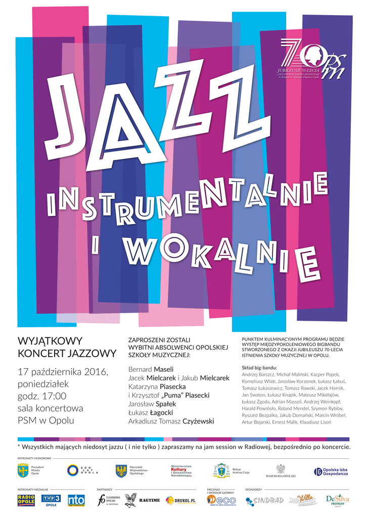 JUBILEUSZ 70-LECIA PA¡STWOWEJ SZKOŁY MUZYCZNEJ I i II stopnia im. Fryderyka Chopina w Opolu WYJĄTKOWY KONCERT JAZZOWY ZAPROSZENI ZOSTALI WYBITNI ABSOLWENCI OPOLSKIEJ SZKOŁY MUZYCZNEJ: PUNKTEM KULMINACYJNYM PROGRAMU BĘDZIE WYSTĘP MIĘDZYPOKOLENIOWEGO BIGBANDU STWORZONEGO Z OKAZJI JUBILEUSZU 70-LECIA ISTNIENIA SZKOŁY MUZYCZNEJ W OPOLU. 17 października 2016, poniedziałek godz. 17:00 sala koncertowa PSM w Opolu Bernard Maseli Jacek Mielcarek i Jakub Mielcarek Katarzyna Piasecka i Krzysztof „Puma” Piasecki Jarosław Spałek Łukasz Łagocki Arkadiusz Tomasz Czyżewski Skład big-bandu: Andrzej Barszcz, Michał Maliński, Kacper Popek, Korneliusz Wiatr, Jarosław Korzonek, Łukasz Łabuś, Tomasz Łukasiewicz, Tomasz Rawski, Jacek Hornik, Jan Swaton, Łukasz Knapik, Mateusz Mikołajów, Łukasz Zgoda, Adrian Masseli, Andrzej Weinkopf, Harald Powrósło, Roland Mendel, Szymon Rybitw, Ryszard Bezpalko, Jakub Domański, Marcin Wróbel, Artur Bojarski, Ernest Malik, Klaudiusz Lisoń * Wszystkich mających niedosyt jazzu ( i nie tylko ) zapraszamy na jam session w Radiowej, bezpośrednio po koncercie. PATRONATY HONOROWE Prezydent Miasta Opola PATRONATY MEDIALNE Marszałek Województwa Opolskiego PARTNERZY Biskup Andrzej Czaja MECENAS I SPONSOR GŁÓWNY SPONSORZY