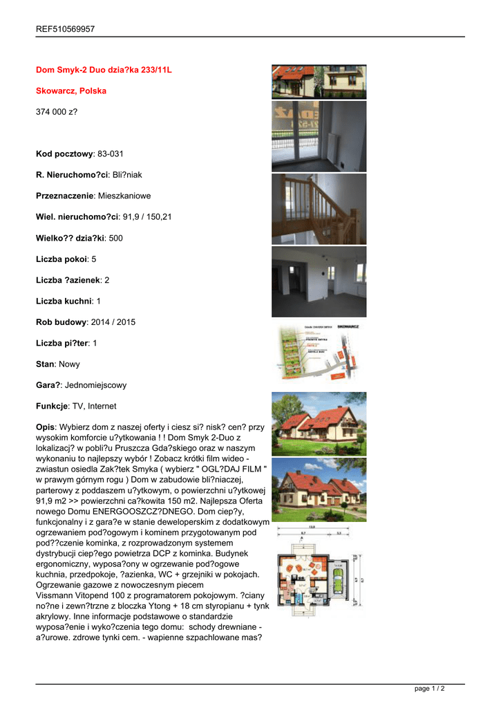 REF510569957 Dom Smyk-2 Duo dzia?ka 233/11L Skowarcz, Polska 374 000 z? Kod pocztowy: 83-031 R. Nieruchomo?ci: Bli?niak Przeznaczenie: Mieszkaniowe Wiel. nieruchomo?ci: 91,9 / 150,21 Wielko?? dzia?ki: 500 Liczba pokoi: 5 Liczba ?azienek: 2 Liczba kuchni: 1 Rob budowy: 2014 / 2015 Liczba pi?ter: 1 Stan: Nowy Gara?: Jednomiejscowy Funkcje: TV, Internet Opis: Wybierz dom z naszej oferty i ciesz si? nisk? cen? przy wysokim komforcie u?ytkowania ! ! Dom Smyk 2-Duo z lokalizacj? w pobli?u Pruszcza Gda?skiego oraz w naszym wykonaniu to najlepszy wybór ! Zobacz krótki film wideo zwiastun osiedla Zak?tek Smyka ( wybierz " OGL?DAJ FILM " w prawym górnym rogu ) Dom w zabudowie bli?niaczej, parterowy z poddaszem u?ytkowym, o powierzchni u?ytkowej 91,9 m2 >> powierzchni ca?kowita 150 m2. Najlepsza Oferta nowego Domu ENERGOOSZCZ?DNEGO. Dom ciep?y, funkcjonalny i z gara?e w stanie deweloperskim z dodatkowym ogrzewaniem pod?ogowym i kominem przygotowanym pod pod??czenie kominka, z rozprowadzonym systemem dystrybucji ciep?ego powietrza DCP z kominka. Budynek ergonomiczny, wyposa?ony w ogrzewanie pod?ogowe kuchnia, przedpokoje, ?azienka, WC + grzejniki w pokojach. Ogrzewanie gazowe z nowoczesnym piecem Vissmann Vitopend 100 z programatorem pokojowym. ?ciany no?ne i zewn?trzne z bloczka Ytong + 18 cm styropianu + tynk akrylowy. Inne informacje podstawowe o standardzie wyposa?enie i wyko?czenia tego domu: schody drewniane a?urowe. zdrowe tynki cem. - wapienne szpachlowane mas? page 1 / 2 REF510569957 gipsow? oraz malowane, nowoczesne grzejniki Sterrad Novello z g?owicami termostatycznymi firmy Herz, instalacja miedziana i z alu/pex/alu renomowanej firmy Herz, ogrzewanie pod?ogowe w ci?gach komunikacyjnych, ?azience, WC, kot?owni, dystrybucja ciep?ego powietrza z kominka do wszystkich pokoi na poddaszu, dach - dachówka znanej i cenionej firmy Euronit lub Braas, podbitka drewniana impregnowana dwu lub trzykrotnie "palisandrem" posesja ogrodzona z trzech stron, podjazdy i chodniki piesze z kostki Classico firmy Seemerlock Bramy segmentowe ocieplane z mo?liwo?ci? zastosowania sterowania automatycznego firmy Wi?niowski w kolorze z?oty d?b Drzwi antyw?amaniowe firmy KMT, w kolorze z?oty d?b okna firmy Drutex w kolorze zewn?trznym z?oty d?b, Ponadto stosujemy wiele innych elementów wp?ywaj?cych na komfort funkcjonalny, cieplny i u?ytkowy. równie? na etapie budowy mo?ecie mie? Pa?stwo mo?liwo?? nieodp?atnego wp?yw na ustawienie ?cianek dzia?owych wg w?asnych potrzeb. Skowarcz w gminie Pszczó?ki, to przepi?kna nowoczesna i rozwojowa wie? po?o?ona na trasie Tczew - Pruszcz Gda?ski , sk?d zawsze i wsz?dzie ?atwo dojecha?. W 5 minut znajdziesz si? w Pruszczu Gda?ski, na Obwodnicy Trójmiasta, na Autostradzie A-1, W pobli?u znajduj? si? liczne ?cie?ki rowerowe, o?rodki rekreacyjno-sportowe oraz w blisko?ci lasy. Do szko?y podstawowej i przystanku ZKM, to zaledwie 5 min drogi pieszo. Natomiast do przystanku PKP podmiejskiej kolejki SKM to zaledwie 10 min drogi pieszo. Domy w przemy?lanej lokalizacji na Kameralnym Osiedlu " Zak?tek Smyka" to kontynuacja II Etapu budowy domów w zachodniej cz??ci Skowarcza zapowiadanej wcze?niej podczas budowy niewielkiego pilota?owego "Osiedla przy Jod?owej" oznaczonego równie? na poni?szej mapie. Uwaga ! Podoba si? Pa?stwu nasza oferta, a kwalifikujecie si? Pa?stwo do dop?at w programie Mieszkanie dla M?odych, to mamy dobr? wiadomo??, gdy? wszystkie domy oferowane na osiedlu Zak?tek Smyka mo?na naby? z dop?at? w MdM, a dom Smy-2 Duo nawet ju? od 339 tys z? brutto z dzia?k? 500 m2. Zapraszamy do zapoznania si? z przyk?adowymi wyliczeniami dop?at w MdM: >> przejd? do przyk?adowych zestawie? page 2 / 2