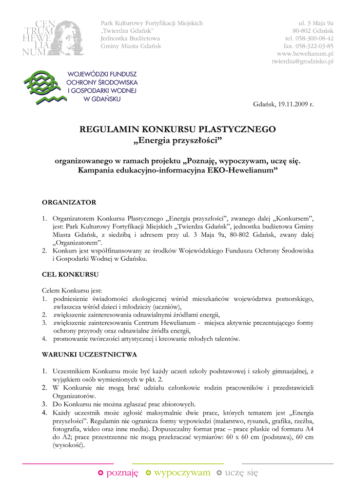 Gdańsk, 19.11.2009 r. REGULAMIN KONKURSU PLASTYCZNEGO „Energia przyszłości” organizowanego w ramach projektu „Poznaję, wypoczywam, uczę się. Kampania edukacyjno-informacyjna EKO-Hewelianum” ORGANIZATOR 1. Organizatorem Konkursu Plastycznego „Energia przyszłości”, zwanego dalej „Konkursem”, jest: Park Kulturowy Fortyfikacji Miejskich „Twierdza Gdańsk”, jednostka budŜetowa Gminy Miasta Gdańsk, z siedzibą i adresem przy ul. 3 Maja 9a, 80-802 Gdańsk, zwany dalej „Organizatorem”. 2. Konkurs jest współfinansowany ze środków Wojewódzkiego Funduszu Ochrony Środowiska i Gospodarki Wodnej w Gdańsku. CEL KONKURSU Celem Konkursu jest: 1. podniesienie świadomości ekologicznej wśród mieszkańców województwa pomorskiego, zwłaszcza wśród dzieci i młodzieŜy (uczniów), 2. zwiększenie zainteresowania odnawialnymi źródłami energii, 3. zwiększenie zainteresowania Centrum Hewelianum - miejsca aktywnie prezentującego formy ochrony przyrody oraz odnawialne źródła energii, 4. promowanie twórczości artystycznej i kreowanie młodych talentów. WARUNKI UCZESTNICTWA 1. Uczestnikiem Konkursu moŜe być kaŜdy uczeń szkoły podstawowej i szkoły gimnazjalnej, z wyjątkiem osób wymienionych w pkt. 2. 2. W Konkursie nie mogą brać udziału członkowie rodzin pracowników i przedstawicieli Organizatorów. 3. Do Konkursu nie moŜna zgłaszać prac zbiorowych. 4. KaŜdy uczestnik moŜe zgłosić maksymalnie dwie prace, których tematem jest „Energia przyszłości”. Regulamin nie ogranicza formy wypowiedzi (malarstwo, rysunek, grafika, rzeźba, fotografia, wideo oraz inne media). Dopuszczalny format prac – prace płaskie od formatu A4 do A2; prace przestrzenne nie mogą przekraczać wymiarów: 60 x 60 cm (podstawa), 60 cm (wysokość). 1 5. Zgłoszenie do Konkursu następuje poprzez dostarczenie do siedziby Organizatora opisanej pracy (imię i nazwisko oraz wiek) wraz z kartą zgłoszenia. Do zgłoszenia naleŜy dołączyć pisemne oświadczenie zawierające zgodę na przetwarzanie danych osobowych. Zarówno karta zgłoszeniowa, jak i oświadczenie zawierające zgodę na przetwarzanie danych osobowych muszą być podpisane przez rodzica lub opiekuna prawnego autora, działającego w jego imieniu. Karta zgłoszenia wraz z oświadczeniem są dostępne na stronie www.hewelianum.pl 6. Nadesłanie pracy wraz z kartą zgłoszenia oraz oświadczeniem jest równoznaczne z zaakceptowaniem regulaminu Konkursu. Prace bez karty zgłoszenia lub z kartą nieposiadającą wszystkich wymaganych danych będą odrzucane bez dodatkowego informowania zgłaszającego. Podobne skutki wywołuje brak oświadczenia zawierającego zgodę na przetwarzanie danych osobowych lub jego wadliwość. 7. Ostateczny termin nadsyłania prac mija 31 grudnia 2009 roku. Prace zgłoszone po tym terminie nie będą brane pod uwagę (decyduje data wpływu pracy konkursowej do siedziby Organizatora). 8. Z chwilą zakwalifikowania prac do Konkursu Organizator uzyskuje prawo własności do zgłoszonych prac oraz majątkowe prawa autorskie, na czas nieokreślony, na następujących polach eksploatacji: 1) zwielokrotnianie i utrwalanie prac dowolną techniką, w dowolnej ilości egzemplarzy, przeniesienie i utrwalenie w innej dowolnej technice artystycznej (w szczególności drukarskiej, fotograficznej itp.), 2) dokonanie publikacji prac, 3) wprowadzenie prac do obrotu publicznego w taki sposób, aby kaŜdy mógł mieć do nich dostęp w miejscu i w czasie przez siebie wybranym, 4) publicznego odtwarzanie, wyświetlanie, nadawanie za pomocą wizji przez stację naziemną, nadawania za pośrednictwem satelity, 5) udzielenie zgody na korzystanie z utworu przez osoby trzecie w sposób wskazany powyŜej, w szczególności w drodze uŜyczenia. 9. Zgłoszenie pracy do Konkursu jest równoznaczne ze zrzeczeniem się majątkowych praw autorskich swoich prac na rzecz Organizatora Konkursu. 10. Dane osobowe uczestników będą wykorzystane wyłącznie w celu organizacji Konkursu oraz wyłonienia zwycięzców i przyznania nagród. Uczestnik oraz jego rodzic lub opiekun prawny wyraŜają zgodę na przetwarzanie (imię i nazwisko, adres, numer telefonu, e-mail, wiek, nazwa szkoły, do której uczęszcza, klasa) i publikowanie danych uczestnika - autora pracy (imię i nazwisko, wiek, nazwa szkoły, do której uczęszcza) na stronie internetowej Organizatora oraz w ramach wystawy pokonkursowej. 11. Organizator uzyskuje prawo do wielokrotnej publikacji prac zgłoszonych do Konkursu, oznaczonych imieniem i nazwiskiem autora, w wydawanych przez siebie materiałach promocyjnych. JURY 1. Organizator powołuje Jury w składzie: Dorota Cieślicka – Przewodnicząca, Lucyna Rokitiańska i Dorota Bazylewicz. 2. Jury zamieści informację o nagrodzonych uczestnikach Konkursu na stronie www.hewelianum.pl 3. Werdykt Jury jest ostateczny, od postanowień Jury nie przysługuje odwołanie. 2 KRYTERIA OCENY PRAC KONKURSOWYCH Ocena prac konkursowych nastąpi w oparciu o poniŜsze kryteria: 1. zgodność z tematem „Energia przyszłości”, 2. oryginalny sposób interpretacji tematu, 3. poprawność warsztatu pracy, 4. ogólne wraŜenia estetyczne. NAGRODY 1. Nagrody zostaną przyznane w dwóch kategoriach: uczniowie szkół podstawowych i szkół gimnazjalnych. 2. W kaŜdej z kategorii wymienionych w pkt. 1 zostaną przyznane trzy nagrody: z zajęcie I miejsca w Konkursie, za zajęcie II miejsca w Konkursie, za zajęcie III miejsca w Konkursie. 3. Nagrody naleŜy odebrać do dnia 31 stycznia 2009 roku w siedzibie Organizatora przy ul. 3 Maja 9a w Gdańsku, po uprzednim kontakcie z p. Dorotą Cieślicką tel. 058 300 08 42 wew. 39, e-mail: [email protected] 4. Nagrodę odebrać moŜe tylko osoba dorosła – rodzic lub opiekun prawny nagrodzonego uczestnika Konkursu. 5. Nagrodzone prace zaprezentowane zostaną na wystawie pokonkursowej zaplanowanej na styczeń 2010 roku. POSTANOWIENIA KOŃCOWE 1. Organizator Konkursu nie pono