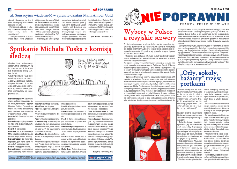 IX 2012, nr nr 3 4 (35) (36) V 2012, 4 cd. Sensacyjna wiadomość w sprawie działań Mafii Amber Gold skazani odpowiednio na trzy i sześć miesięcy więzienia w zawieszeniu na dwa lata. Przytaczam to już teraz, by zobaczyć za jakiś czas, czy sądy „niezawisłe” będą równe dla „równiejszych”. Zatem jeśli świadomie, przedstawiciele rządu Tuska umożliwiali wielokrotnemu skazanemu Plichcie vel Skowrońskiemu działania, to przez porównanie muszą ponieść odpowiedzialność karną! Ustalić trzeba niezwłocznie, jacy to ludzie? Należy już stwierdzić, że patrząc całościowo... nie jesteśmy Państwem Demokratycznym! Rola Plichty jako „słupa” jest już przesądzona! Możemy być świadkami wkrótce „wojny na górze” tj. służb, ABW- Bondaryka z Tuskiem i rządem. Jeśli dodamy do tego prawdopodobny udział osób z „Bursztynowego bagna” oraz możliwość wyprania pieniędzy od znanych gangsterów. Jeśli weźmiemy pod uwagę tuszowanie wie- lu działań instytucji Państwa Polskiego na szkodę jej obywateli to mamy obraz i Gigant Sprawę, Zorganizowanej Mafii Przestępczej o nieznanej jeszcze do końca skali ostatniego dwudziestolecia! prof Rycho, 7 września, 2012 Spotkanie Michała Tuska z komi sją śled czą Gdyby losy sejmowego głosowania potoczyły się inaczej i powstałaby komisja, badająca aferę Amber Gold... Gdyby posłowie PSL postanowili głosować w duchu odpowiedzialności za kraj... Gdyby Donald Tusk nie obiecał wcześniej Michałowi, że komisji nie będzie... i tak skończyłoby się to zapewne tak... Przewodniczący, PO: Dziś rozmawiamy – unikajmy niosącego złe słowa słowa „przesłuchanie” – z panem Michałem Tuskiem. Ponieważ pan Michał jest osobą zapracowaną, każdy z państwa musi zmieścić się w pięciominutowej rundzie. Poseł 1 (PiS): Dlaczego? Na jakiej podstawie? Przewodniczący: Było głosowanie, nie moja wina, że państwo byli wtedy na przerwie. Poseł 1: To jest skandal. Poseł 2 (SLD): To jest demokracja. Mi też nie podoba się ta decyzja, ale nie robię z tego powodu awantury. Przewodniczący: Nie traćmy cennego czasu, pan Michał czeka. Panie pośle 1, proszę zaczynać. Poseł 1: Proszę pana, w liście... Przewodniczący: A, przepraszam, zanim zaczniemy. Panie Michale, może herbatki? Może ciasteczko? Michał Tusk: Nie, dziękuję. Poseł 1: A więc w liście, który przesłał pan... Przewodniczący: Proszę nie dręczyć świadka. Poseł 1: Chciałbym zadać pytanie. Przewodniczący: Ja panu nie przeszkadzam. Ale skoro przerwaliśmy: Panie Michale, może jednak herbatki? Albo wody? Ma pan wygodne krzesło? Może podusię? Michał Tusk: Nie, dziękuję. Przypominam, że muszę niedługo wracać do pracy. Przewodniczący: Tak, tak, oczywiście. Proszę się nie denerwować, proszę wygodnie usiąść. A panom posłom przypominam, że każdy ma pięć minut czasu na swobodną roz- mowę ze świadkiem. Poseł 1: Wracajac do listu. Napisał pan, między inymi... Przewodniczący: Przypominam, że nie musi pan odpowiadać na pytanie. Poseł 1: Panie przewodniczący, pan uniemożliwia mi prowadzenie przesłuchania. Przewodniczący: Przypominam, że umówiliśmy się, że używamy słowa „przesłuchanie”. Ma pan jeszcze minutę. Poseł 1: W liście napisał pan, że prosi o wypłatę, choć publicznie deklarował pan zupełnie inne relacje z ówczesnym pracodawcą, a w zasadzie ich brak... Michał Tusk: To było dość dawno temu i już nie pamiętam. Przepra- Gazetka NIEPOPRAWNI.PL. Serwis tworzymy własnymi siłami, bez sponsorów, kolporterów i wsparcia mediów oraz niekomercyjnie. Numer przygotowali: gawrion,woj.slawek, Mała Mi, ma, terka ,Wuj Mściwój. szam, ale muszę już lecieć. Zawsze interesowałem się lataniem. Panowie wybaczą – praca czeka. Poseł 3 (PSL) do posła 1: Przez pana awantury nie porozmawialiśmy z ważnym świadkiem. Przewodniczący: Komisja wyciągnie z tego wnioski. Panie Michale, może zanim pan pojedzie, jeszcze herbatki? Ciasta? Konfitury? Podoba się panu ten kubeczek? Proszę zabrać na pamiątkę. O, a tu mam pana zdjęcie, pan mi da autograf dla córki. O, a może pan chce jej zdjęcie zobaczyć? Śliczna, prawda? Tu pan ma jej numer telefonu. Bardzo dziękuję, że pan nas dziś odwiedził i przepraszam za mojego kolegę. Budyń78, 3 września, 2012 Wybory w Polsce a rosyjskie serwery Z niedowierzaniem czytam informację, przecierając oczy ze zdumienia, że Państwowa Komisja Wyborcza podczas ostatnich wyborów korzystała z gościnności rosyjskich serwerów. Raport w tej sprawie otrzymał poseł PiS Maks Kraczkowski. Oprócz tej, jakże szokującej informacji, znalazły się również w dostarczonym posłowi materiale, wydruki informatyczne wskazujące, że ten proceder miał rzeczywiście miejsce: „W raporcie jest cały wydruk informatyczny wskazujący na to, że duża część materiałów analizowanych przez Państwową Komisję Wyborczą przechodzi przez rosyjskie serwery. I teraz pytanie - czy to prawda i czy te serwery zostały sprawdzone pod względem bezpieczeństwa przechowywanych i przetwarzanych informacji przez na przykład Agencję Bezpieczeństwa Wewnętrznego? Sprawa jest rozwojowa, poseł ma się zwrócić w tej sprawie do ABW z prośbą o wyjaśnienie. Przyznam szczerze, że mało mnie interesuje w tym momencie odpowiedź polskich służb specjalnych, czy należycie zabezpieczyły rosyjskie serwery, tak, aby nie było możliwości fałszerstwa wyborczego. Służby, Premier czy sam Prezydent mogą zapewniać, że owszem jak najbardziej wszystko zostało zbadane i podjęto odpowiednie kroki, by zapobiec przestępstwu. Jednak po doświadczeniach związanych z 10 kwietnia ich zapewnienia mogą być tyle warte, ile papier, na którym zostaną spisane. Ileż to razy zapewniano Polaków, że wszystkie urządzenia elektronicznie, należące do ofiar zostały zabezpieczone, a telefony ofiar natychmiast dezaktywowane, tymczasem po kilku mi