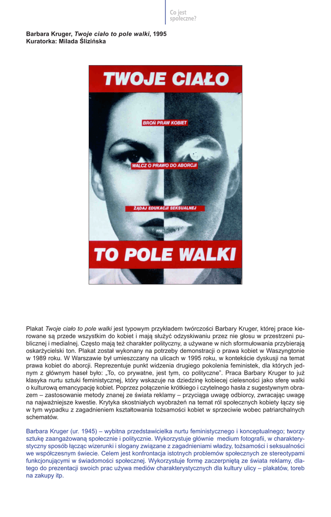 Barbara Kruger, Twoje ciało to pole walki, 1995 Kuratorka: Milada Ślizińska Plakat Twoje ciało to pole walki jest typowym przykładem twórczości Barbary Kruger, której prace kierowane są przede wszystkim do kobiet i mają służyć odzyskiwaniu przez nie głosu w przestrzeni publicznej i medialnej. Często mają też charakter polityczny, a używane w nich sformułowania przybierają oskarżycielski ton. Plakat został wykonany na potrzeby demonstracji o prawa kobiet w Waszyngtonie w 1989 roku. W Warszawie był umieszczany na ulicach w 1995 roku, w kontekście dyskusji na temat prawa kobiet do aborcji. Reprezentuje punkt widzenia drugiego pokolenia feministek, dla których jednym z głównym haseł było: „To, co prywatne, jest tym, co polityczne”. Praca Barbary Kruger to już klasyka nurtu sztuki feministycznej, który wskazuje na dziedzinę kobiecej cielesności jako sferę walki o kulturową emancypację kobiet. Poprzez połączenie krótkiego i czytelnego hasła z sugestywnym obra zem – zastosowanie metody znanej ze świata reklamy – przyciąga uwagę odbiorcy, zwracając uwagę na najważniejsze kwestie. Krytyka skostniałych wyobrażeń na temat ról społecznych kobiety łączy się w tym wypadku z zagadnieniem kształtowania tożsamości kobiet w sprzeciwie wobec patriarchalnych schematów. Barbara Kruger (ur. 1945) – wybitna przedstawicielka nurtu feministycznego i konceptualnego; tworzy sztukę zaangażowaną społecznie i politycznie. Wykorzystuje głównie medium fotografii, w charakterystyczny sposób łącząc wizerunki i slogany związane z zagadnieniami władzy, tożsamości i seksualności we współczesnym świecie. Celem jest konfrontacja istotnych problemów społecznych ze stereotypami funkcjonującymi w świadomości społecznej. Wykorzystuje formę zaczerpniętą ze świata reklamy, dlatego do prezentacji swoich prac używa mediów charakterystycznych dla kultury ulicy – plakatów, toreb na zakupy itp.