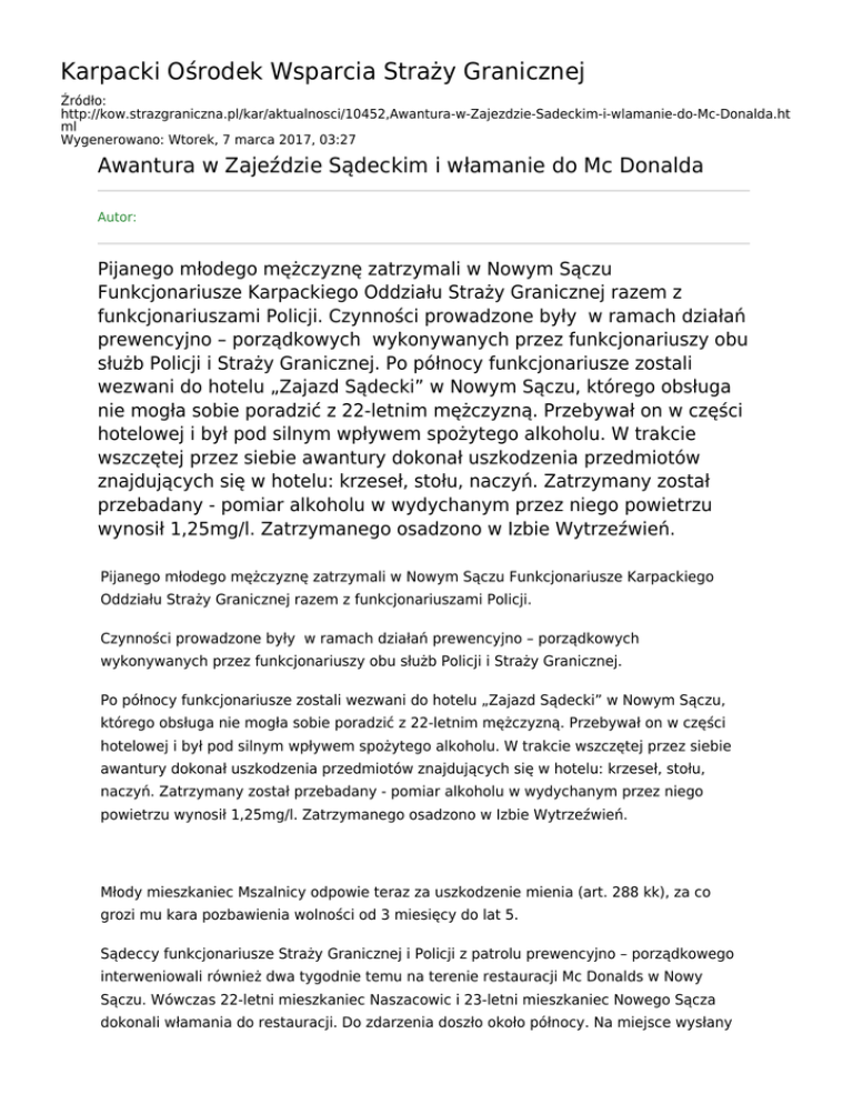Karpacki Ośrodek Wsparcia Straży Granicznej Źródło: http://kow.strazgraniczna.pl/kar/aktualnosci/10452,Awantura-w-Zajezdzie-Sadeckim-i-wlamanie-do-Mc-Donalda.ht ml Wygenerowano: Wtorek, 7 marca 2017, 03:27 Awantura w Zajeździe Sądeckim i włamanie do Mc Donalda Autor: Pijanego młodego mężczyznę zatrzymali w Nowym Sączu Funkcjonariusze Karpackiego Oddziału Straży Granicznej razem z funkcjonariuszami Policji. Czynności prowadzone były w ramach działań prewencyjno – porządkowych wykonywanych przez funkcjonariuszy obu służb Policji i Straży Granicznej. Po północy funkcjonariusze zostali wezwani do hotelu „Zajazd Sądecki” w Nowym Sączu, którego obsługa nie mogła sobie poradzić z 22-letnim mężczyzną. Przebywał on w części hotelowej i był pod silnym wpływem spożytego alkoholu. W trakcie wszczętej przez siebie awantury dokonał uszkodzenia przedmiotów znajdujących się w hotelu: krzeseł, stołu, naczyń. Zatrzymany został przebadany - pomiar alkoholu w wydychanym przez niego powietrzu wynosił 1,25mg/l. Zatrzymanego osadzono w Izbie Wytrzeźwień. Pijanego młodego mężczyznę zatrzymali w Nowym Sączu Funkcjonariusze Karpackiego Oddziału Straży Granicznej razem z funkcjonariuszami Policji. Czynności prowadzone były w ramach działań prewencyjno – porządkowych wykonywanych przez funkcjonariuszy obu służb Policji i Straży Granicznej. Po północy funkcjonariusze zostali wezwani do hotelu „Zajazd Sądecki” w Nowym Sączu, którego obsługa nie mogła sobie poradzić z 22-letnim mężczyzną. Przebywał on w części hotelowej i był pod silnym wpływem spożytego alkoholu. W trakcie wszczętej przez siebie awantury dokonał uszkodzenia przedmiotów znajdujących się w hotelu: krzeseł, stołu, naczyń. Zatrzymany został przebadany - pomiar alkoholu w wydychanym przez niego powietrzu wynosił 1,25mg/l. Zatrzymanego osadzono w Izbie Wytrzeźwień. Młody mieszkaniec Mszalnicy odpowie teraz za uszkodzenie mienia (art. 288 kk), za co grozi mu kara pozbawienia wolności od 3 miesięcy do lat 5. Sądeccy funkcjonariusze Straży Granicznej i Policji z patrolu prewencyjno – porządkowego interweniowali również dwa tygodnie temu na terenie restauracji Mc Donalds w Nowy Sączu. Wówczas 22-letni mieszkaniec Naszacowic i 23-letni mieszkaniec Nowego Sącza dokonali włamania do restauracji. Do zdarzenia doszło około północy. Na miejsce wysłany został patrol prewencyjno – porządkowy. Funkcjonariusze zatrzymali obu mężczyzn, którzy odpowiedzą teraz za kradzież z włamaniem (art. 279 kk - czyn zagrożony karą od 1 roku do 10 lat) oraz zniszczenie mienia (art. 288 kk - czyn zagrożony karą od 3 miesięcy do lat 5) na szkodę restauracji Mc Donalds w Nowym Sączu.