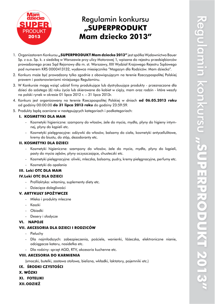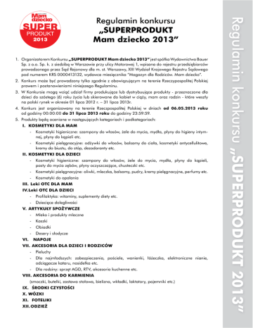 PRODUKT 2013 1. Organizatorem Konkursu „SUPERPRODUKT Mam dziecko 2013” jest spółka Wydawnictwo Bauer Sp. z o.o. Sp. k. z siedzibą w Warszawie przy ulicy Motorowej 1, wpisana do rejestru przedsiębiorców prowadzonego przez Sąd Rejonowy dla m. st. Warszawy, XIII Wydział Krajowego Rejestru Sądowego pod numerem KRS 0000413132, wydawca miesięcznika ”Magazyn dla Rodziców. Mam dziecko”. 2. Konkurs może być prowadzony tylko zgodnie z obowiązującym na terenie Rzeczypospolitej Polskiej prawem i postanowieniami niniejszego Regulaminu. 3. W Konkursie mogą wziąć udział firmy produkujące lub dystrybuujące produkty - przeznaczone dla dzieci do szóstego (6) roku życia lub skierowane do kobiet w ciąży, mam oraz rodzin - które weszły na polski rynek w okresie 01 lipca 2012 r. – 31 lipca 2013r. 4. Konkurs jest organizowany na terenie Rzeczpospolitej Polskiej w dniach od 06.05.2013 roku od godziny 00:00:00 do 31 lipca 2013 roku do godziny 23:59:59. 5. Produkty będą oceniane w następujących kategoriach i podkategoriach: I. KOSMETYKI DLA MAM - Kosmetyki higieniczne: szampony do włosów, żele do mycia, mydła, płyny do higieny intymnej, płyny do kąpieli etc. - Kosmetyki pielęgnacyjne: odżywki do włosów, balsamy do ciała, kosmetyki antycellulitowe, kremy do biustu, do stóp, dezodoranty etc. II. KOSMETYKI DLA DZIECI - Kosmetyki higieniczne: szampony do włosów, żele do mycia, mydła, płyny do kąpieli, pasty do mycia zębów, płyny oczyszczające, chusteczki etc. - Kosmetyki pielęgnacyjne: oliwki, mleczka, balsamy, pudry, kremy pielęgnacyjne, perfumy etc. - Kosmetyki do opalania III. Leki OTC DLA MAM IV. Leki OTC DLA DZIECI - Profilaktyka: witaminy, suplementy diety etc. - Dziecięce dolegliwości V. ARTYKUŁY SPOŻYWCZE - Mleko i produkty mleczne - Kaszki - Obiadki - Desery i słodycze VI. NAPOJE VII. AKCESORIA DLA DZIECI I RODZICÓW - Pieluchy - Dla najmłodszych: zabezpieczenia, pościele, wanienki, łóżeczka, elektroniczne nianie, odciągacze kataru, nosidełka etc. - Dla rodziny: sprzęt AGD, RTV, akcesoria kuchenne etc. VIII. AKCESORIA DO KARMIENIA (smoczki, butelki, zastawa stołowa, bielizna, wkładki, laktatory, pojemniki etc.) IX. ŚRODKI CZYSTOŚCI X. WÓZKI XI. FOTELIKI XII. ODZIEŻ Regulamin konkursu „SUPERPRODUKT 2013” SUPER Regulamin konkursu „SUPERPRODUKT Mam dziecko 2013” - Dla dzieci XIII. OBUWIE XIV. ZABAWKI XV. PROGRAMY I MATERIAŁY EDUKACYJNE - Książki i czasopisma - Gry, muzyka, programy komputerowe i telewizyjne - Artykuły przedszkolne XVI. SAMOCHÓD RODZINNY Organizator zastrzega sobie prawo tworzenia nowych kategorii lub zmiany już istniejących. 6. Aby wziąć udział w Konkursie należy przesłać do Działu Marketingu miesięcznika „Magazyn dla Rodziców Mam dziecko”, Wydawnictwo Bauer Sp. z o.o. Sp. k., ul. Motorowa 1, 04-035 Warszawa, na nazwisko Czarnecka Nina, tel. (022) 517 04 35, płytę CD zawierającą następujące materiały: - maksymalnie dwa zdania opisujące zgłaszany produkt lub zestaw produktów, uśrednioną cenę detaliczną produktu/zestawu oraz nazwę producenta, które miałyby się znaleźć przy zdjęciu produktu na specjalnej wkładce prezentującej zgłoszone produkty w nr 11/2013 miesięcznika „Magazyn dla Rodziców Mam Dziecko”. Opis powinien być zapisany w postaci/formie pliku .doc lub .txt oraz podpisany nazwą zgłoszonego produktu; - zdjęcie zgłoszonego produktu lub zestawu produktów zapisane w formacie jpg lub tif. Zdjęcie powinno być o rozdzielczości minimum 300 dpi., min. 10x15 cm. W przypadku zgłoszenia całego zestawu produktów konieczne jest przysłanie zdjęcia całego zgłaszanego zestawu, oraz poszczególnych jego części. Zdjęcie powinno być podpisane nazwą zgłoszonego produktu; - dossier prasowe (w wersji elektronicznej lub wydrukowanej) zawierające następujące dane: data wprowadzenia produktu na polski rynek, informacje dotyczące składu produktu, przeznaczenie, dla dzieci w jakim wieku, inne opisy dot. przydatności, sposobu używania itp.; ponadto, dossier prasowe powinno zawierać oświadczenie producenta/dystrybutora/sklepu, że produkt odpowiada wymogom i normom określonym w przepisach prawa obowiązujących w Polsce (normy polskie, normy europejskie) odnoszących się do danego produktu; dodatkowo dossier może zawierać informacje dotyczące udzielonych atestów, certyfikatów, rekomendacji etc. potwierdzających jakość i atrakcyjność danego produktu; - producenci/ dystrybutorzy dziecięcych fotelików samochodowych są zobowiązani dołączyć wyniki testów homologacyjnych i jeśli posiadają – wyniki testów ADAC oraz wszelkie dane techniczne pozwalające na weryfikację jakości i bezpieczeństwa fotelików oraz - wypełniony kwestionariusz z deklaracją do poszczególnych kategorii i podkategorii, - 10 (słownie: dziesięć) produktów/zestawów (o długim terminie ważności w przypadku kosmetyków, leków OTC, środków spożywczych). 7. Jeden produkt lub seria produktów może być zgłoszona tylko do jednej z wymienionych w pkt. 5 kategorii. Jeden zgłaszający może zgłosić produkty do więcej niż jednej kategorii. Jednocześnie do danej podkategorii można zgłosić maksymalnie dwa produkty lub serie produktów danej marki. 8. W celu uzyskania szczegółowych informacji, należy skontaktować się z Panią Niną Czarnecką, tel. (22) 517 0 435, e-mail: [email protected] telefonicznie 9. Produkty wraz ze wszystkimi wymaganymi materiałami mogą być zgłaszane do Konkursu do dnia 31 lipca 2013 roku do godziny 23:59:59. Produkty nadesłane po tej dacie nie wezmą udziału w Konkursie. 10. Produkty nominowane do nagrody wybiera Jury. 11. W skład Jury wchodzą: - Magdalena Chomicka (redaktor naczelna „Magazynu dla Rodziców Mam dziecko” – przewodnicząca Jury), - Barbara Gierowska-Bogusz (pediatra), - dr Lidia Ruszkowska (dermatolog dziecięcy), - dr Hanna Więcławek-Wassermann (ortopeda), Regulamin konkursu „SUPER