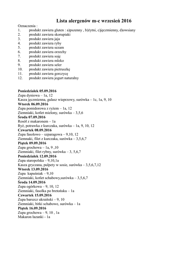 Lista alergenów m-c wrzesień 2016 Oznaczenia : 1. produkt zawiera gluten : a)pszenny , b)żytni, c)jęczmienny, d)owsiany 2. produkt zawiera skorupiaki 3. produkt zawiera jaja 4. produkt zawiera ryby 5. produkt zawiera sezam 6. produkt zawiera orzechy 7. produkt zawiera soję 8. produkt zawiera mleko 9. produkt zawiera seler 10. produkt zawiera pietruszkę 11. produkt zawiera gorczycę 12. produkt zawiera jogurt naturalny Poniedziałek 05.09.2016 Zupa dyniowa – 1a, 12 Kasza jęczmienna, gulasz wieprzowy, surówka – 1c, 1a, 9, 10 Wtorek 06.09.2016 Zupa pomidorowa z ryżem – 1a, 12 Ziemniaki, kotlet mielony, surówka – 3,5,6 Środa 07.09.2016 Rosół z makaronem – 1a Ryż, potrawka z kurczaka, surówka – 1a, 9, 10, 12 Czwartek 08.09.2016 Zupa fasolowo – szparagowa – 9,10, 12 Ziemnaki, filet z kurczaka, surówka – 3,5,6,7 Piątek 09.09.2016 Zupa grochowa – 1a, 9 ,10 Ziemniaki, filet rybny, surówka – 3, 5,6,7 Poniedziałek 12.09.2016 Zupa staropolska – 9,10,1a Kasza gryczana, pulpety w sosie, surówka – 3,5,6,7,12 Wtorek 13.09.2016 Zupa kapuśniak – 9,10 Ziemniaki, kotlet schabowy,surówka – 3,5,6,7 Środa 14.09.2016 Zupa ogórkowa – 9, 10, 12 Ziemniaki, fasolka po bretońsku – 1a Czwartek 15.09.2016 Zupa barszcz ukraiński – 9, 10 Ziemniaki, bitki schabowe, surówka – 1a Piątek 16.09.2016 Zupa grochowa – 9, 10 , 1a Makaron łazanki - 1a Skład potraw z uwzględnieniem art. 44 Rozporządzenia Parlamentu Europejskiego i Rady nr 1169/2011 w sprawie przekazywania konsumentom informacji na temat żywności . Poniedziałek 05.09.2016 Zupa dyniowa – woda, liść laurowy, ziele angielskie, marchew, ziemnaki, dynia, sól, pieprz, jogurt naturalny. Kasza jęczmienna, mięso wieprzowe, seler, pietruszka, marchew, cebula, olej rzepakowy, mąka pszenna, kapusta pekińska. Wtorek 06.09.2016 Zupa pomidorowa z ryżem – woda, liść laurowy,ziele angielskie, sól, pieprz, marchew, pietruszka, seler, koncentrat pomdorowy, mąka pszenna, ryż. Ziemniaki, kotlet mielony , sałata z cebulą– ziemniaki, sól, pieprz, jaja kurze, bułka tarta, olej rzepakowy, sałata, cebula, sos ogrodowy, koper pęczek. Środa 07.09.2016 Rosół z makaronem – woda , seler, pietruszka, marchewka, por, kurczaki świeże, sól, pietruszka pęczek, makaron pszenny nitki. Ryż, potrawka z kurczaka, surówka letnia – woda, ziele angielskie, sól, ryż, mięso drobiowe z kurczaka, marchew, pietruszka, koper świeży, mąka pszenna, śmietana 12%, kapusta biała, marchew, ogórek świeży , olej rzepakowy. Czwartek 08.09.2016 Zupa fasolowo – szparagowa – woda, ziele angielskie, liść laurowy, sól, pieprz prawdziwy, marchew, seler, pietruszka, ziemniaki, fasola cięta żółta, fasola cięta zielona, koper pęczek, śmietana 12 %. Ziemniaki, filet z kurczaka, surówka z pomidora – ziemniaki, woda, sól, filet z kurczaka, jaja kurze, sól, pieprz prawdziwy, bułka tarta, olej rzepakowy, pomidor, cebula, papryka, ocet jabłkowy, cukier Piątek 09.09.2016 Zupa grochowa - woda, liść laurowy, ziele angielskie, sól, pieprz, marchew, seler, pietruszka, ziemnaki, groch , mąka pszenna. Ziemniaki, filet z miruny, surówka z kap. kiszonej- ziemniaki, ryba dorsz, jaja kurze, bulka tarta, sól, kapusta kiszona, cebula, jabłka, olej rzepakowy. Poniedziałek 12.09.2016 Zupa staropolska – woda, liść laurowy, ziele angielskie, sól, pieprz, marchew, seler,pietruszka,ziemniaki,kapusta biała, jogurt naturalny, koper pęczek. Kasza gryczana, pulpety w sosie, surówka meksykańska– kasza gryczana, liść laurowy, mięso wieprzowe, jaja kurze, mąka pszenna, seler, pietruszka, marchew, por, kapusta biała, papryka,szczypiorek. Wtorek 13.09.2016 Zupa kapuśniak – woda, ziele angielskie, liść laurowy, sól, pieprz, seler, pietruszka, marchew, kapusta kiszona. Ziemniaki, kotlet schabowy,surówka – Ziemnaki, mięso wieprzowe, sól, pieprz, bułka tarta, olej rzepakowy, kapusta czerwona, jabłko, papryka, cebula,olej rzepakowy. Środa 14.09.2016 Zupa ogórkowa – woda, liść laurowy,ziele angielskie, sól, pieprz, marchew, seler, pietruszka, ziemnaki, ogórek kiszony, jogurt naturalny. Ziemniaki, fasolka po bretońsku – ziemniaki, sól, woda, kiełbasa, boczek, sól, pieprz,majeranek, groch , koncentrat pomidorowy 30 %, mąka pszenna. Czwartek 15.09.2016 Barszcz ukraiński – woda, liść laurowy, ziele angielskie, sól, pieprz, marchew, seler, pietruszka, buraki czerwone, bób, kapusta biała, koncentrat barszczu czerwonego, ocet. Ziemniaki, bitki schabowe, surówka – ziemniaki, woda , sól, mięso wieprzowe, marchew, por, ziele angielskie, liść laurowy, zioła prowansalskie, mąka pszenna. Piątek 16.09.2016 Zupa grochowa - woda, liść laurowy, ziele angielskie, sól, pieprz, marchew, seler, pietruszka, ziemnaki, groch , mąka pszenna. Makaron łazanki – makaron łazanki, woda, sól, olej rzepakowy, kapusta kiszona, pieczarka, cebula, marchewka.