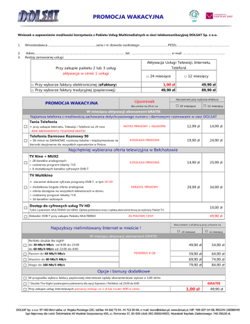 PROMOCJA WAKACYJNA Wniosek o zapewnienie możliwości korzystania z Pakietu Usług Multimedialnych w sieci telekomunikacyjnej DOLSAT Sp. z o.o. 1. Wnioskodawca ..................................................................seria i nr dowodu osobistego ......................................PESEL: ............................................... ………………. 2. 3. Adres……………………………………………………………………………………………….. tel.: ……………………………......………. e-mail: …………………………………………... Rodzaj zamawianej usługi: Aktywacja Usługi Telewizji, Internetu, Telefonii Przy zakupie pakietu 2 lub 3 usług aktywacja w cenie 1 usługi □ 24 miesiące 1,00 zł 49,90 zł □ Przy wyborze faktury elektronicznej (eFaktury) □ Przy wyborze faktury tradycyjnej (papierowej) PROMOCJA WAKACYJNA □ □ 12 miesięcy Upominek dla umów na 24 m-ce 49,90 zł 89,90 zł Abonament przy wyborze eFaktury □ 24 miesiące □ 12 miesięcy W miesiącu aktywacji abonament GRATIS Najtańsza telefonia z możliwością zachowania dotychczasowego numeru i darmowymi rozmowami w sieci DOLSAT Tania Telefonia NOTES FIRMOWY + DŁUGOPIS 12,99 zł 14,99 zł + przy zakupie Internetu, Telewizji i Telefonii na 24 mce - ROK ABONAMENTU TELEFONII GRATIS! □ Telefonia Darmowe Rozmowy 90 + 90 minut na DARMOWE rozmowy lokalne i międzymiastowe na kierunki stacjonarne do wszystkich operatorów w Polsce. 19,90 zł 24,90 zł KOSZULKA FIRMOWA 14,90 zł 25,99 zł PARASOL FIRMOWY 29,99 zł 34,99 zł KOSZULKA FIRMOWA Najchętniej wybierana oferta telewizyjna w Bełchatowie TV Kino + MUX2 kanałów analogowych □ ++ 28 codzienny program lokalny TKB + 8 dodatkowych kanałów cyfrowych DVB-T TV Multikino + starannie dobrane cyfrowe programy DVB-T, w tym 18 HD □ □ + + + + dodatkowa bogata oferta analogowa oferta dostępna na wszystkich telewizorach w domu codzienny program lokalny TKB 16 kanałów radiowych Dostęp do cyfrowych usług TV HD 10,00 zł Tylko z pakietem MULTIKINO lub KINO. Opłata pobierana wraz z opłatą abonamentową za wybrany Pakiet TV. □ Dekoder DVB-T przy zakupie Pakietu MULTIKINO 49,90 zł ZA POŁOWĘ CENY Najszybszy nielimitowany Internet w mieście ! Abonament z eFakturą przy umowie na □ 24 miesiące □ 12 miesięcy W miesiącu aktywacji abonament GRATIS Perfetto double the night* od 8:00 do 23:00 do 60 Mb/4 Mb/s od 23:00 do 8:00 □ do 30 Mb/4 Mb/s □ Passion do 60 Mb/5 Mb/s □ Maestro do 80 Mb/5 Mb/s □ Magic do 100 Mb/5 Mb/s PENDRIVE 8 GB 49,90 zł 54,90 zł 59,90 zł 64,90 zł 69,90 zł 74,90 zł 79,90 zł 84,90 zł Opcje i bonusy dodatkowe □ W przypadku wyboru faktury papierowej internetowe opłaty abonamentowe wyższe o 5,00 zł/mc □ * Double The Night (podwojenie pobierania dla opcji Espresso i Perfetto) od 23:00 do 8:00 □ Przy zakupie usług internetowych pierwszy miesiąc za 1 zł lub router WIFI w cenie: GRATIS 1,00 zł 49,90 zł PROMOCJA WAKACYJNA Abonament przy umow ie Cyfrowe Usługi Interaktywne TV HD □ □ PAKIET DOLSAT HD PLUS > 55 kanałów cyfrowych, w tym 35 jakości HD PAKIET CANAL+ PRESTIGE HD > 8 kanałów cyfrowych w jakości HD Dostęp do Cyfrowych Usług Interaktywnych TV HD za pomocą Terminala HD na 12 miesięcy 49,90 zł UPOMINEK 49,90 zł 50% taniej 10,00 zł Aktywacja i opcje dodatkowe dla Cyfrowych Usług Interaktywnych TV HD □ □ Aktywacja TERMINALA HD (opłata jednorazowa): 49,90 zł Aktywacja dodatkowego TERMINALA HD (opłata jednorazow a): 49,90 zł Dostęp do pakietu MULTIKINO w jakości cyfrowej IPTV □ □ □ Abonament 39,90 zł dla Abonentów nie posiadających usługi analogowej MULTIKINO dla Abonentów posiadających pakiet analogowy MULTIKINO GRATIS 12,00 zł MULTIROOM CYFROWY HD Oferta SuperSzybkiego Internetu i Cyfrowych Usług Interaktw nych TV HD dostępna na obszarach w yposażonych w SuperSieć optyczną. Lokale/domy nie objęte siecią DOLSAT - koszt aktywacji i opłaty abonamentow e w g indywidualnej w yceny. Oferta SuperSzybkiego Internetu i Cyfrow ych Usług Interaktw nych TV HD dostępna na obszarach w yposażonych w SuperSieć optyczną. Lokale/domy nie objęte siecią DOLSAT - koszt aktyw acji i opłaty abonamentow e wg indywidualnej wyceny. 4. 5. 6. 7. 8. 9. Jeśli Abonent nie wypowie Umowy lub nie podejmie renegocjacji na nowych warunkach promocji, po okresie lojalnościowym, określonym w załączniku do umowy, opłata abonamentowa zgodna z Cennikiem Usług Multimedialnych. W przypadku pierwszej Umowy z Abonentem zawieranej na maksymalny okres 24 miesięcy, Umowa wygasa z upływem początkowego okresu obowiązywania, a sygnał usług zostaje wstrzymany chyba, że Abonent podejmie renegocjację na warunkach nowego Regulaminu promocji na kolejne okresy lojalnościowe przed upływem tego okresu. W przypadku, gdy umowa zawierana jest poza lokalem Operatora, Abonent może od niej odstąpić bez podania przyczyny w terminie 14 dni od jej zawarcia składając stosowne oświadczenie w formie pisemnej. W razie odstąpienia od Umowy, jest ona uznana za niezawartą, a Abonent jest zwolniony z wszelkich zobowiązań. Operator zastrzega, iż z Promocji wyłączone są posesje, na których Operator nie posiada infrastruktury telekomunikacyjnej, a ponadto nie spełniające warunków technicznych niezbędnych do świadczenia usług multimedialnych. Wnioskodawca zobowiązuje się do regulowania opłat za zapewnienie dostępu do usług multimedialnych oraz przestrzegania postanowień zawartych w Umowie i Regulaminie Korzystania z Pakietu Usług Multimedialnych oraz Protokole przekazania urządzeń do korzystania z usług poprzez sieć DOLSAT. Uruchomienie wybranego Pakietu nastąpi w terminie do 30 dni od dnia zawarcia Umowy i zostanie potwierdzone podpisanym przez obie strony Protokołem Odbioru. Lokalizacja zakończenia sieciowego .................................................................................................................