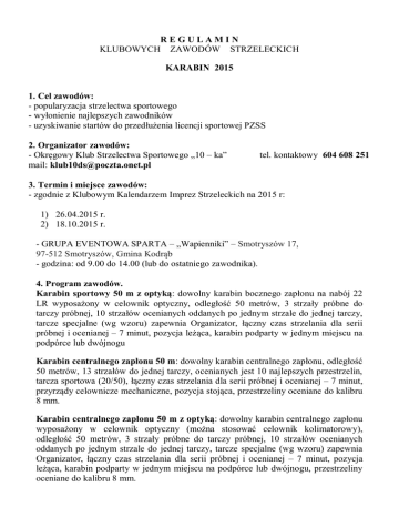 REGULAMIN KLUBOWYCH ZAWODÓW STRZELECKICH KARABIN 2015 1. Cel zawodów: - popularyzacja strzelectwa sportowego - wyłonienie najlepszych zawodników - uzyskiwanie startów do przedłużenia licencji sportowej PZSS 2. Organizator zawodów: - Okręgowy Klub Strzelectwa Sportowego „10 – ka” mail: [email protected] tel. kontaktowy 604 608 251 3. Termin i miejsce zawodów: - zgodnie z Klubowym Kalendarzem Imprez Strzeleckich na 2015 r: 1) 26.04.2015 r. 2) 18.10.2015 r. - GRUPA EVENTOWA SPARTA – „Wapienniki” – Smotryszów 17, 97-512 Smotryszów, Gmina Kodrąb - godzina: od 9.00 do 14.00 (lub do ostatniego zawodnika). 4. Program zawodów. Karabin sportowy 50 m z optyką: dowolny karabin bocznego zapłonu na nabój 22 LR wyposażony w celownik optyczny, odległość 50 metrów, 3 strzały próbne do tarczy próbnej, 10 strzałów ocenianych oddanych po jednym strzale do jednej tarczy, tarcze specjalne (wg wzoru) zapewnia Organizator, łączny czas strzelania dla serii próbnej i ocenianej – 7 minut, pozycja leżąca, karabin podparty w jednym miejscu na podpórce lub dwójnogu Karabin centralnego zapłonu 50 m: dowolny karabin centralnego zapłonu, odległość 50 metrów, 13 strzałów do jednej tarczy, ocenianych jest 10 najlepszych przestrzelin, tarcza sportowa (20/50), łączny czas strzelania dla serii próbnej i ocenianej – 7 minut, przyrządy celownicze mechaniczne, pozycja stojąca, przestrzeliny oceniane do kalibru 8 mm. Karabin centralnego zapłonu 50 m z optyką: dowolny karabin centralnego zapłonu wyposażony w celownik optyczny (można stosować celownik kolimatorowy), odległość 50 metrów, 3 strzały próbne do tarczy próbnej, 10 strzałów ocenianych oddanych po jednym strzale do jednej tarczy, tarcze specjalne (wg wzoru) zapewnia Organizator, łączny czas strzelania dla serii próbnej i ocenianej – 7 minut, pozycja leżąca, karabin podparty w jednym miejscu na podpórce lub dwójnogu, przestrzeliny oceniane do kalibru 8 mm. Strzelba gładkolufowa: dowolna strzelba w kalibrze 12 z ręcznym przeładowaniem bez kolimatora, strzelby półautomatyczne są zabronione. Ilość potrzebnaej amunicji - 5 szt. Przebieg konkurencji. Zajęcie stanowiska strzeleckiego, załadowanie strzelby (magazynka), zgłoszenie gotowości. Zabrania się stosowania szybkoładowaczy. Po sygnale startowym taimera, nie opuszczając wyznaczonego stanowiska należy ostrzelać w ustalonej kolejności 5 poperów powodując koniecznie ich przewrócenie. Kolejność celów (licząc od strony lewej): popper nr 1, nr 5, nr 2, nr 4, nr 3. Punktacja. - każdy przewrócony popper – 5,0 pkt. - każdy popper nieprzewrócony – doliczone 1,25 pkt. straty do sumy punktów. Bezpieczeństwo. Za wykroczenie niestanowiące zagrożenia dla bezpieczeństwa – doliczenie 1,5 pkt. straty (np. niezachowanie kolejności strzelania do celów, opuszczenie stanowiska). Za przekroczenie warunków bezpieczeństwa (niezachowanie bezpiecznych kątów, strzał niekontrolowany, upuszczenie broni lub amunicji) – dyskwalifikacja. Klasyfikacja – zgodnie z wyliczonym współczynnikiem: punkty/czas. 5. Uczestnictwo: - członkowie Okręgowego Klubu Strzelectwa Sportowego „10-ka” posiadający licencję sportową PZSS 6. Klasyfikacja: - klasyfikacja indywidualna w każdej konkurencji 7. Nagrody: - puchary i dyplomy dla 3 najlepszych zawodników w poszczególnych konkurencjach 8. Zgłoszenia: - przed zawodami lub w trakcie zawodów do godz. 12.30 9. Koszty uczestnictwa: - opłata startowa 20,00 zł za konkurencję Karabin sportowy 50 m z optyką - opłata startowa 35,00 zł za konkurencję Karabin centralnego zapłonu 50 m - opłata startowa 35,00 zł za konkurencję Karabin centralnego zapłonu 50 m z optyką - opłata startowa 30,00 zł za konkurencję Strzelba gładkolufowa - opłata startowa 18,00 zł w przypadku strzelania z własnej broni i amunicji 10. Sprawy różne: - każdy zawodnik zobowiązany jest do zapoznania się z niniejszym regulaminem oraz z przepisami bezpieczeństwa obowiązującymi w strzelectwie sportowym – znajomość powyższych przepisów potwierdzana jest podpisem na liście startowej - dla wszystkich konkurencji obowiązuje 5 minutowy czas na przygotowanie do strzelania - obowiązuje stosowanie wskaźników bezpieczeństwa (rozładowania broni) - zawodnicy zobowiązani są do stosowania okularów ochronnych oraz ochronników słuchu - na stanowisku strzeleckim zawodnik powinien posiadać właściwą dla danej konkurencji ilość amunicji - w zawodach zezwala się na kilkakrotny start w każdej konkurencji (tylko w przypadku wystarczającej ilości czasu pozostałego do zakończenia zawodów) – do klasyfikacji zalicza się najwyższy wynik - przygotowanie techniczne i organizacyjne zawodów (strzelań) według ustaleń Organizatora - sędziowie prowadzący zawody oraz inne osoby funkcyjne mogą uczestniczyć w zawodach - w sprawach nieuregulowanych niniejszym regulaminem obowiązują przepisy PZSS - Organizator zastrzega sobie prawo do zmian w niniejszym regulaminie - interpretacja niniejszego regulaminu oraz decydujące zdanie należy do Organizatora Organizator