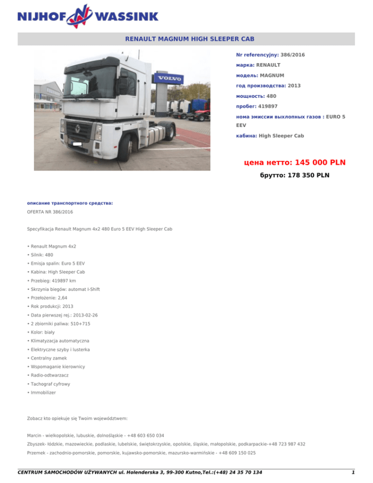 RENAULT MAGNUM HIGH SLEEPER CAB Nr referencyjny: 386/2016 марка: RENAULT модель: MAGNUM год производства: 2013 мощность: 480 пробег: 419897 нома эмиссии выхлопных газов : EURO 5 EEV кабина: High Sleeper Cab цена нетто: 145 000 PLN брутто: 178 350 PLN описание транспортного средства: OFERTA NR 386/2016 Specyfikacja Renault Magnum 4x2 480 Euro 5 EEV High Sleeper Cab • Renault Magnum 4x2 • Silnik: 480 • Emisja spalin: Euro 5 EEV • Kabina: High Sleeper Cab • Przebieg: 419897 km • Skrzynia biegów: automat I-Shift • Przełożenie: 2,64 • Rok produkcji: 2013 • Data pierwszej rej.: 2013-02-26 • 2 zbiorniki paliwa: 510+715 • Kolor: biały • Klimatyzacja automatyczna • Elektryczne szyby i lusterka • Centralny zamek • Wspomaganie kierownicy • Radio-odtwarzacz • Tachograf cyfrowy • Immobilizer Zobacz kto opiekuje się Twoim województwem: Marcin - wielkopolskie, lubuskie, dolnośląskie - +48 603 650 034 Zbyszek- łódzkie, mazowieckie, podlaskie, lubelskie, świętokrzyskie, opolskie, śląskie, małopolskie, podkarpackie-+48 723 987 432 Przemek - zachodnio-pomorskie, pomorskie, kujawsko-pomorskie, mazursko-warmińskie - +48 609 150 025 CENTRUM SAMOCHODÓW UŻYWANYCH ul. Holenderska 3, 99-300 Kutno,Tel.:(+48) 24 35 70 134 1 ZAPRASZAMY Указанные выше данные транспортного средства представлены с благими намерениями. Однако, мы оставляем за собой право на ошибку в технической спецификации или описании технического состояния. Актуальность спецификаций, цены и доступность транспортного средств должна быть подтверждена при непосредственным контакте с нашими сотрудниками. Приглашаем. CENTRUM SAMOCHODÓW UŻYWANYCH ul. Holenderska 3 99-300 Kutno Tel.:(+48) 24 35 70 134 Fax.:(+48) 24 35 70 135 контактные лица: Zbigniew Lachowicz tel. (+48) 723 987 432 е-mail:: [email protected] Marcin Napieralski tel. (+48) 603 650 034 е-mail:: [email protected] CENTRUM SAMOCHODÓW UŻYWANYCH ul. Holenderska 3, 99-300 Kutno,Tel.:(+48) 24 35 70 134 2 CENTRUM SAMOCHODÓW UŻYWANYCH ul. Holenderska 3, 99-300 Kutno,Tel.:(+48) 24 35 70 134 3 CENTRUM SAMOCHODÓW UŻYWANYCH ul. Holenderska 3, 99-300 Kutno,Tel.:(+48) 24 35 70 134 4 CENTRUM SAMOCHODÓW UŻYWANYCH ul. Holenderska 3, 99-300 Kutno,Tel.:(+48) 24 35 70 134 5 http://ciezarowki-uzywane.pl/renault-magnum-high-sleeper-cab-c303.html CENTRUM SAMOCHODÓW UŻYWANYCH ul. Holenderska 3, 99-300 Kutno,Tel.:(+48) 24 35 70 134 6