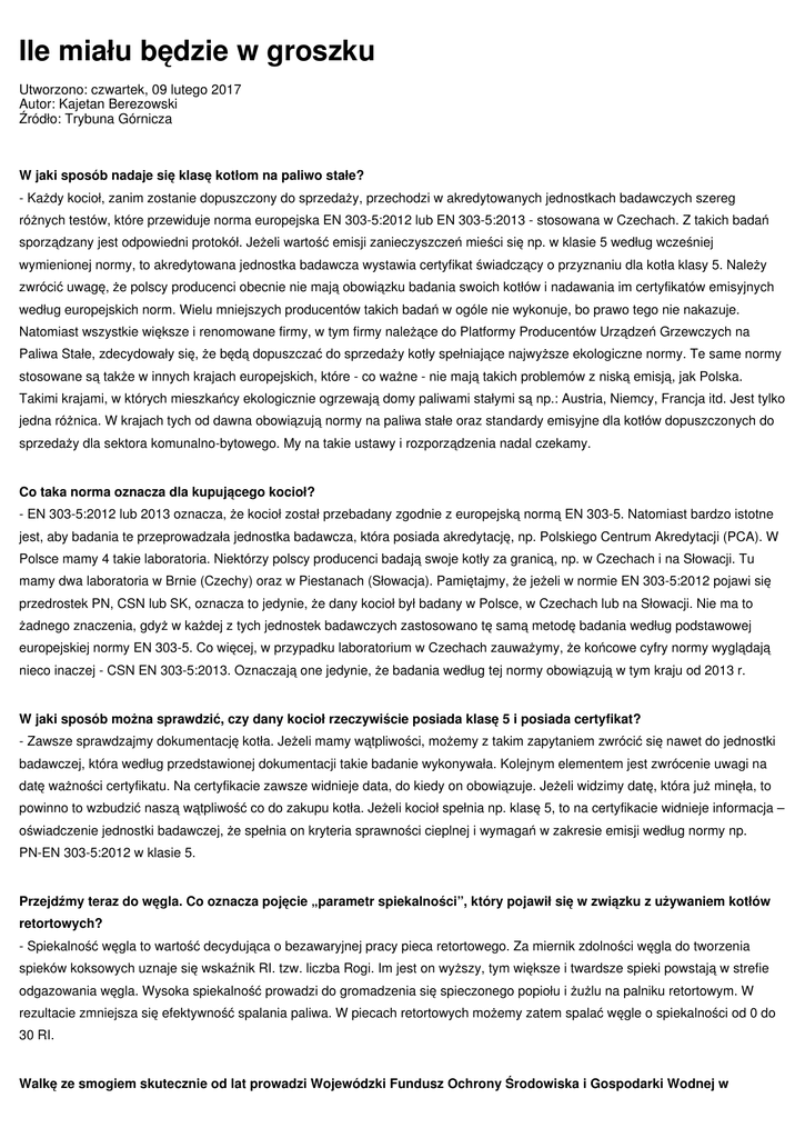 Ile miału będzie w groszku Utworzono: czwartek, 09 lutego 2017 Autor: Kajetan Berezowski Źródło: Trybuna Górnicza W jaki sposób nadaje się klasę kotłom na paliwo stałe? - Każdy kocioł, zanim zostanie dopuszczony do sprzedaży, przechodzi w akredytowanych jednostkach badawczych szereg różnych testów, które przewiduje norma europejska EN 303-5:2012 lub EN 303-5:2013 - stosowana w Czechach. Z takich badań sporządzany jest odpowiedni protokół. Jeżeli wartość emisji zanieczyszczeń mieści się np. w klasie 5 według wcześniej wymienionej normy, to akredytowana jednostka badawcza wystawia certyfikat świadczący o przyznaniu dla kotła klasy 5. Należy zwrócić uwagę, że polscy producenci obecnie nie mają obowiązku badania swoich kotłów i nadawania im certyfikatów emisyjnych według europejskich norm. Wielu mniejszych producentów takich badań w ogóle nie wykonuje, bo prawo tego nie nakazuje. Natomiast wszystkie większe i renomowane firmy, w tym firmy należące do Platformy Producentów Urządzeń Grzewczych na Paliwa Stałe, zdecydowały się, że będą dopuszczać do sprzedaży kotły spełniające najwyższe ekologiczne normy. Te same normy stosowane są także w innych krajach europejskich, które - co ważne - nie mają takich problemów z niską emisją, jak Polska. Takimi krajami, w których mieszkańcy ekologicznie ogrzewają domy paliwami stałymi są np.: Austria, Niemcy, Francja itd. Jest tylko jedna różnica. W krajach tych od dawna obowiązują normy na paliwa stałe oraz standardy emisyjne dla kotłów dopuszczonych do sprzedaży dla sektora komunalno-bytowego. My na takie ustawy i rozporządzenia nadal czekamy. Co taka norma oznacza dla kupującego kocioł? - EN 303-5:2012 lub 2013 oznacza, że kocioł został przebadany zgodnie z europejską normą EN 303-5. Natomiast bardzo istotne jest, aby badania te przeprowadzała jednostka badawcza, która posiada akredytację, np. Polskiego Centrum Akredytacji (PCA). W Polsce mamy 4 takie laboratoria. Niektórzy polscy producenci badają swoje kotły za granicą, np. w Czechach i na Słowacji. Tu mamy dwa laboratoria w Brnie (Czechy) oraz w Piestanach (Słowacja). Pamiętajmy, że jeżeli w normie EN 303-5:2012 pojawi się przedrostek PN, CSN lub SK, oznacza to jedynie, że dany kocioł był badany w Polsce, w Czechach lub na Słowacji. Nie ma to żadnego znaczenia, gdyż w każdej z tych jednostek badawczych zastosowano tę samą metodę badania według podstawowej europejskiej normy EN 303-5. Co więcej, w przypadku laboratorium w Czechach zauważymy, że końcowe cyfry normy wyglądają nieco inaczej - CSN EN 303-5:2013. Oznaczają one jedynie, że badania według tej normy obowiązują w tym kraju od 2013 r. W jaki sposób można sprawdzić, czy dany kocioł rzeczywiście posiada klasę 5 i posiada certyfikat? - Zawsze sprawdzajmy dokumentację kotła. Jeżeli mamy wątpliwości, możemy z takim zapytaniem zwrócić się nawet do jednostki badawczej, która według przedstawionej dokumentacji takie badanie wykonywała. Kolejnym elementem jest zwrócenie uwagi na datę ważności certyfikatu. Na certyfikacie zawsze widnieje data, do kiedy on obowiązuje. Jeżeli widzimy datę, która już minęła, to powinno to wzbudzić naszą wątpliwość co do zakupu kotła. Jeżeli kocioł spełnia np. klasę 5, to na certyfikacie widnieje informacja – oświadczenie jednostki badawczej, że spełnia on kryteria sprawności cieplnej i wymagań w zakresie emisji według normy np. PN-EN 303-5:2012 w klasie 5. Przejdźmy teraz do węgla. Co oznacza pojęcie „parametr spiekalności”, który pojawił się w związku z używaniem kotłów retortowych? - Spiekalność węgla to wartość decydująca o bezawaryjnej pracy pieca retortowego. Za miernik zdolności węgla do tworzenia spieków koksowych uznaje się wskaźnik RI. tzw. liczba Rogi. Im jest on wyższy, tym większe i twardsze spieki powstają w strefie odgazowania węgla. Wysoka spiekalność prowadzi do gromadzenia się spieczonego popiołu i żużlu na palniku retortowym. W rezultacie zmniejsza się efektywność spalania paliwa. W piecach retortowych możemy zatem spalać węgle o spiekalności od 0 do 30 RI. Walkę ze smogiem skutecznie od lat prowadzi Wojewódzki Fundusz Ochrony Środowiska i Gospodarki Wodnej w Katowicach, który jako jedyny dofinansowuje wymianę przestarzałych kotłów węglowych na nowoczesne. Służy do tego Pilotażowy Program Ograniczenia Niskiej Emisji. Podobne rozwiązania znalazły się w projekcie uchwały antysmogowej przygotowanym przez samorząd województwa śląskiego. - Generalnie założenia śląskiej uchwały antysmogowej są jak najbardziej słuszne. Nareszcie dzieje się to, o co walczyliśmy jako PPUGPS od wielu lat. Projekt uchwały jest jednym z wielu elementów „ucywilizowania” ogrzewania paliwami stałymi. Przewiduje ona - w aspekcie ogrzewania paliwami stałymi - użytkowanie tylko i wyłącznie kotłów klasy 5 bez rusztu awaryjnego oraz możliwości jego zamontowania, użytkowanie kotłów, które posiadają certyfikat wydany nie tylko przez polskie, akredytowane jednostki badawcze, ale także te, zagraniczne. Uchwała eliminuje możliwość użytkowania miałów oraz flotokoncentratów węglowych. Najwięcej kontrowersji wzbudził jednak zapis mówiący o uziarnieniu węgla kamiennego oraz ilości w nim tzw. frakcji. Uchwała przewiduje zakaz stosowania paliw stałych produkowanych z węgla kamiennego, w których zawartość frakcji o uziarnieniu mniejszym niż 3 mm jest większa niż 15 proc. My jako PPUGPS zaproponowaliśmy, aby ten zapis zmienić odpowiednio na 4 mm oraz 5 proc. Branża górnicza chciałaby, aby wpisać w uchwale odpowiednio 1mm oraz 20 proc. Zatem mamy sporą rozbieżność. Uważamy, że wprowadzenie kryteriów zaproponowanych przez branżę górniczą spowodowałoby przyzwolenie na użytkowanie węgla o zbyt małym uziarnieniu, które w procesie spalania jest wysokoemis