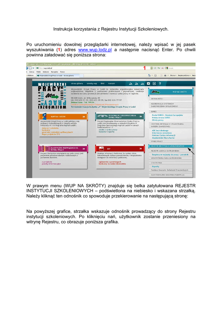 Instrukcja korzystania z Rejestru Instytucji Szkoleniowych. Po uruchomieniu dowolnej przeglądarki internetowej, naleŜy wpisać w jej pasek wyszukiwania (1) adres www.wup.lodz.pl a następnie nacisnąć Enter. Po chwili powinna załadować się poniŜsza strona: 1 W prawym menu (WUP NA SKRÓTY) znajduje się belka zatytułowana REJESTR INSTYTUCJI SZKOLENIOWYCH – podświetlona na niebiesko i wskazana strzałką. NaleŜy kliknąć ten odnośnik co spowoduje przekierowanie na następującą stronę: Na powyŜszej grafice, strzałka wskazuje odnośnik prowadzący do strony Rejestru instytucji szkoleniowych. Po kliknięciu nań, uŜytkownik zostanie przeniesiony na witrynę Rejestru, co obrazuje poniŜsza grafika. Ten sam efekt uzyskamy wpisując w pasek przeglądarki adres: www.ris.praca.gov.pl. Na stronie tej dostępnych jest kilka odnośników pozwalających na poruszanie się po witrynie. UŜytkownika najbardziej będzie interesowała środkowa grafika (wskazana strzałką) a zatytułowana „Rejestr instytucji szkoleniowych”. NaleŜy najechać na nią kursorem i kliknąć. UŜytkownik zostanie przeniesiony do strony pozwalającej na pracę z Rejestrem (poniŜej). PoniŜej przedstawiamy powiększony wycinek powyŜszego ekranu; na Ŝółto podświetlony został rekord (czyli wpis do bazy Rejestru Instytucji Szkoleniowych) na bazie którego przedstawiony jest w niniejszym opracowaniu mechanizm korzystania z bazy. Aby podświetlić dowolny, interesujący uŜytkownika wpis naleŜy najechać nań kursorem i raz nacisnąć lewy przycisk myszy. Dwuklik jest równowaŜny naciśnięciu elementu oznaczonego strzałką – polecenia „Przeglądaj”. Po chwili tło na ekranie zmieni kolor na przezroczystą zieleń a na środku ekranu zostanie wyświetlona tabela zawierająca „Dane instytucji w rejestrze” – tak jak to widać poniŜej: Dostępne są 3 zakładki oznaczone czerwonymi strzałkami. PowyŜsza grafika przedstawia widok zakładki opisanej jako „Ogólne”, zaś poniŜsza zakładki „Siedziba główna i oddziały instytucji szkoleniowej”. Po kliknięciu (w tej ostatniej zakładce) na przycisk „Przeglądaj” – wskazany czarną strzałką – wyświetlone zostaną bardziej szczegółowe informacje dotyczące analizowanego podmiotu (grafika poniŜej). MoŜna teŜ skorzystać z przycisku „Drukuj” – wskazany niebieską strzałką – pozwalający uzyskać drukowaną wersję raportu dotyczącego konkretnej firmy szkoleniowej. Przykładowy raport dołączony został do niniejszej instrukcji – i stanowi załącznik nr 1. Na powyŜszej grafice widocznych jest 8 zakładek umiejscowionych przy lewej krawędzi jaśniejszego okna – Informacje ogólne oraz Działy od 1 do 7. Przycisk Zamknij umiejscowiony w prawym dolnym rogu okna słuŜy do jego zamknięcia. PoniŜej przedstawione zostaną po kolei wszystkie siedem działów – zakładka „Informacje ogólne” znajduje się powyŜej i zawiera dokładne dane teleadresowe instytucji szkoleniowej. Dział 1 to ogólne dane o firmie/ instytucji szkoleniowej dotyczące aspektów organizacyjnych jej funkcjonowania. Dział 2 zawiera informacje dotyczące tematyki prowadzonego kształcenia, realizowanych kursów w danym roku kalendarzowym. Dostępne są tu trzy zakładki (oznaczone czarnymi strzałkami). Niestety, najczęściej te oznaczone numerami 2.2 oraz 2.3 nie są uzupełniane przez instytucje szkoleniowe. W tym oknie dostępne są równieŜ dwa dodatkowe przyciski „Wyszukiwanie” – niebieska strzałka oraz „Zamknij” – czerwona strzałka. Procedura wyszukiwania zawarta została w dalszej części niniejszego opracowania. Zakładka „Tematyka szkoleń” oznaczona numerem 2.1 zawiera informację dotyczące nazwy oferowanych przez daną firmę szkoleń jak równieŜ takie informacje jak liczba godzin szkoleniowych danego kursu, cenę za kurs czy formę zaliczenia. Jednokrotne kliknięcie lewym przyciskiem myszy na interesującym uŜytkownika kursie a następnie naciśniecie przycisku „Przeglądaj” (zielona strzałka) spowoduje wyświetlenie ekranu z bliŜszymi danymi dotyczącymi danego szkolenia – grafika poniŜej. Do zamknięcia tego okna (jak i wielu innych) słuŜy przycisk „Zamknij” – wskazany czerwoną strzałką. Działy 3 – 7 zawierają informacje o zatrudnionej kadrze (Dział 3), bazie lokalowej, wyposaŜeniu jej oraz współpracy z pracodawcami w danym roku kalendarzowym (Dział 4), a takŜe informacje na temat sposobu badania jakości szkoleń prowadzonych przez jednostkę (Dział 5). Działy 6 oraz 7 dotyczą liczby osób przeszkolonych w jednostce w poprzednim roku kalendarzowym oraz liczbę tych osób, którym firma udzieliła bezpłatnego wsparcia. PowyŜsze pięć działów dostępnych jest wyłącznie w trybie przeglądania. WYSZUKIWANIE Strona Rejestru Instytucji Szkoleniowych posiada rozbudowany system wyszukiwania. Aby skorzystać z wyszukiwarki, naleŜy na głównej stronie kliknąć lewym przyciskiem myszy na przycisku „Wyszukiwanie” – oznaczony niebieską strzałką. Nastąpi wówczas wyświetlenie okna dialogowego do obsługi wyszukiwania. PoniŜej prezentujemy powiększenie okna dialogowego wyszukiwania. Zawiera ono 3 zakładki: „Dane instytucji” (1), „Dane oddziału” (2), „Pozostałe” (3). Dostępne są równieŜ przyciski „Wyczyść”, „PokaŜ wszystkie”, „Szukaj” wskazane niebieskimi strzałkami oraz „Anuluj” – strzałką czerwoną Pierwszy z nich usuwa wprowadzone przez szukającego dane; drugi pokazuje całą bazę zaś ostatni pozwala przerwać proces wyszukiwania. 1 2 3 W kaŜdej z przedstawionych powyŜej zakładek moŜna dokonywać wpisów definiujących obszar wyszukiwania. Przykładem jest poniŜsza grafika na której widać zawęŜenie wyszukiwania do podmiotów zarejestrowanych na terenie miasta Łodzi (strzałka niebieska). Po wpisaniu danych naleŜy w celu wyszukania wpisów spełniających załoŜenia kliknąć lewym przycisk
