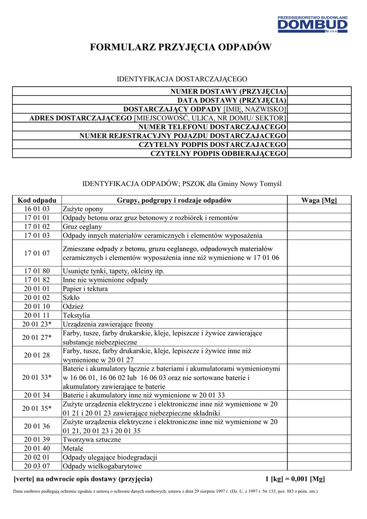 FORMULARZ PRZYJĘCIA ODPADÓW IDENTYFIKACJA DOSTARCZAJĄCEGO NUMER DOSTAWY (PRZYJĘCIA) DATA DOSTAWY (PRZYJĘCIA) DOSTARCZAJĄCY ODPADY [IMIĘ, NAZWISKO] ADRES DOSTARCZAJĄCEGO [MIEJSCOWOŚĆ, ULICA, NR DOMU/ SEKTOR] NUMER TELEFONU DOSTARCZAJACEGO NUMER REJESTRACYJNY POJAZDU DOSTARCZAJACEGO CZYTELNY PODPIS DOSTARCZAJACEGO CZYTELNY PODPIS ODBIERAJĄCEGO IDENTYFIKACJA ODPADÓW; PSZOK dla Gminy Nowy Tomyśl Kod odpadu 16 01 03 17 01 01 17 01 02 17 01 03 17 01 07 17 01 80 17 01 82 20 01 01 20 01 02 20 01 10 20 01 11 20 01 23* 20 01 27* 20 01 28 20 01 33* 20 01 34 20 01 35* 20 01 36 20 01 39 20 01 40 20 02 01 20 03 07 Grupy, podgrupy i rodzaje odpadów ZuŜyte opony Odpady betonu oraz gruz betonowy z rozbiórek i remontów Gruz ceglany Odpady innych materiałów ceramicznych i elementów wyposaŜenia Waga [Mg] Zmieszane odpady z betonu, gruzu ceglanego, odpadowych materiałów ceramicznych i elementów wyposaŜenia inne niŜ wymienione w 17 01 06 Usunięte tynki, tapety, okleiny itp. Inne nie wymienione odpady Papier i tektura Szkło OdzieŜ Tekstylia Urządzenia zawierające freony Farby, tusze, farby drukarskie, kleje, lepiszcze i Ŝywice zawierające substancje niebezpieczne Farby, tusze, farby drukarskie, kleje, lepiszcze i Ŝywice inne niŜ wymienione w 20 01 27 Baterie i akumulatory łącznie z bateriami i akumulatorami wymienionymi w 16 06 01, 16 06 02 lub 16 06 03 oraz nie sortowane baterie i akumulatory zawierające te baterie Baterie i akumulatory inne niŜ wymienione w 20 01 33 ZuŜyte urządzenia elektryczne i elektroniczne inne niŜ wymienione w 20 01 21 i 20 01 23 zawierające niebezpieczne składniki ZuŜyte urządzenia elektryczne i elektroniczne inne niŜ wymienione w 20 01 21, 20 01 23 i 20 01 35 Tworzywa sztuczne Metale Odpady ulegające biodegradacji Odpady wielkogabarytowe [verte] na odwrocie opis dostawy (przyjęcia) 1 [kg] = 0,001 [Mg] Dane osobowe podlegają ochronie zgodnie z ustawą o ochronie danych osobowych; ustawa z dnia 29 sierpnia 1997 r. (Dz. U. z 1997 r. Nr 133, poz. 883 z późn. zm.) Opis dostawy (przyjęcia) odpadów do PSZOK: [NaleŜy opisać np. źródło odpadów, stan odpadów, ilość szt., objętość, sposób określenia wagi itp.]