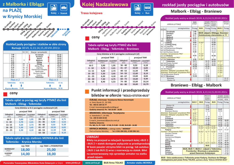 Kolej Nadzalewowa Kolej + Statek 0 8 15 18 20 22 24 28 10.15 Tolkmicko 17.15 Krynica Morska 11.00 Krynica Morska 16.30 Ceny biletów w kl.2 pociągów osobowych [zł] do 5 6 - 10 11- 15 16 - 20 21 - 25 3,00 3,70 4,20 5,30 6,30 przejazd TAM Odległość NORMALNY ULGOWY [ PLN ] [km] [ PLN ] [ PLN ] 1,95 2,41 2,73 3,45 4,10 26 - 30 31 - 35 36 - 40 41 - 47 48 - 53 54 - 59 7,30 8,40 9,50 10,50 11,50 12,60 4,75 5,53 6,18 6,83 7,48 8,19 [ PLN ] rejs TAM rejs TAM i z POWROTEM 18,00 14,00 25,00 18,00 Pomorskie Towarzystwo Miłośników Kolei Żelaznych w Gdyni Br am a ie ń Ka m Za m ek ka lą s bl ąg g Ka od m na ie n Na nica db rz e Su że ch ac Ka z dy To n lk y m ick o Św i ę Fr t om y bo St rk ę Br pień an Br iew an o ie w o 3,00 3,70 4,20 5,30 6,30 7,30 8,40 NORMALNY ULGOWY [ PLN ] [km] [ PLN ] [ PLN ] 1,95 2,41 2,73 3,45 4,10 4,75 5,53 36 - 40 41 - 47 48 - 53 54 - 59 60 - 67 68 - 73 74 - 80 81 - 90 9,50 10,50 11,50 12,60 13,60 14,60 15,60 16,60 6,18 6,83 7,48 8,19 8,84 9,49 10,14 10,79 ELBLĄG, Informacja Turystyczna Ratusz Staromiejski ul. Stary Rynek 25 , 82-300, Tel. +48 55 239 33 77 E-mail: [email protected] Godziny otwarcia: Pn - Nd 10.00 - 18.00 BRANIEWO, Informacja Turystyczna ul. Katedralna 7, 14-500, Tel. +48 55 644 33 03 E-mail:[email protected] Godziny otwarcia: Pn, Wt, Cz, Pt 9.00 - 17.00, Śr 9.00 - 15.00, Sb 8.00 - 14.00 KRYNICA MORSKA, u obsługi statku “ MONIKA” Port w Krynicy Morskiej Tel. 0 501 094 301, 0 509 396 161 UWAGA! Tabela opłat za rejs statkiem MONIKA dla linii Tolkmicko - Krynica Morska NORMALNY [ PLN ] przejazd TAM Odległość Punkt informacji i przedsprzedaży biletów w ofercie “KOLEJ+STSTEK+BUS” Tabela opłat za pociąg wg taryfy PTMKŻ dla linii Malbork - Elbląg - Tolkmicko [ PLN ] El do 5 6 - 10 11- 15 16 - 20 21 - 25 26 - 30 31 - 35 ceny przejazd TAM NORMALNY ULGOWY [km] Tolkmicko [km] Ja Kr M ynic or a sk a przejazd TAM Odległość Rejs nr 5 NORMALNY ULGOWY El b ud z Kw iądz id z Sz yn tu m M al bo rk El bl ą Zd g ró j Gr ek Za m Rejs nr 2 Odległość Tabela opłat wg taryfy PTMKŻ dla linii Malbork - Elbląg - Tolkmicko - Braniewo Ceny biletów w kl.2 pociągów osobowych [zł] 20.32 19.40 19.25 18.48 18.25 18.16 18.07 17.55 17.49 17.46 17.42 17.37 17.30 Grudziądz Kwidzyn Sztum Malbork Elbląg Elbląg Elbląg Zdrój Jagodna Kamiennica Elbląska Nadbrzeże Suchacz Zamek Kadyny Tolkmicko 0 29 37 44 47 49 51 53 57 ceny Stacje i przystanki km km Kolej + Bus Linia F Rozkład jazdy pociągów i statków w obie strony Kursuje 30.VII, 6,13,14,15,20.VIII.2011r. 7.08 7.40 8.17 8.37 9.00 9.05 9.15 9.26 9.31 9.34 9.38 9.43 9.50 Trasa kolejowa rozkład jazdy pociągów i autobusów Malbork - Elbląg - Braniewo Rozkład jazdy ważny w dniach 30.VII, 6,13,14,15,20.VIII.2011r. El bl ąg Ja g Ka od m na ie n Na nica db rz e Su że ch ac Ka z d To yny lk m To ick lk o m ick o Gr Linia F El bl ąs ka ud z Kw iądz id z Sz yn tu m M al bo rk El bl ąg Zd ró j z Malborka i Elbląga na PLAŻĘ w Krynicy Morskiej Bilety na przejazd w relacjach łączonych kolej +BUS 1 i BUS 2 + statek dostępne wyłącznie w przedsprzedaży. W kasie pasażer otrzyma bilet na pociąg lub autobus ( BUS 1 lub BUS 2) wraz z rezerwacją na statek. Bilet na zarezerwowany rejs sprzedaje armator na statku przed rejsem. www.ptmkz.pl www.arriva.pl BUS firma TOLKO Armator statku MONIKA ARRIVA & PTMKŻ pociąg/autobus Pociąg Grudziądz Kwidzyn Sztum Malbork Malbork 0 Elbląg 29 0 Elbląg 37 8 Elbląg Zdrój 44 15 Jagodna 47 18 Kamiennica Elbląska 49 20 Nadbrzeże 51 22 Suchacz Zamek Suchacz “skrzyżowanie PKS” 53 24 Kadyny Kadyny “przystanek PKS” 57 28 Tolkmicko Tolkmicko 64 35 Święty Kamień 69 40 Frombork Frombork 75 46 Stępień Braniewo “Elbląska” przystanek PKS Braniewo “Kościuszki” przystanek PKS 78 49 Braniewo Brama 80 51 Braniewo Braniewo Olsztyn Gł. 7.08 7.40 8.17 8.32 8.37 9.00 9.05 9.15 9.26 9.31 9.34 9.38 | 9.43 | 9.50 10.11 10.22 10.29 10.34 10.45 I I 10.51 10.58 km km 91529 REGIO REGIO 97224 91225 91531 5525 91521 BUS REGIO 97228 Pociąg Pociąg BUS 2 Pociąg BUS odjazd z Elbląga, Dworzec Autobusowy stanowisko nr 11 11.00 * I I I I I 11.24 * 11.38 * | 11.45 * 12.15 12.26 12.33 12.34 12.45 I I 12.51 12.58 13.33 15.29 15.26 15.45 15.50 16.00 16.11 16.16 16.19 16.23 | 16.28 | 16.35 16.35 16.46 16.53 17.21 * I 17.43 * 17.44 * 17.54 * 17.56 * 17.58 * | 18.01 * 18.10 20.07 Braniewo - Elbląg - Malbork Rozkład jazdy ważny w dniach 30.VII, 6,13,14,15,20.VIII.2011r. pociąg/autobus 91528 91532 REGIO REGIO 91228 5532 REGIO 97223 55223 ARRIVA & PTMKŻ BUS 1 BUS Pociąg BUS Pociąg Pociąg 8.55 Olsztyn Gł. 11.00 Braniewo Braniewo 13.57 11.07 9.07 * Braniewo Brama 14.03 11.13 I Braniewo “Kościuszki” przystanek PKS I I 9.09 * Braniewo “Elbląska” przystanek PKS I I 9.11 * Stępień 14.09 11.19 9.21 * Frombork 14.20 11.30 9.31 * Frombork 14.22 11.32 9.32 * Święty Kamień 14.29 11.39 | Tolkmicko 14.39 11.49 9.57 * Tolkmicko 10.30 * 11.55 * 12.50 * 14.40 Kadyny “przystanek PKS” I 10.39 * 12.04 * 12.59 * Kadyny 14.47 I I I Suchacz “skrzyżowanie PKS” I 10.42 * 12.11 * 13.02 * Suchacz Zamek 14.52 I I I Nadbrzeże 14.56 I I I Kamiennica Elbląska 14.59 I I I Jagodna 15.05 I I I Elbląg Zdrój 15.17 | | | Elbląg 11.24 * 12.41 * 13.41 * 15.26 Elbląg 15.36 BUS Malbork 16.05 Malbork BUS, BUS 1 i BUS 2 - odjazd z Tolkmicka, Sztum Fromborka i Braniewa z przystanku Kwidzyn przed Dworcem Kolejowym Grudziądz 16.55 17.02 17.12 17.30 I 17.37 17.42 17.46 17.49 17.55 18.07 18.16 18.25 18.48 19.09 19.25 19.40 20.32 BUS - linia autobusowa z Tolkmicka przez Kadyny, Suchacz do Elbląga obsługiwana jest przez firmę TOLKO, partnera oferty “KOLEJ+STATEK+BUS” 5 MORSKIEJ do FROMBORKA , TOLKMICKA, BRANIEWA, KADYN i ELBLĄGA. Statek + Kolej + Statek Statek + Kolej + Statek Kr M ynic or a sk a km To ick lk o m ick o To l Br an ie w o To lk m To ick lk o m ick o km Fr ick om o bo rk To l km To ick lk o m ick o Fr om bo rk 3. Trasa wycieczki do Braniewa Kr M y