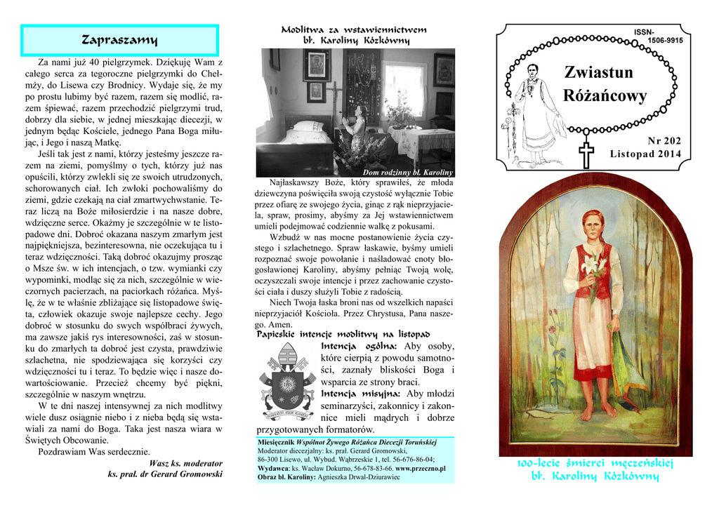 MTceTfmT`l Za nami już 40 pielgrzymek. Dziękuję Wam z całego serca za tegoroczne pielgrzymki do Chełmży, do Lisewa czy Brodnicy. Wydaje się, że my po prostu lubimy być razem, razem się modlić, razem śpiewać, razem przechodzić pielgrzymi trud, dobrzy dla siebie, w jednej mieszkając diecezji, w jednym będąc Kościele, jednego Pana Boga miłując, i Jego i naszą Matkę. Jeśli tak jest z nami, którzy jesteśmy jeszcze razem na ziemi, pomyślmy o tych, którzy już nas opuścili, którzy zwlekli się ze swoich utrudzonych, schorowanych ciał. Ich zwłoki pochowaliśmy do ziemi, gdzie czekają na ciał zmartwychwstanie. Teraz liczą na Boże miłosierdzie i na nasze dobre, wdzięczne serce. Okażmy je szczególnie w te listopadowe dni. Dobroć okazana naszym zmarłym jest najpiękniejsza, bezinteresowna, nie oczekująca tu i teraz wdzięczności. Taką dobroć okazujmy prosząc o Msze św. w ich intencjach, o tzw. wymianki czy wypominki, modląc się za nich, szczególnie w wieczornych pacierzach, na paciorkach różańca. Myślę, że w te właśnie zbliżające się listopadowe święta, człowiek okazuje swoje najlepsze cechy. Jego dobroć w stosunku do swych współbraci żywych, ma zawsze jakiś rys interesowności, zaś w stosunku do zmarłych ta dobroć jest czysta, prawdziwie szlachetna, nie spodziewająca się korzyści czy wdzięczności tu i teraz. To będzie więc i nasze dowartościowanie. Przecież chcemy być piękni, szczególnie w naszym wnętrzu. W te dni naszej intensywnej za nich modlitwy wiele dusz osiągnie niebo i z nieba będą się wstawiali za nami do Boga. Taka jest nasza wiara w Świętych Obcowanie. Pozdrawiam Was serdecznie. Wasz ks. moderator ks. prał. dr Gerard Gromowski @bW_\gjT mT jfgTj\Xaa\VgjX` UÄ! >Teb_\al >Çm^Çjal Dom rodzinny bł. Karoliny Najłaskawszy Boże, który sprawiłeś, że młoda dziewczyna poświęciła swoją czystość wyłącznie Tobie przez ofiarę ze swojego życia, ginąc z rąk nieprzyjaciela, spraw, prosimy, abyśmy za Jej wstawiennictwem umieli podejmować codziennie walkę z pokusami. Wzbudź w nas mocne postanowienie życia czystego i szlachetnego. Spraw łaskawie, byśmy umieli rozpoznać swoje powołanie i naśladować cnoty błogosławionej Karoliny, abyśmy pełniąc Twoją wolę, oczyszczali swoje intencje i przez zachowanie czystości ciała i duszy służyli Tobie z radością. Niech Twoja łaska broni nas od wszelkich napaści nieprzyjaciół Kościoła. Przez Chrystusa, Pana naszego. Amen. CTc\Xf^\X \agXaV]X `bW_\gjl aT _\fgbcTW <agXaV]T bZÇ_aT- Aby osoby, które cierpią z powodu samotności, zaznały bliskości Boga i wsparcia ze strony braci. <agXaV]T `\fl]aT- Aby młodzi seminarzyści, zakonnicy i zakonnice mieli mądrych i dobrze przygotowanych formatorów. Miesięcznik Wspólnot Żywego Różańca Diecezji Toruńskiej Moderator diecezjalny: ks. prał. Gerard Gromowski, 86-300 Lisewo, ul. Wybud. Wąbrzeskie 1, tel. 56-676-86-04; Wydawca: ks. Wacław Dokurno, 56-678-83-66. www.przeczno.pl Obraz bł. Karoliny: Agnieszka Drwal-Dziurawiec $## _XV\X É`\XeV\ `~VmXÅf^\X] UÄ! >Teb_\al >Çm^Çjal