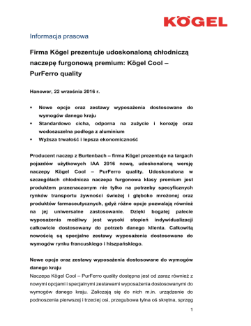 Informacja prasowa Firma Kögel prezentuje udoskonaloną chłodniczą naczepę furgonową premium: Kögel Cool – PurFerro quality Hanower, 22 września 2016 r. Nowe opcje oraz zestawy wyposażenia dostosowane do wymogów danego kraju Standardowo cicha, odporna na zużycie i korozję oraz wodoszczelna podłoga z aluminium Wyższa trwałość i lepsza ekonomiczność Producent naczep z Burtenbach – firma Kögel prezentuje na targach pojazdów użytkowych IAA 2016 nową, udoskonaloną wersję naczepy Kögel Cool – PurFerro quality. Udoskonalona w szczegółach chłodnicza naczepa furgonowa klasy premium jest produktem przeznaczonym nie tylko na potrzeby specyficznych rynków transportu żywności świeżej i głęboko mrożonej oraz produktów farmaceutycznych, gdyż różne opcje pozwalają również na jej uniwersalne wyposażenia możliwy zastosowanie. jest wysoki Dzięki stopień bogatej palecie indywidualizacji całkowicie dostosowany do potrzeb danego klienta. Całkowitą nowością są specjalne zestawy wyposażenia dostosowane do wymogów rynku francuskiego i hiszpańskiego. Nowe opcje oraz zestawy wyposażenia dostosowane do wymogów danego kraju Naczepa Kögel Cool – PurFerro quality dostępna jest od zaraz również z nowymi opcjami i specjalnymi zestawami wyposażenia dostosowanymi do wymogów danego kraju. Zaliczają się do nich m.in. urządzenie do podnoszenia pierwszej i trzeciej osi, przegubowa tylna oś skrętna, sprzęg 1 Informacja prasowa siodłowy o maks. ładowności 15 t, schowek na koło zapasowe typu hiszpańskiego, a na rynek francuski drabinka środkowa oraz wzmocniona rolkowa ochrona przed uderzeniem. Właściwości seryjne Kögel Cool – PurFerro quality Cicha aluminiowa konstrukcja podłogi redukuje poziom hałasu powstającego podczas załadunku i rozładunku. Dzięki zmniejszeniu tej emisji hałasu istnieje możliwość realizacji dostaw poza zwyczajowymi godzinami otwarcia placówek. Lepszą higienę oraz łatwiejsze czyszczenie obszaru podłogi w naczepie chłodniczej typu premium zapewnia zespawana wanna z aluminium.Jej zastosowanie zapobiega ponadto przenikaniu wilgoci do elementów nośnych, co znacznie zwiększa żywotność i ekonomiczność naczepy chłodniczej. Naczepa spełnia oczywiście wymagania HACCP (Hazard Analysis and Critical Control Point) mające na celu ochronę zdrowia konsumentów w zakresie międzynarodowych przewozów artykułów spożywczych wrażliwych na temperaturę. Ponadto nowa naczepa Kögel Cool – PurFerro quality spełnia wymogi ATP-FRC. Portal ze stali nierdzewnej, cechujący się łatwością konserwacji i napraw, w nowej wersji jest wyposażony w łatwą do wymiany, zoptymalizowaną poczwórną uszczelkę drzwiową i łatwo wymienialne aluminiowe zawiasy drzwi. Zabudowa furgonowa z ulepszoną izolacją Nadwozie furgonowe naczepy Kögel Cool – PurFerro quality składa się z wysokiej jakości udoskonalonej pianki specjalnej o doskonałych właściwościach izolacyjnych, całkowicie bezfreonowej. Solidna i łatwa w pielęgnacji warstwa powłokowa paneli ze stali jest poza tym pokryta od zewnątrz twardą folią z PCW. Ściany o grubości 45 lub 60 mm, dach o grubości 85 mm oraz podłoga o grubości 125 mm (produkcja własna) zapewniają znaczne polepszenie współczynnika przenikania ciepła (o 2 Informacja prasowa wartości K). Dzięki tak wysokiej ochronie przed wpływem temperatury zmniejszeniu ulegają zużycie energii oraz koszty. Zabezpieczenie ładunku i zindywidualizowane wyposażenie Dostępne jako opcja, zatopione w piance ścian szyny piętrowe i kotwowe sprawiają, że ich uciążliwy montaż nie jest już konieczny. Pomagają one kierowcy w szybkim i niezawodnym zabezpieczeniu przewożonego ładunku. Przykładowo na każdą z 12 szyn półkowych przypadających na jedną ścianę boczną można przy użyciu odpowiednich nośników palet załadować wzdłużnie maks. 33 europalety. Poza tym pojazd posiada standardowo certyfikat zabezpieczenia ładunku wg DIN EN 12642 kod XL. Dzięki temu nadaje się w szczególności do transportu towarów drobnych i towaru na paletach. Naczepa furgonowa Kögel premium jest oczywiście dostępna również z różnorodnym najróżniejszych wyposażeniem wymagań na indywidualnym, wielu dostosowanym obszarach zastosowań. do W egzemplarzu wystawionym na targach IAA można zobaczyć wiele opcji ochrony przed uderzeniem. Na całym obwodzie metalowej zewnętrznej płyty ramy zamontowano dwie pary osadzonych na sprężynach rolek stalowych o szerokości 150 mm oraz gumowe zderzaki. W celu zapewnienia optymalnej ochrony ściany czołowej oraz parownika i ulepszenia cyrkulacji powietrza model Kögel Cool – PurFerro quality jest wyposażony w opcjonalną ściankę chroniącą przed uderzeniami. Składającą się z pojedynczych profili aluminiowych w kształcie litery V ściankę ochronną łatwo się demontuje, a przy tym zapewnia ona doskonałą ochronę również w trudnych warunkach. Ponadto wystawiony egzemplarz celem stosowania w dwóch rożnych zakresach temperatur wyposażony został w poprzeczną ściankę działową, którą można przesuwać w sposób bezstopniowy oraz składać i rozkładać. Kolejną opcją wystawionego egzemplarza jest wyposażenie RoRo umożliwiające jego transport na statkach i promach. W jego skład wchodzą dwa zawory podciśnieniowe oraz cztery pary zaczepów o 3 Informacja prasowa wysokiej wytrzymałości do mocowania ładunków o masie do 12 000 kg. W skład pozostałego wyposażenia specjalnego wchodzą urządzenie do podnoszenia pierwszej osi, schowek na koło zapasowe typu hiszpańskiego, rejestrator temperatury, aerodynamiczne pokrycie boczne itd. Powłoka KTL: trwała ochrona przed korozją W naczepie Kögel Cool – PurFerro quality cała rama pojazdu jest chroniona przed korozją technologią nanoceramiczną oraz powłoką KTL, pokrytą następnie warstwą lakieru UV. Zdjęcie: Kögel Cool – PurFerro quality i logo Kögel Pu