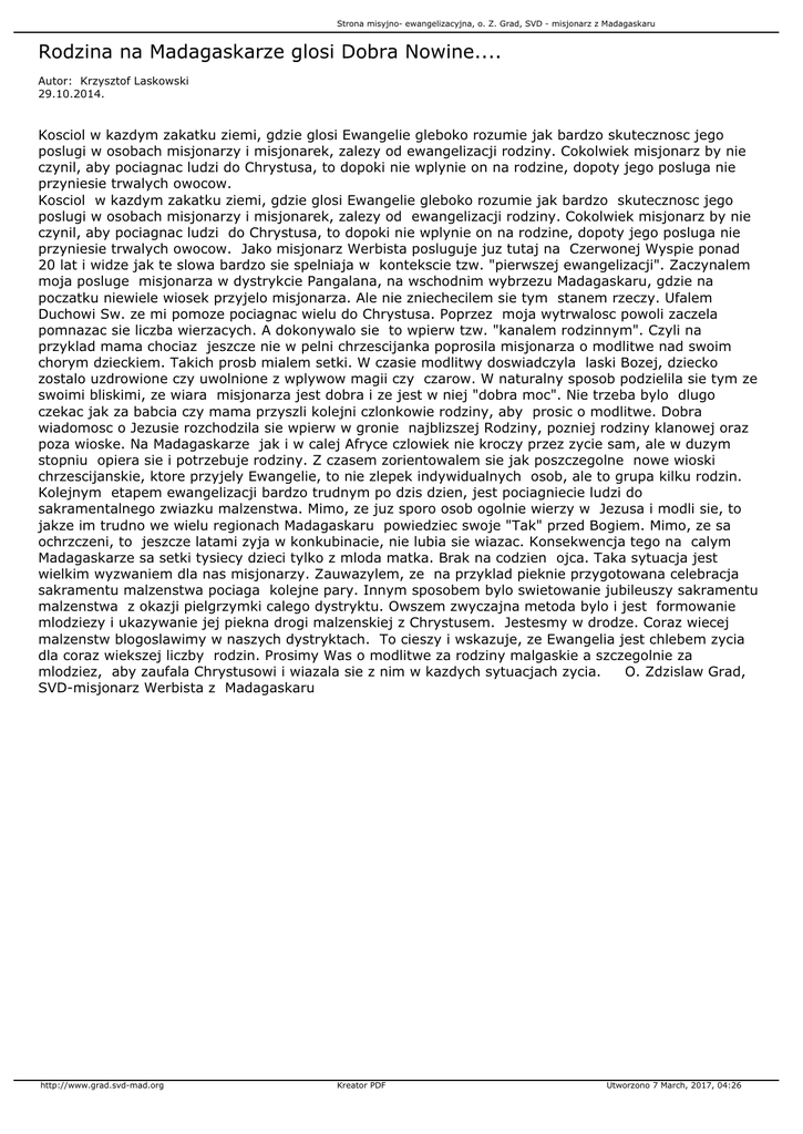 Strona misyjno- ewangelizacyjna, o. Z. Grad, SVD - misjonarz z Madagaskaru Rodzina na Madagaskarze glosi Dobra Nowine.... Autor: Krzysztof Laskowski 29.10.2014. Kosciol w kazdym zakatku ziemi, gdzie glosi Ewangelie gleboko rozumie jak bardzo skutecznosc jego poslugi w osobach misjonarzy i misjonarek, zalezy od ewangelizacji rodziny. Cokolwiek misjonarz by nie czynil, aby pociagnac ludzi do Chrystusa, to dopoki nie wplynie on na rodzine, dopoty jego posluga nie przyniesie trwalych owocow. Kosciol w kazdym zakatku ziemi, gdzie glosi Ewangelie gleboko rozumie jak bardzo skutecznosc jego poslugi w osobach misjonarzy i misjonarek, zalezy od ewangelizacji rodziny. Cokolwiek misjonarz by nie czynil, aby pociagnac ludzi do Chrystusa, to dopoki nie wplynie on na rodzine, dopoty jego posluga nie przyniesie trwalych owocow. Jako misjonarz Werbista posluguje juz tutaj na Czerwonej Wyspie ponad 20 lat i widze jak te slowa bardzo sie spelniaja w kontekscie tzw. "pierwszej ewangelizacji". Zaczynalem moja posluge misjonarza w dystrykcie Pangalana, na wschodnim wybrzezu Madagaskaru, gdzie na poczatku niewiele wiosek przyjelo misjonarza. Ale nie zniechecilem sie tym stanem rzeczy. Ufalem Duchowi Sw. ze mi pomoze pociagnac wielu do Chrystusa. Poprzez moja wytrwalosc powoli zaczela pomnazac sie liczba wierzacych. A dokonywalo sie to wpierw tzw. "kanalem rodzinnym". Czyli na przyklad mama chociaz jeszcze nie w pelni chrzescijanka poprosila misjonarza o modlitwe nad swoim chorym dzieckiem. Takich prosb mialem setki. W czasie modlitwy doswiadczyla laski Bozej, dziecko zostalo uzdrowione czy uwolnione z wplywow magii czy czarow. W naturalny sposob podzielila sie tym ze swoimi bliskimi, ze wiara misjonarza jest dobra i ze jest w niej "dobra moc". Nie trzeba bylo dlugo czekac jak za babcia czy mama przyszli kolejni czlonkowie rodziny, aby prosic o modlitwe. Dobra wiadomosc o Jezusie rozchodzila sie wpierw w gronie najblizszej Rodziny, pozniej rodziny klanowej oraz poza wioske. Na Madagaskarze jak i w calej Afryce czlowiek nie kroczy przez zycie sam, ale w duzym stopniu opiera sie i potrzebuje rodziny. Z czasem zorientowalem sie jak poszczegolne nowe wioski chrzescijanskie, ktore przyjely Ewangelie, to nie zlepek indywidualnych osob, ale to grupa kilku rodzin. Kolejnym etapem ewangelizacji bardzo trudnym po dzis dzien, jest pociagniecie ludzi do sakramentalnego zwiazku malzenstwa. Mimo, ze juz sporo osob ogolnie wierzy w Jezusa i modli sie, to jakze im trudno we wielu regionach Madagaskaru powiedziec swoje "Tak" przed Bogiem. Mimo, ze sa ochrzczeni, to jeszcze latami zyja w konkubinacie, nie lubia sie wiazac. Konsekwencja tego na calym Madagaskarze sa setki tysiecy dzieci tylko z mloda matka. Brak na codzien ojca. Taka sytuacja jest wielkim wyzwaniem dla nas misjonarzy. Zauwazylem, ze na przyklad pieknie przygotowana celebracja sakramentu malzenstwa pociaga kolejne pary. Innym sposobem bylo swietowanie jubileuszy sakramentu malzenstwa z okazji pielgrzymki calego dystryktu. Owszem zwyczajna metoda bylo i jest formowanie mlodziezy i ukazywanie jej piekna drogi malzenskiej z Chrystusem. Jestesmy w drodze. Coraz wiecej malzenstw blogoslawimy w naszych dystryktach. To cieszy i wskazuje, ze Ewangelia jest chlebem zycia dla coraz wiekszej liczby rodzin. Prosimy Was o modlitwe za rodziny malgaskie a szczegolnie za mlodziez, aby zaufala Chrystusowi i wiazala sie z nim w kazdych sytuacjach zycia. O. Zdzislaw Grad, SVD-misjonarz Werbista z Madagaskaru http://www.grad.svd-mad.org Kreator PDF Utworzono 7 March, 2017, 04:26