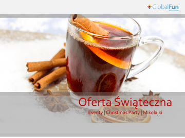 Oferta Świąteczna Eventy | Christmas Party | Mikołajki Oferta Świąteczna Zapraszamy do spędzenia niezwykłego wieczoru rozbrzmiewającego taneczną muzyką, pachnącego choinką, oraz uświetnionego wizytą Tworzymy doświadczony Świętego Mikołaja. zespół ludzi działających skutecznie, kreatywnie i taktownie. Organizujemy i realizujemy Christmas party, imprezy podsumowujące oraz wszelkie spotkania uświetniające koniec roku. Zapraszamy do współpracy firmy, których pracownicy chcą uświetnić ten dzień zabawą, tańcem, wspólnym śpiewem i ciesząc się swoim towarzystwem. Jesteśmy interdyscyplinarną ekipą fachowców z wieloletnim doświadczeniem w branży eventowej oraz wiedząscenografię, z zakresu Publiccatering, Zapewniamy odpowiednią do wydarzenia Relations, Event Marketingu, Nowych Technologii i Biznesu. nastrojowe oświetlenie, muzykę, animatorów i konferansjera dbającego o humor i ciepłą atmosferę. Inspiruje nas tworzenie oraz przeprowadzanie innowacyjnych projektów biznesowych oraz społecznych o wysokiej wartości Z przyjemnością wyślemy propozycję ze szczegółowymi ekonomicznej, estetycznej i etycznej. propozycjami konwencji zabawy, proponowanymi miejscami i scenariuszem zabawy. 2 Mikołajki dla dzieci Mikołajki – w tym dniu Święty Mikołaj rozdaje prezenty i zapowiada nadejście świąt Bożego Narodzenia. Tworzymy doświadczony Pomagamy Mikołajowi zespółprzedsięwzięcia. ludzi działających w organizacji tego skutecznie, kreatywnie i taktownie. Proponujemy wizytę Świętego Mikołaja z prezentami w towarzystwie elfów pomagających mu w prowadzeniu gier i zabaw dla dzieci w różnym wieku. W zakresie usługi oferujemy ozdabianie miejsca imprezy , animatorów fachowców zwarsztaty wieloletnim wykonywania zajęć,Jesteśmy sprzęt interdyscyplinarną do gier i zabaw.ekipą Organizujemy doświadczeniemozdób w branży eventowej oraztańca wiedzą oraz z zakresu Public wiedzy niepowtarzalnych choinkowych, konkursy Relations, Event Marketingu, Nowych Technologii i Biznesu. związanej z uroczystością. Zadbamy o zakupy i świąteczne opakowania zamówionych Inspiruje nas tworzenie orazprezentów. przeprowadzanie innowacyjnych projektów biznesowych oraz społecznych o wysokiej wartości Mikołajkowe spotkania prowadzimy ekonomicznej, estetycznej i etycznej. w różnorodnej konwencji – bajkowej, przygodowej, staropolskiej, tanecznej i wielu innych. 3 Karnawałowe rytmy Karnawał to bale, maskarady, tańce i odrobina szaleństwa. Zapraszamy do spędzenia tego czasu w wyjątkowej scenerii i atmosferze Tworzymy doświadczony beztroskiej zabawy. zespół ludzi działających skutecznie, kreatywnie i taktownie. Najważniejszy jest taniec! To hasło określa myśl przewodnią każdej organizowanej przez nas zabawy karnawałowej. Tańce w parach, pojedyncze i w grupach. Wypróbujemy wszystkie style i mody oraz poznamy ciekawostki związane z tańcem. Jesteśmy interdyscyplinarną ekipą fachowców z wieloletnimkonwencjach Zapewniamy zabawę karnawałową w różnorodnych doświadczeniem w branży eventowej oraz wiedzą z zakresu Public – staropolskiej biesiady, brazylijskiego karnawału, morskiej przygody Relations, Event Marketingu, Nowych Technologii i Biznesu. lub 20-lecia międzywojennego. Inspiruje nas tworzenie oraz przeprowadzanie innowacyjnych Przygotowujemy scenografię i kostiumy odpowiednie do stylu projektów biznesowych oraz społecznych o wysokiej wartości zabawy a wodzirejestetycznej będzie nadawał ekonomicznej, i etycznej.zabawie tempo i gorący nastrój. Zadbamy, by stół zastawiony był potrawami i napojami trafiającymi w różne gusta. Bawmy się razem! 4 Kontakt Zapraszamy do współpracy ! Przyciągnij ! Zaskocz ! Tworzymy doświadczony zespół klientów ludzi działających Zyskaj lojalnych ! skutecznie, kreatywnie i taktownie. GlobalFun Sp. z o.o. ul. Szwoleżerów 3 lok. 3A 00-464 Warszawa Jesteśmy interdyscyplinarną ekipą fachowców z wieloletnim Polska doświadczeniem w branży eventowej oraz wiedzą z zakresu Public Relations, Event Marketingu, Nowych Technologii i Biznesu. + 48 22 498 15 38 + 48 663 330 Inspiruje nas816 tworzenie oraz przeprowadzanie innowacyjnych + 48 663 330 816 projektów biznesowych oraz społecznych o wysokiej wartości ekonomicznej, estetycznej i etycznej. [email protected] www.GlobalFun24.com 5