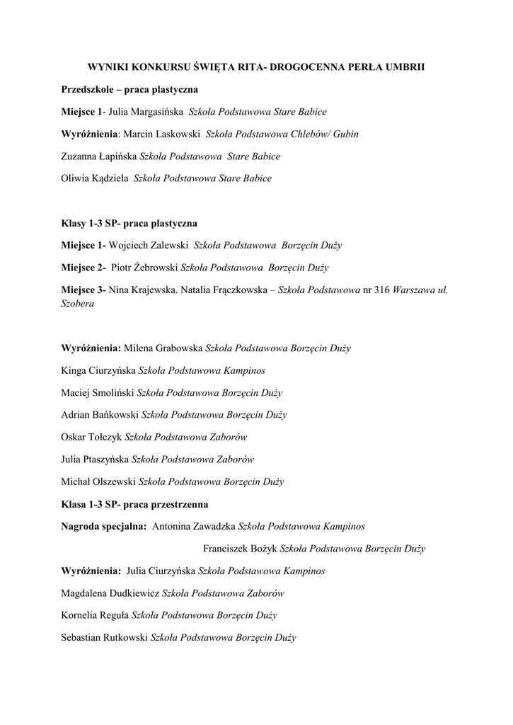 WYNIKI KONKURSU ŚWIĘTA RITA- DROGOCENNA PERŁA UMBRII Przedszkole – praca plastyczna Miejsce 1- Julia Margasińska Szkoła Podstawowa Stare Babice Wyróżnienia: Marcin Laskowski Szkoła Podstawowa Chlebów/ Gubin Zuzanna Łapińska Szkoła Podstawowa Stare Babice Oliwia Kądziela Szkoła Podstawowa Stare Babice Klasy 1-3 SP- praca plastyczna Miejsce 1- Wojciech Zalewski Szkoła Podstawowa Borzęcin Duży Miejsce 2- Piotr Żebrowski Szkoła Podstawowa Borzęcin Duży Miejsce 3- Nina Krajewska. Natalia Frączkowska – Szkoła Podstawowa nr 316 Warszawa ul. Szobera Wyróżnienia: Milena Grabowska Szkoła Podstawowa Borzęcin Duży Kinga Ciurzyńska Szkoła Podstawowa Kampinos Maciej Smoliński Szkoła Podstawowa Borzęcin Duży Adrian Bańkowski Szkoła Podstawowa Borzęcin Duży Oskar Tołczyk Szkoła Podstawowa Zaborów Julia Ptaszyńska Szkoła Podstawowa Zaborów Michał Olszewski Szkoła Podstawowa Borzęcin Duży Klasa 1-3 SP- praca przestrzenna Nagroda specjalna: Antonina Zawadzka Szkoła Podstawowa Kampinos Franciszek Bożyk Szkoła Podstawowa Borzęcin Duży Wyróżnienia: Julia Ciurzyńska Szkoła Podstawowa Kampinos Magdalena Dudkiewicz Szkoła Podstawowa Zaborów Kornelia Reguła Szkoła Podstawowa Borzęcin Duży Sebastian Rutkowski Szkoła Podstawowa Borzęcin Duży 1-3 SP- praca literacka Wyróżnienie: Martyna Sztychmiler Szkoła Podstawowa Stare Babice Klasa 4-6- praca plastyczna Miejsce 1- Kamil Olczak Szkoła Podstawowa Tarczyn Miejsce 2- Michalina Gąsińska Szkoła Podstawowa Borzęcin Duży Miejsce 3- Jan Bargieł Szkoła Podstawowa Zaborów Kinga Orzechowska Szkoła Podstawowa Kampinos Wyróżnienia: Beata Frątczak Szkoła Podstawowa Borzęcin Duży Krzysztof Olszewski Szkoła Podstawowa Borzęcin Duży Kamil Dębski Szkoła Podstawowa Tarczyn Weronika Stępień Szkoła Podstawowa Kampinos Kamila Woźniak Szkoła Podstawowa Kampinos Klaudia Grzywińska Szkoła Podstawowa Kampinos Klasa 4-6 praca przestrzenna Miejsce 1- Wiktoria Rutkowska Szkoła Podstawowa Borzęcin Duży Wyróżnienie: Wiktor Albinowski Szkoła Podstawowa Tarczyn 4-6 SP- praca literacka Miejsca 1 nie przyznano Miejsce 2- Ewelina Zawadzka Szkoła Podstawowa Tarczyn Miejsce 3- Daria Mielczarek Szkoła Podstawowa Zaborów Gimnazjum- praca plastyczna Miejsce 1- Monika Majcher Gimnazjum Zaborów Dorota Cieślak Gimnazjum Zaborów Miejsce 2- Nicole Kurdziel Gimnazjum Nowy Sącz Miejsce 3- Mateusz Czerniawski Gimnazjum Zaborów Wyróżnienie: Anna Jarzębak Gimnazjum Nowy Sącz Gimnazjum- praca przestrzenna Miejsce 1- Estera Gieglis Gimnazjum Zaborów Gimnazjum- praca literacka Miejsca 1 nie przyznano Miejsce 2- Olga Papaj- Gimnazjum Nowy Sącz Miejsce 3- Natalia Dawid Gimnazjum Koczargi Nowe