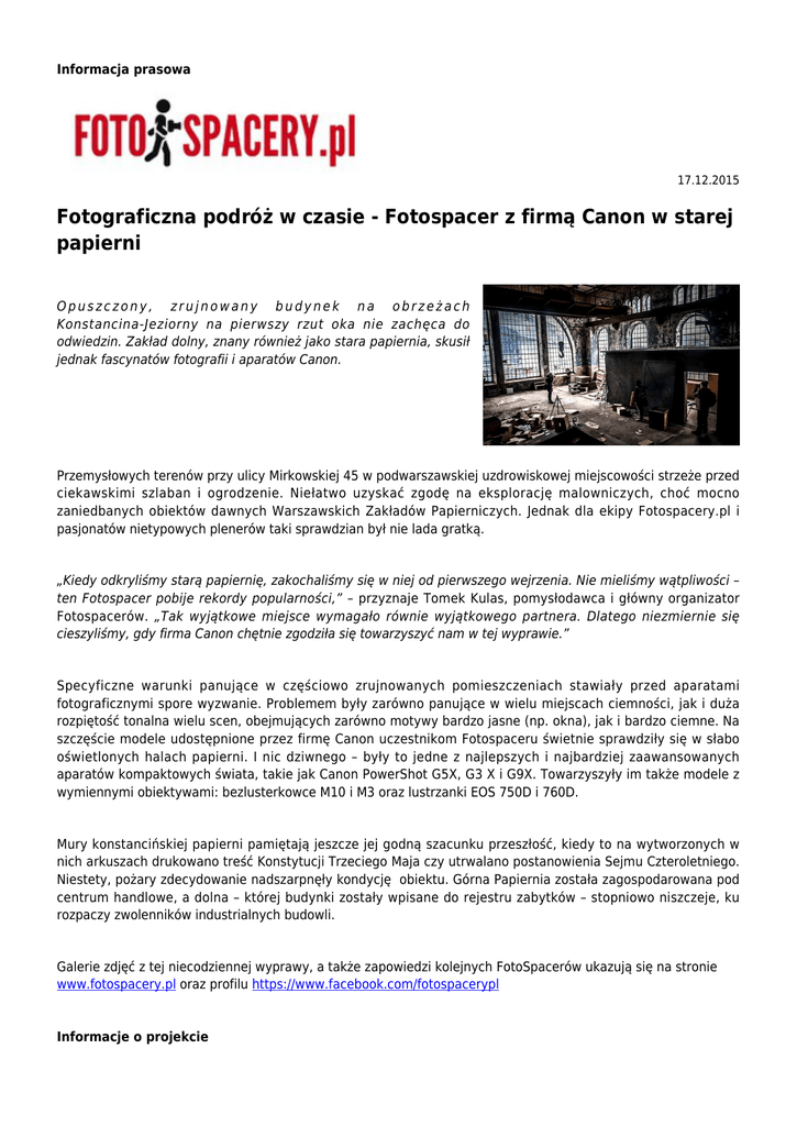 Informacja prasowa 17.12.2015 Fotograficzna podróż w czasie - Fotospacer z firmą Canon w starej papierni Opuszczony, zrujnowany budynek na obrzeżach Konstancina-Jeziorny na pierwszy rzut oka nie zachęca do odwiedzin. Zakład dolny, znany również jako stara papiernia, skusił jednak fascynatów fotografii i aparatów Canon. Przemysłowych terenów przy ulicy Mirkowskiej 45 w podwarszawskiej uzdrowiskowej miejscowości strzeże przed ciekawskimi szlaban i ogrodzenie. Niełatwo uzyskać zgodę na eksplorację malowniczych, choć mocno zaniedbanych obiektów dawnych Warszawskich Zakładów Papierniczych. Jednak dla ekipy Fotospacery.pl i pasjonatów nietypowych plenerów taki sprawdzian był nie lada gratką. „Kiedy odkryliśmy starą papiernię, zakochaliśmy się w niej od pierwszego wejrzenia. Nie mieliśmy wątpliwości – ten Fotospacer pobije rekordy popularności,” – przyznaje Tomek Kulas, pomysłodawca i główny organizator Fotospacerów. „Tak wyjątkowe miejsce wymagało równie wyjątkowego partnera. Dlatego niezmiernie się cieszyliśmy, gdy firma Canon chętnie zgodziła się towarzyszyć nam w tej wyprawie.” Specyficzne warunki panujące w częściowo zrujnowanych pomieszczeniach stawiały przed aparatami fotograficznymi spore wyzwanie. Problemem były zarówno panujące w wielu miejscach ciemności, jak i duża rozpiętość tonalna wielu scen, obejmujących zarówno motywy bardzo jasne (np. okna), jak i bardzo ciemne. Na szczęście modele udostępnione przez firmę Canon uczestnikom Fotospaceru świetnie sprawdziły się w słabo oświetlonych halach papierni. I nic dziwnego – były to jedne z najlepszych i najbardziej zaawansowanych aparatów kompaktowych świata, takie jak Canon PowerShot G5X, G3 X i G9X. Towarzyszyły im także modele z wymiennymi obiektywami: bezlusterkowce M10 i M3 oraz lustrzanki EOS 750D i 760D. Mury konstancińskiej papierni pamiętają jeszcze jej godną szacunku przeszłość, kiedy to na wytworzonych w nich arkuszach drukowano treść Konstytucji Trzeciego Maja czy utrwalano postanowienia Sejmu Czteroletniego. Niestety, pożary zdecydowanie nadszarpnęły kondycję obiektu. Górna Papiernia została zagospodarowana pod centrum handlowe, a dolna – której budynki zostały wpisane do rejestru zabytków – stopniowo niszczeje, ku rozpaczy zwolenników industrialnych budowli. Galerie zdjęć z tej niecodziennej wyprawy, a także zapowiedzi kolejnych FotoSpacerów ukazują się na stronie www.fotospacery.pl oraz profilu https://www.facebook.com/fotospacerypl Informacje o projekcie To wspólne dzieło grupy zapaleńców – miłośników zwiedzania i pasjonatów fotografii. W ramach Fotospacerów i innych kreowanych przez nas wydarzeń przekazujemy zarówno wiedzę o oglądanych miejscach i zabytkach, jak i uczymy konkretnych technik fotograficznych. Przede wszystkim jednak dzielimy się naszą pasją do fotografowania i spacerowania z aparatem w dłoniach!