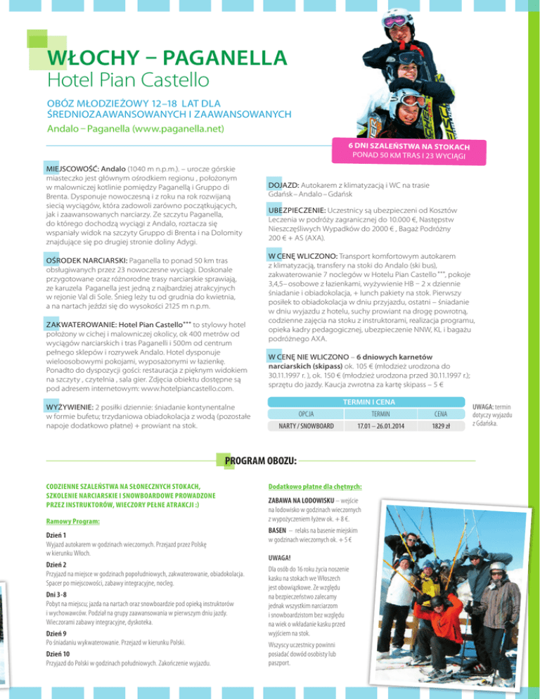 WŁOCHY – PAGANELLA Hotel Pian Castello OBÓZ MŁODZIEŻOWY 12 –18 LAT DLA ŚREDNIOZAAWANSOWANYCH I ZAAWANSOWANYCH Andalo – Paganella (www.paganella.net) 6 DNI SZALEŃSTWA NA STOKACH PONAD 50 KM TRAS I 23 WYCIĄGI MIEJSCOWOŚĆ: Andalo (1040 m n.p.m.). – urocze górskie miasteczko jest głównym ośrodkiem regionu , położonym w malowniczej kotlinie pomiędzy Paganellą i Gruppo di Brenta. Dysponuje nowoczesną i z roku na rok rozwijaną siecią wyciągów, która zadowoli zarówno początkujących, jak i zaawansowanych narciarzy. Ze szczytu Paganella, do którego dochodzą wyciągi z Andalo, roztacza się wspaniały widok na szczyty Gruppo di Brenta i na Dolomity znajdujące się po drugiej stronie doliny Adygi. OŚRODEK NARCIARSKI: Paganella to ponad 50 km tras obsługiwanych przez 23 nowoczesne wyciągi. Doskonale przygotowane oraz różnorodne trasy narciarskie sprawiają, ze karuzela Paganella jest jedną z najbardziej atrakcyjnych w rejonie Val di Sole. Śnieg leży tu od grudnia do kwietnia, a na nartach jeździ się do wysokości 2125 m n.p.m. ZAKWATEROWANIE: Hotel Pian Castello *** to stylowy hotel położony w cichej i malowniczej okolicy, ok 400 metrów od wyciągów narciarskich i tras Paganelli i 500m od centrum pełnego sklepów i rozrywek Andalo. Hotel dysponuje wieloosobowymi pokojami, wyposażonymi w łazienkę. Ponadto do dyspozycji gości: restauracja z pięknym widokiem na szczyty , czytelnia , sala gier. Zdjęcia obiektu dostępne są pod adresem internetowym: www.hotelpiancastello.com. WYŻYWIENIE: 2 posiłki dziennie: śniadanie kontynentalne w formie bufetu; trzydaniowa obiadokolacja z wodą (pozostałe napoje dodatkowo płatne) + prowiant na stok. DOJAZD: Autokarem z klimatyzacją i WC na trasie Gdańsk – Andalo – Gdańsk UBEZPIECZENIE: Uczestnicy są ubezpieczeni od Kosztów Leczenia w podróży zagranicznej do 10.000 €, Następstw Nieszczęśliwych Wypadków do 2000 € , Bagaż Podróżny 200 € + AS (AXA). W CENĘ WLICZONO: Transport komfortowym autokarem z klimatyzacją, transfery na stoki do Andalo (ski bus), zakwaterowanie 7 noclegów w Hotelu Pian Castello ***, pokoje 3,4,5– osobowe z łazienkami, wyżywienie HB – 2 x dziennie śniadanie i obiadokolacja, + lunch pakiety na stok. Pierwszy posiłek to obiadokolacja w dniu przyjazdu, ostatni – śniadanie w dniu wyjazdu z hotelu, suchy prowiant na drogę powrotną, codzienne zajęcia na stoku z instruktorami, realizacja programu, opieka kadry pedagogicznej, ubezpieczenie NNW, KL i bagażu podróżnego AXA. W CENĘ NIE WLICZONO – 6 dniowych karnetów narciarskich (skipass) ok. 105 € (młodzież urodzona do 30.11.1997 r. ), ok. 150 € (młodzież urodzona przed 30.11.1997 r.); sprzętu do jazdy. Kaucja zwrotna za kartę skipass – 5 € TERMIN I CENA OPCJA TERMIN CENA NARTY / SNOWBOARD 17.01 – 26.01.2014 1829 zł PROGRAM OBOZU: CODZIENNE SZALEŃSTWA NA SŁONECZNYCH STOKACH, SZKOLENIE NARCIARSKIE I SNOWBOARDOWE PROWADZONE PRZEZ INSTRUKTORÓW, WIECZORY PEŁNE ATRAKCJI :) Ramowy Program: Dzień 1 Wyjazd autokarem w godzinach wieczornych. Przejazd przez Polskę w kierunku Włoch. Dzień 2 Przyjazd na miejsce w godzinach popołudniowych, zakwaterowanie, obiadokolacja. Spacer po miejscowości, zabawy integracyjne, nocleg. Dni 3 - 8 Pobyt na miejscu; jazda na nartach oraz snowboardzie pod opieką instruktorów i wychowawców. Podział na grupy zaawansowania w pierwszym dniu jazdy. Wieczorami zabawy integracyjne, dyskoteka. Dzień 9 Po śniadaniu wykwaterowanie. Przejazd w kierunku Polski. Dzień 10 Przyjazd do Polski w godzinach południowych. Zakończenie wyjazdu. Dodatkowo płatne dla chętnych: ZABAWA NA LODOWISKU – wejście na lodowisko w godzinach wieczornych z wypożyczeniem łyżew ok. + 8 €. BASEN – relaks na basenie miejskim w godzinach wieczornych ok. + 5 € UWAGA! Dla osób do 16 roku życia noszenie kasku na stokach we Włoszech jest obowiązkowe. Ze względu na bezpieczeństwo zalecamy jednak wszystkim narciarzom i snowboardzistom bez względu na wiek o wkładanie kasku przed wyjściem na stok. Wszyscy uczestnicy powinni posiadać dowód osobisty lub paszport. UWAGA: termin dotyczy wyjazdu z Gdańska.
