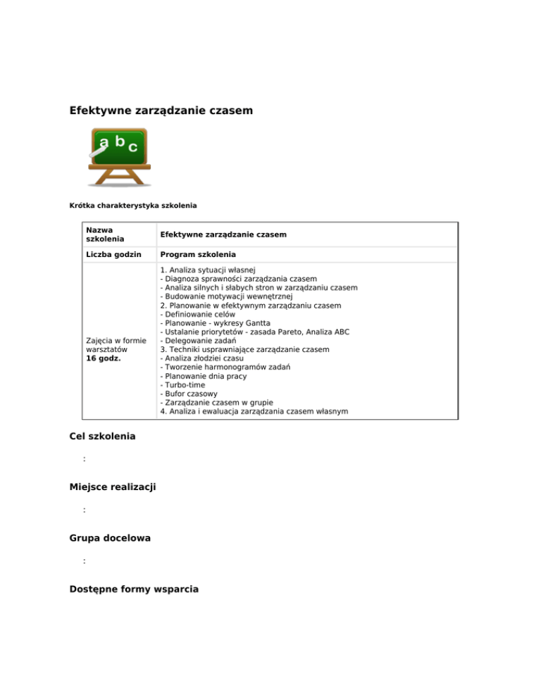 Efektywne zarządzanie czasem Krótka charakterystyka szkolenia Nazwa szkolenia Efektywne zarządzanie czasem Liczba godzin Program szkolenia Zajęcia w formie warsztatów 16 godz. 1. Analiza sytuacji własnej - Diagnoza sprawności zarządzania czasem - Analiza silnych i słabych stron w zarządzaniu czasem - Budowanie motywacji wewnętrznej 2. Planowanie w efektywnym zarządzaniu czasem - Definiowanie celów - Planowanie - wykresy Gantta - Ustalanie priorytetów - zasada Pareto, Analiza ABC - Delegowanie zadań 3. Techniki usprawniające zarządzanie czasem - Analiza złodziei czasu - Tworzenie harmonogramów zadań - Planowanie dnia pracy - Turbo-time - Bufor czasowy - Zarządzanie czasem w grupie 4. Analiza i ewaluacja zarządzania czasem własnym Cel szkolenia : Miejsce realizacji : Grupa docelowa : Dostępne formy wsparcia :