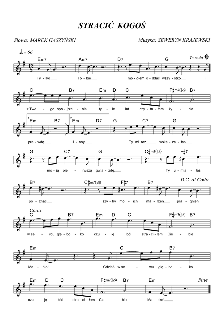 STRACIĆ KOGOŚ Muzyka: SEWERYN KRAJEWSKI Słowa: MAREK GASZYŃSKI E m7 Ty - lko C z Twe 1 - go spo - jrze 2 nia ty B7 Em G mo - ją pie - rwszą w se Em Ma - - czu - ko czu ję - ból ję ból stra - ci - łem m75 B 7 Cie ma - rzeń F stra - ci - łem C - bie - rcu Em łaś pra - gnień m75 B 7 F Cie głę - bo Ma - tko! - D.C. al Coda - bie B 7 C u - mia B7 D Gdzieś w se C cia wska - za - łaś Ty - ich Em tko! - C C - ży m75 F 7 szy - fry mo czy - ta - łem m75 F 7 rcu głę - bo E m D lat gwia - zdę. B7 le G G po - znać Coda C C Ty mi raz C7 F m7 5 B 7 D i C7 G D7 i - nny. B 7 - Em pra - wdę. - mo - głem o - ddać wszy - stko Em To coda D7 To - bie B7 G A m7 - ko Fine