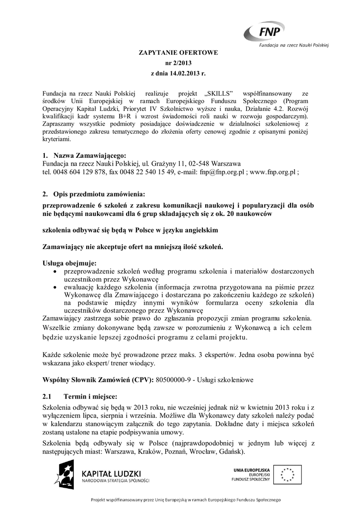 ZAPYTANIE OFERTOWE nr 2/2013 z dnia 14.02.2013 r. Fundacja na rzecz Nauki Polskiej realizuje projekt „SKILLS” współfinansowany ze środków Unii Europejskiej w ramach Europejskiego Funduszu Społecznego (Program Operacyjny Kapitał Ludzki, Priorytet IV Szkolnictwo wyższe i nauka, Działanie 4.2. Rozwój kwalifikacji kadr systemu B+R i wzrost świadomości roli nauki w rozwoju gospodarczym). Zapraszamy wszystkie podmioty posiadające doświadczenie w działalności szkoleniowej z przedstawionego zakresu tematycznego do złożenia oferty cenowej zgodnie z opisanymi poniżej kryteriami. 1. Nazwa Zamawiającego: Fundacja na rzecz Nauki Polskiej, ul. Grażyny 11, 02-548 Warszawa tel. 0048 604 129 878, fax 0048 22 540 15 49, e-mail: [email protected] ; www.fnp.org.pl ; 2. Opis przedmiotu zamówienia: przeprowadzenie 6 szkoleń z zakresu komunikacji naukowej i popularyzacji dla osób nie będącymi naukowcami dla 6 grup składających się z ok. 20 naukowców szkolenia odbywać się będą w Polsce w języku angielskim Zamawiający nie akceptuje ofert na mniejszą ilość szkoleń. Usługa obejmuje: przeprowadzenie szkoleń według programu szkolenia i materiałów dostarczonych uczestnikom przez Wykonawcę ewaluację każdego szkolenia (informacja zwrotna przygotowana na piśmie przez Wykonawcę dla Zmawiającego i dostarczana po zakończeniu każdego ze szkoleń) na podstawie między innymi wyników formularza oceny szkolenia dla uczestników dostarczonego przez Wykonawcę Zamawiający zastrzega sobie prawo do zgłaszania propozycji zmian programu szkolenia. Wszelkie zmiany dokonywane będą zawsze w porozumieniu z Wykonawcą a ich celem będzie uzyskanie lepszej zgodności programu z celami projektu. Każde szkolenie może być prowadzone przez maks. 3 ekspertów. Jedna osoba powinna być wskazana jako ekspert/ trener wiodący. Wspólny Słownik Zamówień (CPV): 80500000-9 - Usługi szkoleniowe 2.1 Termin i miejsce: Szkolenia odbywać się będą w 2013 roku, nie wcześniej jednak niż w kwietniu 2013 roku i z wyłączeniem lipca, sierpnia i września. Możliwe dla Wykonawcy daty szkoleń należy podać w kalendarzu stanowiącym załącznik do tego zapytania. Dokładne daty i miejsca szkoleń zostaną ustalone na etapie podpisywania umowy. Szkolenia będą odbywały się w Polsce (najprawdopodobniej w jednym lub więcej z następujących miast: Warszawa, Kraków, Poznań, Wrocław, Gdańsk). 2.2 Czas trwania: Program szkolenia powinien obejmować co najmniej 16 godzin szkoleniowych (z wyłączeniem przerw kawowych i przerw na posiłki); godzina szkoleniowa = 45 minut. W miarę możliwości szkolenia powinny być zaplanowane w następujących po sobie dniach, włącznie z sobotą lub z przerwą co najwyżej jednego dnia lub weekend pomiędzy szkoleniami. 2.3 Uczestnicy: Uczestnicy projektu SKILLS, w tym przede wszystkim naukowcy ze stopnie doktora lub doktoranci, będący laureatami i stypendystami Fundacji na rzecz Nauki Polskiej, pracujący w jednostkach naukowych mających siedzibę na terenie Polski. Ok. 120 uczestników podzielonych na 6 grup po około 20 osób. 2.4 Temat szkolenia: Komunikacja naukowa i popularyzacji dla osób nie będącymi naukowcami Szkolenie powinno koncentrować się na wiedzy i umiejętnościach potrzebnych, aby każdy uczestnik umiał, przed publicznością nie będącą naukowcami, krótko zaprezentować pomysł na projekt lub badania. Celem szkolenia jest nabycie przez uczestników umiejętności tworzenia struktury i treści prezentacji ustnych, które mają na celu przyciągnąć uwagę odbiorców. 3. Zawartość oferty: wypełniony Formularz Oferty (załącznik nr 1) wraz ze wszystkimi wymaganymi dokumentami wypełniony kalendarz z zaznaczonymi terminami, w których możliwe będzie dla Oferenta przeprowadzenie szkoleń (załącznik nr 2) Oferty należy składać w języku angielskim lub polskim. Dopuszcza się składanie skanów wymaganych dokumentów, które są w innych językach, ale Zamawiający zastrzega sobie prawo do wymagania tłumaczenia. Oferty niekompletne nie będą rozpatrywane. Podana cena jest ceną końcową, żadne podatki ani opłaty nie mogą być naliczane po złożeniu oferty. Cena musi zawierać honoraria wszystkich zaangażowanych trenerów. 4. Zamawiający zapewnia: 4.1 Trenerom, którzy nie zamieszkują na stałe w Polsce: Podróż w obie strony (bilet w klasie ekonomicznej lub refundacja do ustalonego limitu*) z lotniska położonego najbliższej miejsca zamieszkania trenera do lotniska położonego najbliższej miejsca szkolenia w Polsce; (refundacja nie obejmuje podróży wewnątrz kraju wylotu/wyjazdu; możliwe jest zastąpienie przelotu przejazdem koleją lub autobusem; szczegółowe warunki zostaną ustalone w umowie między Zamawiającym a Oferentem) * limit jest równy cenie biletu w obie strony (w dniach odpowiadających terminowi szkolenia) podawanej przez biuro podróży współpracujące z Zamawiającym Transport z lotniska/ dworca w Polsce do hotelu (miejsca szkolenia) i z powrotem tylko w przypadku, gdy miejsce szkolenia znajduje się poza miastem przylotu/ przyjazdu (jeśli w jego granicach Zamawiający nie zapewnia transportu; Oferent może zawrzeć koszty dojazdu w cenie oferty); Zakwaterowanie podczas szkoleń wraz z noclegami przed i po każdym ze szkoleń; Posiłki tylko podczas szkolenia. 4.2 Trenerom, którzy zamieszkują na stałe w Polsce: Transport z lotniska/ dworca z miasta najbliższego do hotelu (miejsca szkolenia) i z powrotem tylko w przypadku, gdy znajduje się on poza miastem przylotu/ przyjazdu (jeśli w jego granicach Zamawiający nie zapewnia transportu, Oferent może zawrzeć koszty dojazdu w cenie oferty); Zakwaterowanie podczas szkoleń wraz z noclegami przed i po każdym ze szkoleń, jeśli trener na stałe zamieszkuje poza miastem/miejscem, gdzie odbywa się szkolenie; Posiłki tylko podczas szkolenia. Uwaga: Jeśli Oferent zaproponuje, aby szkolenia odbywały się jedno po drugim, a 