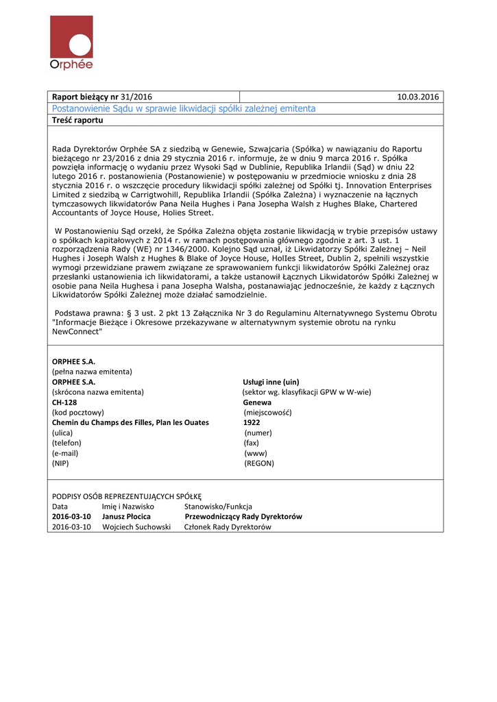 Raport bieżący nr 31/2016 Postanowienie Sądu w sprawie likwidacji spółki zależnej emitenta Treść raportu 10.03.2016 Rada Dyrektorów Orphée SA z siedzibą w Genewie, Szwajcaria (Spółka) w nawiązaniu do Raportu bieżącego nr 23/2016 z dnia 29 stycznia 2016 r. informuje, że w dniu 9 marca 2016 r. Spółka powzięła informację o wydaniu przez Wysoki Sąd w Dublinie, Republika Irlandii (Sąd) w dniu 22 lutego 2016 r. postanowienia (Postanowienie) w postępowaniu w przedmiocie wniosku z dnia 28 stycznia 2016 r. o wszczęcie procedury likwidacji spółki zależnej od Spółki tj. Innovation Enterprises Limited z siedzibą w Carrigtwohill, Republika Irlandii (Spółka Zależna) i wyznaczenie na łącznych tymczasowych likwidatorów Pana Neila Hughes i Pana Josepha Walsh z Hughes Blake, Chartered Accountants of Joyce House, Holies Street. W Postanowieniu Sąd orzekł, że Spółka Zależna objęta zostanie likwidacją w trybie przepisów ustawy o spółkach kapitałowych z 2014 r. w ramach postępowania głównego zgodnie z art. 3 ust. 1 rozporządzenia Rady (WE) nr 1346/2000. Kolejno Sąd uznał, iż Likwidatorzy Spółki Zależnej – Neil Hughes i Joseph Walsh z Hughes & Blake of Joyce House, HolIes Street, Dublin 2, spełnili wszystkie wymogi przewidziane prawem związane ze sprawowaniem funkcji likwidatorów Spółki Zależnej oraz przesłanki ustanowienia ich likwidatorami, a także ustanowił Łącznych Likwidatorów Spółki Zależnej w osobie pana Neila Hughesa i pana Josepha Walsha, postanawiając jednocześnie, że każdy z Łącznych Likwidatorów Spółki Zależnej może działać samodzielnie. Podstawa prawna: § 3 ust. 2 pkt 13 Załącznika Nr 3 do Regulaminu Alternatywnego Systemu Obrotu "Informacje Bieżące i Okresowe przekazywane w alternatywnym systemie obrotu na rynku NewConnect" ORPHEE S.A. (pełna nazwa emitenta) ORPHEE S.A. (skrócona nazwa emitenta) CH-128 (kod pocztowy) Chemin du Champs des Filles, Plan les Ouates (ulica) (telefon) (e-mail) (NIP) Usługi inne (uin) (sektor wg. klasyfikacji GPW w W-wie) Genewa (miejscowość) 1922 (numer) (fax) (www) (REGON) PODPISY OSÓB REPREZENTUJĄCYCH SPÓŁKĘ Data Imię i Nazwisko Stanowisko/Funkcja 2016-03-10 Janusz Płocica Przewodniczący Rady Dyrektorów 2016-03-10 Wojciech Suchowski Członek Rady Dyrektorów