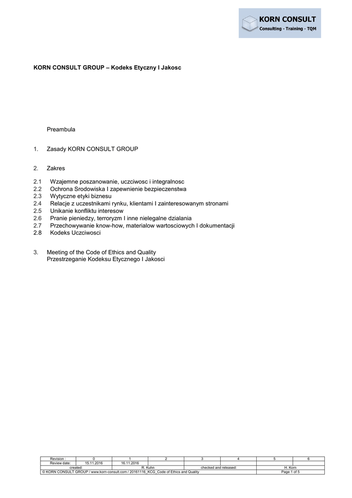KORN CONSULT GROUP – Kodeks Etyczny I Jakosc Preambula 1. Zasady KORN CONSULT GROUP 2. Zakres 2.1 2.2 2.3 2.4 2.5 2.6 2.7 2.8 3. Wzajemne poszanowanie, uczciwosc i integralnosc Ochrona Srodowiska I zapewnienie bezpieczenstwa Wytyczne etyki biznesu Relacje z uczestnikami rynku, klientami I zainteresowanym stronami Unikanie konfliktu interesow Pranie pieniedzy, terroryzm I inne nielegalne dzialania Przechowywanie know-how, materialow wartosciowych I dokumentacji Kodeks Uczciwosci Meeting of the Code of Ethics and Quality Przestrzeganie Kodeksu Etycznego I Jakosci Revision : 0 1 2 3 4 Review date: 15.11.2016 16.11.2016 created: R. Kuhn checked and released: © KORN CONSULT GROUP / www.korn-consult.com / 20161116_KCG_Code of Ethics and Quality 5 6 H. Korn Page 1 of 5 Preambula Polityka Jakosci KORN CONSULT GROUP znajduje odzwierciedlenie w naszej postawie wobec zrównoważonego rozwoju . Naszym celem jest utrzymanie tego poziomu również w otoczeniu społecznym. Mamy zasade ktora odzwierciedla w jednym zdaniu wszystko co KORN CONSULT GROUP znaczy. To pokazuje jak każdy z nas pracuje jako konsultant. Praktyczne i zorientowane na klienta Quality is no coincidence, but the result of functional business processes™ Jakosc nie jest dzielem przypadku ale wynikiem funkcjonalnych procesow biznesowych ™ W tym zdaniu jest wiele prawdy i wartości które determinują nasza codzienna prace: Odpowiedzialne uzycie materialow przyjaznych srodowisku jest naszym absolutnym priorytetem Chronimy przedsiebiorstwa naszych kilentow przed wszelkimi ryzykami Doceniamy I bierzemy pod uwage wszystkie informacje od klientow I traktujemy je poufnie Chronimy nasze przedsiebiorstwo przed ryzykiem finansowym Ciagle doskonalimy nasze procesy biznesowe Jestesmy zobligowani oferowac wiarygodnosc .i szczerosc Zaangazowani pracownicy sa kluczem do sukcesu Promujemy motywacje i niezawodnosc Komunikujemy sie w sposob szczery i otwarty Tworzymy zaufanie Tworzymy wartosc dodana I satysfakcje poprzez laczenie kompetencji I know-how w ustrukturyzowanej i szczerej kulturze komunikacji. Integracja najlepszych procedur odnoscie ochrony sroodowiska we wszystkich dzialaniach jest dla nas bardzo istotne: Uzywamy technologii ktora redukuje zuzycie wody I energii w miejscu pracy Przestrzegamy nasz system zarzadzania jakoscia rowniez w stosunku do potrzeb socjalno - zdrowotnych Zabezpieczamy naszych pracownikow przed roznymi ryzykami podczas codziennej pracy Szkolimy naszych pracownikow regularni w zakresie identyfikacji zagrozen I wlasnego bezpieczenstwa Uzywamy opakowan z materialow biodegradowalnych Promujemy uzywanie srodkow transport publicznego w czasie podrozy sluzbowych takich jak pociagi Nasza flota I serwis zapewniaja ochrone srodowiska I zasobow naturalnych Zarzad KORN CONSULT GROUP sprawdza regularnie stopien wdrozenia strategii . Jakosc nie jest dzielem przypadku. Ta sama procedura odnosci sie do Kodeksu Etycznego I Jakosci . To musi być spełnione. To jest ważne dla Ciebie jako osoby prywatnej jak i dla całej firmy KORN CONSULT GROUP Revision : 0 1 2 3 4 Review date: 15.11.2016 16.11.2016 created: R. Kuhn checked and released: © KORN CONSULT GROUP / www.korn-consult.com / 20161116_KCG_Code of Ethics and Quality 5 6 H. Korn Page 2 of 5 1. Zasady KORN CONSULT GROUP KORN CONSULT GROUP jest odpowiedzialny za swoich pracownikow za stworzenie I utrzymanie warunkow pracy w ktorych kazdy jest traktowany z szacunkiem I gdzie kazdy jest doceniany I respektowany. Zasada wzajemnego szacunku jest podstawa kultury zarzadzania KORN CONSULT GROUP. To się odznacza poprzez otwartość i prace zespolowa oparta na zaufaniu. Podejscie oparte na konstruktywnych rozwiązaniach oraz wzajemnych opinii (również hierarchicznych) jest wyraźnie doceniane celem uzyskania najlepszego rozwiązania dla KORN CONSULT GROUP poprzez dialog. KORN CONSULT GROUP iest odpowiedzialne za przestrzeganie rownosci, niezaleznosci narodowościowych, etnicznych, pochodzenia, wieku, niepelnosprawnosci, wyglądu, innych fizycznych cechach, koloru skory, orientacji seksualnej, religii i innych chronionych aspektach. To się odnosi również w stosunku do poszanowania kolegow i koleżanek i ich własności. KORN CONSULT GROUP nie toleruje dyskryminacji, nekania, zniewagi i oczekuje ze wszyscy pracownicy szanują prywatnosc, poczucie wartości innych. Jakiekolwiek formy nekania sa surowo zagrozone. Jakiekolwiek formy nekania powinny być natychmiast zgłaszane od przelozonego. Nekanie dotyczy rowniez: Niewlasciwe I / lub niepozadany kontakt fizyczny z pracownikiem. Zastraszanie, grozby I uchybiajace zachowanie w stosunku do pracownika. Wyswietlanie niewlasciwych materialow (zdjec, gazet itp) ktore moga obrazic innych KORN CONSULT GROUP szanuje miedzynarodowe prawa czlowiek I odrzuca zachowanie ktore zagraza tym prawom. Pogwalcenie praw człowieka nie może być tolerowane. 2. Zakres 2.1 Wzajemne poszanowanie, uczciwosc i integralnosc Wzajemny szacunek I otwartosc jako rowniez szczera wspolpraca sa czescia Kodeksy Postepowania KORN CONSULT GROUP. Podejscie oparte na konstruktywnych rozwiązaniach oraz wzajemnych opinii (również hierarchicznych) jest wyraźnie doceniane celem uzyskania najlepszego rozwiązania dla KORN CONSULT GROUP poprzez dialog. KORN CONSULT GROUP nie toleruje dyskryminacji, nekania, zniewagi i oczekuje ze wszyscy pracownicy szanują prywatnosc, poczucie wartości innych. 2.2 Ochrona Srodowiska I zapewnienie bezpieczenstwa Efektywne uzycie zasobow naturalnych jest konieczne w zrownowaznym rozwoju KORN CONSULT GROUP. W celu redukcji zużycia energii i zasobow naturalnych w trakcje wykonywania naszych usług i ograniczeniu emisji do atmosfery, wszystkie możliwości musza być wyczerpane ażeby utrzymać optymalne funkcjonowanie procesow biznesowych. W celu zapewnienia ciągłej ochrony środowiska KORN CONSULT GROUP stosuje swój system zarzadzania jakoscia rownie w stosunku do potrzeb socjalno – zdrowotnych. Zawiera to różnorakie srodki w cel