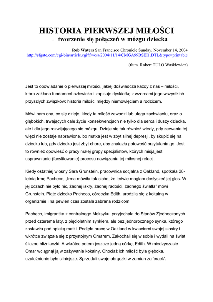 HISTORIA PIERWSZEJ MIèO CI tworzenie si poø cze w mózgu dziecka Rob Waters San Francisco Chronicle Sunday, November 14, 2004 http://sfgate.com/cgi-bin/article.cgi?f=/c/a/2004/11/14/CMGA99BSEI1.DTL&type=printable (tøum. Robert TULO Wa kiewicz) Jest to opowiadanie o pierwszej miłości, jakiej doświadcza każdy z nas – miłości, która zakłada fundament człowieka i zapisuje dyskietkę z wzorcami jego wszystkich przyszłych związków: historia miłości między niemowlęciem a rodzicem. Mówi nam ona, co się dzieje, kiedy ta miłość zawodzi lub ulega zachwianiu, oraz o głębokich, trwających całe życie konsekwencjach nie tylko dla serca i duszy dziecka, ale i dla jego rozwijającego się mózgu. Dzieje się tak również wtedy, gdy zerwanie tej więzi nie zostaje naprawione, bo matka jest w zbyt silnej depresji, by skupić się na dziecku lub, gdy dziecko jest zbyt chore, aby znalazła gotowość przytulania go. Jest to również opowieść o pracy małej grupy specjalistów, których misją jest usprawnianie (facylitowanie) procesu nawiązania tej miłosnej relacji. Kiedy ostatniej wiosny Sara Grunstein, pracownica socjalna z Oakland, spotkała 28letnią Irmę Pacheco, „Irma mówiła tak cicho, że ledwie mogłam dosłyszeć jej głos. W jej oczach nie było nic, żadnej iskry, żadnej radości, żadnego światła” mówi Grunstein. Piąte dziecko Pacheco, córeczka Edith, urodziła się z kokainą w organizmie i na pewien czas została zabrana rodzicom. Pacheco, imigrantka z centralnego Meksyku, przyjechała do Stanów Zjednoczonych przed czterema laty, z pięcioletnim synkiem, ale bez jednorocznego synka, którego zostawiła pod opieką matki. Podjęła pracę w Oakland w kwiaciarni swojej siostry i wkrótce związała się z przystojnym Omarem. Zakochali się w sobie i wydali na świat śliczne bliźniaczki. A wkrótce potem jeszcze jedną córkę, Edith. W międzyczasie Omar wciągnął ją w zażywanie kokainy. Chociaż ich miłość była głęboka, uzależnienie było silniejsze. Sprzedali swoje obrączki w zamian za ‘crack’. W ten sposób stracili Edith. Chcąc ją odzyskać podjęli leczenie z uzależnienia chemicznego i Edith wkrótce wróciła pod ich opiekę. Sąd skierował tę rodzinę na program zdrowia psychicznego prowadzony przez Szpital dziecięcy i Centrum badawcze w Oakland. Tam przejęła ich Grunstein, która też jest meksykańską emigrantką. Pierwszym jej zadaniem było wyciągnąć Irmę z depresji. Grunstein odwiedzała ją co tydzień i kilka pierwszych spotkań poświęciła na poznanie matki i jej dzieci, skupiając się zwłaszcza na 18-miesięcznych bliźniaczkach. Dziewczynki były milczące i zalęknione; ciągle wtulały się i wczepiały w matkę. Nie wydawały głosu, nie bawiły się zabawkami i poza lękiem prawie nie przejawiały emocji. „Dzieci te nie wiedziały jak się bawić - mówi Grun - nie wiedziała też tego ich depresyjna matka”. Sama zaczęła bawić się z dziewczynkami i zachęcać Irmę, by im śpiewała. Kiedy Irma ze wstydem wyznała, że ma okropny głos, Grun sama śpiewała dzieciom hiszpańskie rymowanki. „A przecież ja również nie umiem śpiewać” – śmieje się Grun. W ciągu następnych sześciu miesięcy bliźniaczki stały się bardziej otwarte. Wkrótce zamiast wczepiać się w matkę i siedzieć jej na kolanach, bawiły się z Grun. Każda wizyta zaczynała się od tego samego rytuału: dzieci próbowały dobrać się do portmonetki pielęgniarki, a ona je powstrzymywała. Podczas ostatniej wizyty w domu Pacheco bliźniaczki, wówczas już dwuletnie, urocze i rozwinięte ponad swój wiek, bawiły się figlarnie ze swoim ojcem, Grun i autorem tego reportażu. Irma siedziała na nowej, niebieskiej kanapie, rzadko się odzywając i śmiejąc. Karmiła Edith butelką. Starszy brat grał na komputerze. Bliźniaczki baraszkowały w ciasnym, zaludnionym pokoju, stukając klockami w stolik do kawy i pokazując pępki. W ustach dyndały im plastikowe butelki trzymane zębami za smoczki. Mimo tak znacznych postępów dziewczynki jednak nie mówiły. Aby ich głosy były słyszalne i rejestrowały się w świadomości rodziców, Grun mówiła za nie. W jakimś momencie Katarina chciała wspiąć się na kolana ojca zajęte już przez Imeldę, która dała siostrze małego kopniaka; Grun nadała wtedy głos jej uczuciom: „twoje kolano jest takie wyjątkowe, tatusiu, że nie chcę go dzielić z siostrą”. Oblicze Omara zajaśniało i ojciec pocałował obie córki. Rozpromienił się jeszcze bardziej, słysząc pochwały Grun dla nich dwojga za postępy i wytrwałość w zdrowieniu oraz za realizowanie wszystkich zaleceń. „ Zrobię wszystko, co trzeba, żeby ich nie stracić” – powiedział. Irma wzięła dziewięciomiesięczną Edith do sypialni, by położyć ją spać. Mała nie chciała jednak leżeć i wróciła do pokoju dziennego, w ramiona matki. „Mamusiu – powiedziała Grun – kiedy wychodzisz, boję się, że już nie wrócisz, a ja tak bardzo cię pragnę”. Zamiast poczucia porażki i irytacji, na krągłęj twarzy Irmy zagościł na chwilę uśmiech dumy. O co właściwie tutaj chodzi? Czy to jest naprawdę leczenie? A jeśli tak, to w jaki sposób pomaga to dzieciom? Niemowlęta na kozetce? Leczenie psychiatryczne niemowląt wydaje się czymś dziwacznym. Ann Arbor News napisały o tym w tytule jako o terapeutach „kładących dzieci na kozetkach”. Określenie to jest zwodnicze, gdyż praca ta skupia się nie na dziecku, a na jego więzi z rodzicem. Ma swoje źródło w późnych pracach Selmy Fraiberg, która rozwinęła tę koncepcję na Uniwersytecie w Michigan, a potem założyła ośrodek znany później jako Program Niemowlę - Rodzic na Uniwesytecie Kalifornijskim w San Francisco w 1979. Od tej pory San Francisco stało się centrum badań nad zdrowiem psychicznym niemowląt. Fraiberg, psychoanalityczka i pracownica socjalna, pracowała prócz tego w Michig