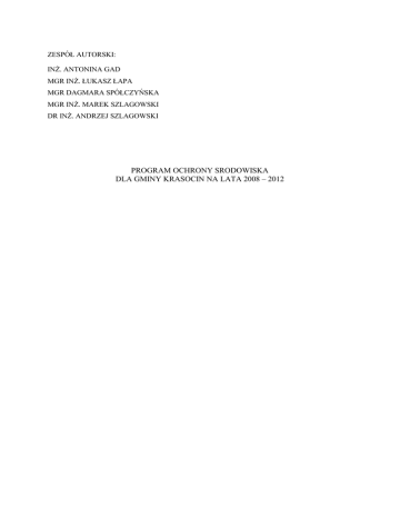 ZESPÓŁ AUTORSKI: INŻ. ANTONINA GAD MGR INŻ. ŁUKASZ ŁAPA MGR DAGMARA SPÓŁCZYŃSKA MGR INŻ. MAREK SZLAGOWSKI DR INŻ. ANDRZEJ SZLAGOWSKI PROGRAM OCHRONY SRODOWISKA DLA GMINY KRASOCIN NA LATA 2008 – 2012 Program Ochrony Środowiska dla Gminy Krasocin 1. WSTĘP........................................................................................................................................................... 3 2. CHARAKTERYSTYKA OGÓLNA GMINY KRASOCIN ...................................................................... 6 3. CHARAKTERYSTYKA I OCENA OBECNEGO STANU ŚRODOWISKA ............................................. 7 3.1 OGÓLNA CHARAKTERYSTYKA ŚRODOWISKA PRZYRODNICZEGO GMINY KRASOCIN ....................................... 7 3.2. ZASOBY PRZYRODNICZE ................................................................................................................................ 8 3.2.1. Główne zagrożenia i problemy w dziedzinie ochrony przyrody ......................................................... 10 3.3. SUROWCE MINERALNE ........................................................................................................................... 11 3.3.1. Budowa geologiczna i surowce mineralne ........................................................................................ 11 3.3.2. Wpływ działalności górniczej na środowisko ..................................................................................... 12 3.4. GOSPODARKA WODNA ........................................................................................................................... 13 3.4.1. Wody powierzchniowe i podziemne.................................................................................................... 13 3.4.2 Gospodarka wodno-ściekowa ............................................................................................................. 15 3.5. GOSPODARKA ODPADAMI............................................................................................................................ 17 3.6. POWIETRZE ATMOSFERYCZNE ..................................................................................................................... 18 3.6.1 Główne zagrożenia i problemy w zakresie ochrony powietrza ........................................................... 20 3.7. OCHRONA POWIERZCHNI ZIEMI I GLEB ........................................................................................................ 20 3.7.1. Główne zagrożenia i problemy ochrony gleb ..................................................................................... 21 3.8. LASY ........................................................................................................................................................... 21 3.8.1. Główne zagrożenia i problemy w zakresie gospodarki leśnej ............................................................ 22 3.9. HAŁAS, WIBRACJE I PROMIENIOWANIE ELEKTROMAGNETYCZNE................................................................. 23 3.9.1. Hałas i wibracje .................................................................................................................................. 23 3.9.2. Promieniowanie elektromagnetyczne ................................................................................................ 24 3.9.3.Główne problemy związane z ochroną przed hałasem i promieniowaniem elektromgnetycznym .... 24 3.10. POWAŻNE AWARIE PRZEMYSŁOWE I DROGOWE ......................................................................................... 25 3.10.1. Główne zagrożenia związane z ochroną przed poważnymi awariami ............................................. 26 3.11. EDUKACJA EKOLOGICZNA ......................................................................................................................... 26 3.11.1. Główne zagrożenia i problemy w dziedzinie edukacji ekologicznej ................................................ 28 4. OCENA REALIZACJI ZADAŃ ............................................................................................................... 28 5. PRIORYTETY EKOLOGICZNE ............................................................................................................ 30 6. STRATEGIA DZIAŁAŃ ........................................................................................................................... 33 6.1. ŚRODOWISKO PRZYRODNICZE ..................................................................................................................... 33 6.2. SUROWCE MINERALNE ........................................................................................................................... 36 6.3. GOSPODARKA WODNA ................................................................................................................................ 37 6.4. GOSPODARKA ODPADAMI............................................................................................................................ 40 6.5. OCHRONA POWIETRZA ................................................................................................................................ 42 6.6. OCHRONA POWIERZCHNI ZIEMI I GLEB ....................................................................................................... 43 6.7. LASY ........................................................................................................................................................... 44 6.8. HAŁAS, WIBRACJE I POLA ELEKTROMAGNETYCZNE..................................................................................... 45 6.9. POWAŻNE AWARIE PRZEMYSŁOWE .............................................................................................................. 46 6.10. EDUKACJA EKOLOGICZNA ......................................................................................................................... 47 7. ŹRÓDŁA FINANSOWANIA „PROGRAMU ...” .........