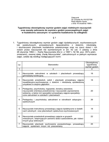=DáF]QLN GRXFKZDá\1U;,9 5DG\0LDVWD2SROD ]GQLDZU]HQLDU 7\JRGQLRZ\RERZL]NRZ\Z\PLDUJRG]LQ]DM üQLHNWyU\FKQDXF]\FLHOL RUD]]DVDG\]DOLF]DQLDGRZ\PLDUXJRG]LQSRV]F]HJyOQ\FK]DM ü ZNV]WDáFHQLX]DRF]Q\PLZV\VWHPLHNV]WDáFHQLDQDRGOHJáRü 7\JRGQLRZ\RERZL]NRZ\Z\PLDU JRG]LQ]DM üG\GDNW\F]Q\FKZ\FKRZDZF]\FK OXE RSLHNXF]\FK SURZDG]RQ\FK EH]SRUHGQLR ] G]LHüPL PáRG]LH* L VáXFKDF]DPL SODFyZHN NV]WDáFHQLD XVWDZLF]QHJR RUD] QD U]HF] G]LHFL L LFK URG]LQ SU]H] QDXF]\FLHOL QLH Z\PLHQLRQ\FK Z DUW XVW XVWDZ\ ] GQLD VW\F]QLDU .DUWD1DXF]\FLHOD']8]U1USR]]Sy(Q ]PLDQDPL]ZDQHMGDOHMÄ.DUW 1DXF]\FLHOD´]DWUXGQLRQ\FKZSHáQ\PZ\PLDU]H ]DM üXVWDODVL ZHGáXJQDVW SXMF\FKQRUP /S 6WDQRZLVNR 1DXF]\FLHOH ]DWUXGQLHQL Z V]NRáDFK L SODFyZNDFK SURZDG]F\ JLPQDVW\N NRUHNF\MQ 1DXF]\FLHOH SU]HGV]NROL V]Nyá L SODFyZHN SURZDG]F\ ]DM FLD UHZDOLGDF\MQRZ\FKRZDZF]H ] G]LHüPL L PáRG]LH* XSROHG]RQ XP\VáRZRZVWRSQLXJá ERNLP 3HGDJRG]\SV\FKRORG]\ORJRSHG]LGRUDGF\]DZRGRZL QDXF]\FLHOHRULHQWDFMLSU]HVWU]HQQHMLQDXF]\FLHOHXVSUDZQLDQLD ZLG]HQLDDWDN*HLQQLVSHFMDOLFLSURZDG]F\]DM FLDVSHFMDOLVW\ F]QH]DWUXGQLHQLZV]NRáDFKLSODFyZNDFK 2ERZL]NRZ\ W\JRGQLRZ\ Z\PLDUJRG]LQ 3HGDJRG]\ L SV\FKRORG]\ ]DWUXGQLHQL Z RURGNDFK DGRSF\MQR ± RSLHNXF]\FK 1DXF]\FLHOHLQVWUXNWRU]\SURZDG]F\]DM FLDG\GDNW\F]QHZZLHWOL FDFKV]NROQ\FKRUD]SODFyZNDFKRSLHNXF]RZ\FKRZDZF]\FK 1DXF]\FLHOHSU]HGV]NROLSURZDG]F\]DM FLDZJUXSDFK PLHV]DQ\FKREHMPXMF\FK]DUyZQRG]LHFLV]HFLROHWQLHMDNLG]LHFL LQQ\FKJUXSZLHNRZ\FK 1DXF]\FLHOH SODFyZHN Z\FKRZDQLD SR]DV]NROQHJR SURZDG]F\ ]DM FLDV\VWHPHPLQQ\PQL* SUDFRZQLDQ\ :\FKRZDZF\RJQLVNZ\FKRZDZF]\FK :\FKRZDZF\± RSLHNXQRZLHRSLHNXQNLG]LHFLGRODWWU]HFK]DWUXG QLHQLZGRPDFKG]LHFND 1DXF]\FLHOH FHQWUyZ NV]WDáFHQLD SUDNW\F]QHJR SURZDG]F\ ]DM FLD ZV\VWHPLHSUDFRZQLDQRODERUDWRU\MQ\P 3U]H] ]DM FLD G\GDNW\F]QH Z\FKRZDZF]H OXE RSLHNXF]H SURZDG]RQH EH]SRUHGQLR ] G]LHüPL PáRG]LH* RUD] QD U]HF] G]LHFL L LFK URG]LQ SU]H] QDXF]\FLHOLZ\PLHQLRQ\FKZXVWSRGOSQDOH*\UR]XPLHü]DM FLDJUXSRZH LLQG\ZLGXDOQHZ\QLNDMFH]UHDOL]DFML]DGD GLDJQRVW\F]Q\FKWHUDSHXW\F]Q\FK GRUDGF]\FKSURILODNW\F]Q\FKLNRUHNF\MQ\FK 2ERZL]NRZ\ Z\PLDU JRG]LQ ]DM ü G\GDNW\F]Q\FK QDXF]\FLHOL ]DWUXGQLRQ\FK Z SHáQ\P Z\PLDU]H JRG]LQ Z NV]WDáFHQLX ]DRF]Q\P L V\VWHPLH NV]WDáFHQLD QD RGOHJáRü ]ZDQ\FK GDOHM ÄSODFyZNDPL HGXNDFML QLHVWDFMRQDUQHM´ Z\QRVL JRG]LQURF]QLH 'R RERZL]NRZHJR Z\PLDUX JRG]LQ ]DM ü G\GDNW\F]Q\FK QDXF]\FLHOL ]DWUXGQLR Q\FKZNV]WDáFHQLX]DRF]Q\PLSODFyZNDFKHGXNDFMLQLHVWDFMRQDUQHM]DOLF]DVL JRG]LQ\ Z\NáDGyZ NRQVXOWDFMLüZLF]H]DM üSUDNW\F]Q\FK LNRQZHUVD WRULyZ IDNW\F]QLH]UHDOL]RZDQHJRG]LQ\ D SRSUDZLDQLD L RFHQLDQLD SLVHPQ\FK SUDF NRQWUROQ\FK L HJ]DPLQDF\MQ\FK ] Z\MWNLHP HJ]DPLQyZ ZVW SQ\FK ] QDXNL ]DZRGX ] SU]\JRWRZDQLD ]DZRGRZHJR G\SORPRZ\FK L GRMU]DáRFL OLF]F SRSUDZLDQLH SUDF ]DJRG]LQ ]DM ü E LQQ\FK ]DM ü SHGDJRJLF]Q\FK UHDOL]RZDQ\FK ] XF]QLDPL SU]H] SHáQR ]DWUXGQLRQHJRQDXF]\FLHODZIRUPDFKSU]H]QLHJRREUDQ\FKLXGRNXPHQ WRZDQ\FK Z Z\PLDU]H QLH SU]HNUDF]DMF\P JRG]LQ URF]QLH GODQDXF]\FLHOL QLHSHáQR]DWUXGQLRQ\FKZ\PLDUW\FK]DM üXOHJDSURSRUFMR QDOQHPX]PQLHMV]HQLX JRG]LQ\QDG]RURZDQLDLSU]HSURZDG]DQLDHJ]DPLQyZGRMU]DáRFL JRG]LQ\ SU]HSURZDG]DQLD HJ]DPLQyZ XVWQ\FK ] Z\MWNLHP ZVW SQ\FK ] QDXNL]DZRGX ] SU]\JRWRZDQLD]DZRGRZHJR LG\SORPRZ\FKZZ\PLDU]H XVWDORQ\PSU]H]G\UHNWRUDV]NRá\ .D*G JRG]LQ ]DM ü Z\PLHQLRQ\FK Z XVW SNW LSNWIDNW\F]QLHUHDOL]RZD Q\FKZQLHG]LHOHLZL WD OLF]\VL ]DJRG]LQ\]DM ü 'ODFHOyZREOLF]DQLDRERZL]NRZHJRZ\PLDUXJRG]LQ]DM üG\GDNW\F]Q\FKSU]H] JRG]LQ üZLF]H LNRQVXOWDFMLQDOH*\UR]XPLHüMHGQRVWN PLQXWSU]H]JRG]LQ ]DM ü SUDNW\F]Q\FK MHGQRVWN PLQXW D SU]H] JRG]LQ SR]RVWDá\FK ]DM ü PLQXW 5R]OLF]HQLH JRG]LQ ]DM ü G\GDNW\F]Q\FK QDXF]\FLHOD ]DWUXGQLRQHJR Z SHáQ\P Z\PLDU]H JRG]LQ ]DM ü G\GDNW\F]Q\FK Z NV]WDáFHQLX ]DRF]Q\P L SODFyZFH HGXNDFML QLHVWDFMRQDUQHM QDVW SXMH Z ND*G\P VHPHVWU]H : RNUHVLH VHPHVWUX QDXF]\FLHORERZL]DQ\MHVW]UHDOL]RZDüSRáRZ URF]QHJRZ\PLDUXJRG]LQ]DM ü ]D SRGVWDZ UR]OLF]HQLD SU]\MPXMH VL ZHGáXJ ]DSLVyZ Z G]LHQQLNX OHNF\MQ\P RGE\WHJRG]LQ\]DM üJRG]LQ\XVSUDZLHGOLZLRQHMQLHREHFQRFLZSUDF\LJRG]LQ\ QLH]UHDOL]RZDQH]SU]\F]\QOH*F\FKSRVWURQLHSUDFRGDZF\ 2GE\WH JRG]LQ\ ]DM ü Z\PLHQLRQ\FK Z XVW RUD] JRG]LQ\ ]DM ü Z\QLNDMFH ] SODQX QDXF]DQLD OHF] QLH ]UHDOL]RZDQH ] SU]\F]\Q OH*F\FK SR VWURQLH SUDFRGDZF\ SU]HNUDF]DMFH SRáRZ URF]QHJR Z\PLDUX V JRG]LQDPL SRQDGZ\PLDURZ\PL 2ERZL]NRZ\ SHáQ\ Z\PLDU JRG]LQ ]DM ü G\GDNW\F]Q\FK Z\FKRZDZF]\FK OXE RSLHNXF]\FK QDXF]\FLHOL ]RERZL]DQ\FK GR SUDF\ Z LQQHM V]NROH OXE SODFyZFH HGXNDFML QLHVWDFMRQDUQHM Z FHOX X]XSHáQLHQLD RERZL]NRZHJR Z\PLDUX ]DM ü G\GDNW\F]Q\FKXVWDODVL ZHGáXJQDVW SXMF\FK]DVDG 2ERZL]NRZ\ Z\PLDU JRG]LQ ]DM ü QDXF]\FLHOD ]DWUXGQLRQHJR Z SHáQ\P Z\PLDU]H SURZDG]FHJR ]DM FLD ] SU]HGPLRWyZ R Uy*Q\P Z\PLDU]H JRG]LQ XVWDOD VL ZHGáXJ SU]HGPLRWX GOD NWyUHJR Z\PLDU MHVW NRU]\VWQLHMV]\ MH*HOL QDXF]\FLHO QDXF]D WHJR SU]HGPLRWX FR QDMPQLHM Z SRáRZLH RERZL]NRZHJR Z\PLDUX 'R RERZL]NRZHJRZ\PLDUXJRG]LQ]DM üQDXF]\FLHODZOLF]DVL UyZQLH* JRG]LQ\ QDG]RURZDQLDLSU]HSURZDG]DQLDHJ]DPLQyZGRMU]DáRFL =DVDG\ RNUHORQH Z XVW VWRVXMH VL RGSRZLHGQLR GR G\UHNWRUyZ V]Nyá RUD] LQQ\FK QDXF]\FLHOL NWyU\P SRZLHU]RQR VWDQRZLVND NLHURZQLF]H MH*HOL F]\QQRFL ]ZL]DQH ] QDG]RURZDQLHP SLVHPQ\FK HJ]DPLQyZ GRMU]DáRFL L SU]HSURZDG]D QLHPHJ]DPLQyZXVWQ\FKSU]HNUDF]DM RERZL]XMF\LFKZ\PLDU]DM ü