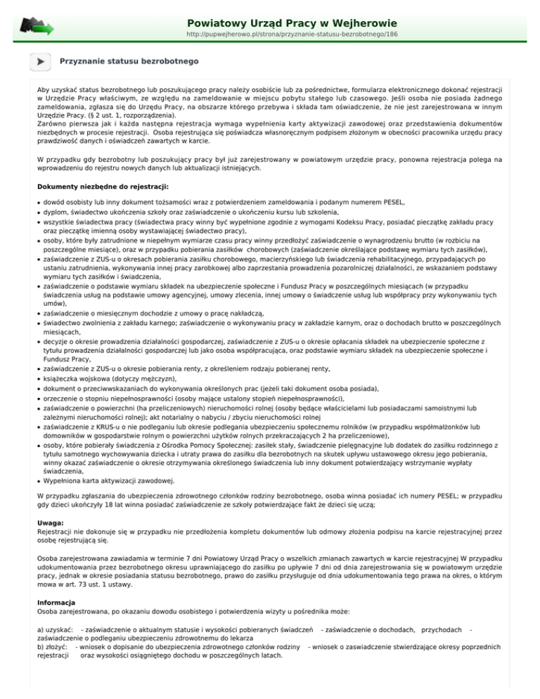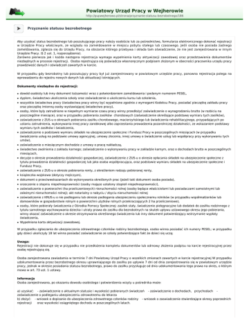 Powiatowy Urząd Pracy w Wejherowie http://pupwejherowo.pl/strona/przyznanie-statusu-bezrobotnego/186 Przyznanie statusu bezrobotnego Aby uzyskać status bezrobotnego lub poszukującego pracy należy osobiście lub za pośrednictwe, formularza elektronicznego dokonać rejestracji w Urzędzie Pracy właściwym, ze względu na zameldowanie w miejscu pobytu stałego lub czasowego. Jeśli osoba nie posiada żadnego zameldowania, zgłasza się do Urzędu Pracy, na obszarze którego przebywa i składa tam oświadczenie, że nie jest zarejestrowana w innym Urzędzie Pracy. (§ 2 ust. 1, rozporządzenia). Zarówno pierwsza jak i każda następna rejestracja wymaga wypełnienia karty aktywizacji zawodowej oraz przedstawienia dokumentów niezbędnych w procesie rejestracji. Osoba rejestrująca się poświadcza własnoręcznym podpisem złożonym w obecności pracownika urzędu pracy prawdziwość danych i oświadczeń zawartych w karcie. W przypadku gdy bezrobotny lub poszukujący pracy był już zarejestrowany w powiatowym urzędzie pracy, ponowna rejestracja polega na wprowadzeniu do rejestru nowych danych lub aktualizacji istniejących. Dokumenty niezbędne do rejestracji: ● dowód osobisty lub inny dokument tożsamości wraz z potwierdzeniem zameldowania i podanym numerem PESEL, ● dyplom, świadectwo ukończenia szkoły oraz zaświadczenie o ukończeniu kursu lub szkolenia, ● ● ● ● ● ● ● ● wszystkie świadectwa pracy (świadectwa pracy winny być wypełnione zgodnie z wymogami Kodeksu Pracy, posiadać pieczątkę zakładu pracy oraz pieczątkę imienną osoby wystawiającej świadectwo pracy), osoby, które były zatrudnione w niepełnym wymiarze czasu pracy winny przedłożyć zaświadczenie o wynagrodzeniu brutto (w rozbiciu na poszczególne miesiące), oraz w przypadku pobierania zasiłków chorobowych (zaświadczenie określające podstawę wymiaru tych zasiłków), zaświadczenie z ZUS-u o okresach pobierania zasiłku chorobowego, macierzyńskiego lub świadczenia rehabilitacyjnego, przypadających po ustaniu zatrudnienia, wykonywania innej pracy zarobkowej albo zaprzestania prowadzenia pozarolniczej działalności, ze wskazaniem podstawy wymiaru tych zasiłków i świadczenia, zaświadczenie o podstawie wymiaru składek na ubezpieczenie społeczne i Fundusz Pracy w poszczególnych miesiącach (w przypadku świadczenia usług na podstawie umowy agencyjnej, umowy zlecenia, innej umowy o świadczenie usług lub współpracy przy wykonywaniu tych umów), zaświadczenie o miesięcznym dochodzie z umowy o pracę nakładczą, świadectwo zwolnienia z zakładu karnego; zaświadczenie o wykonywaniu pracy w zakładzie karnym, oraz o dochodach brutto w poszczególnych miesiącach, decyzje o okresie prowadzenia działalności gospodarczej, zaświadczenie z ZUS-u o okresie opłacania składek na ubezpieczenie społeczne z tytułu prowadzenia działalności gospodarczej lub jako osoba współpracująca, oraz podstawie wymiaru składek na ubezpieczenie społeczne i Fundusz Pracy, zaświadczenie z ZUS-u o okresie pobierania renty, z określeniem rodzaju pobieranej renty, ● książeczka wojskowa (dotyczy mężczyzn), ● dokument o przeciwwskazaniach do wykonywania określonych prac (jeżeli taki dokument osoba posiada), ● orzeczenie o stopniu niepełnosprawności (osoby mające ustalony stopień niepełnosprawności), ● ● ● ● zaświadczenie o powierzchni (ha przeliczeniowych) nieruchomości rolnej (osoby będące właścicielami lub posiadaczami samoistnymi lub zależnymi nieruchomości rolnej); akt notarialny o nabyciu / zbyciu nieruchomości rolnej zaświadczenie z KRUS-u o nie podleganiu lub okresie podlegania ubezpieczeniu społecznemu rolników (w przypadku współmałżonków lub domowników w gospodarstwie rolnym o powierzchni użytków rolnych przekraczających 2 ha przeliczeniowe), osoby, które pobierały świadczenia z Ośrodka Pomocy Społecznej: zasiłek stały, świadczenie pielęgnacyjne lub dodatek do zasiłku rodzinnego z tytułu samotnego wychowywania dziecka i utraty prawa do zasiłku dla bezrobotnych na skutek upływu ustawowego okresu jego pobierania, winny okazać zaświadczenie o okresie otrzymywania określonego świadczenia lub inny dokument potwierdzający wstrzymanie wypłaty świadczenia, Wypełniona karta aktywizacji zawodowej. W przypadku zgłaszania do ubezpieczenia zdrowotnego członków rodziny bezrobotnego, osoba winna posiadać ich numery PESEL; w przypadku gdy dzieci ukończyły 18 lat winna posiadać zaświadczenie ze szkoły potwierdzające fakt że dzieci się uczą; Uwaga: Rejestracji nie dokonuje się w przypadku nie przedłożenia kompletu dokumentów lub odmowy złożenia podpisu na karcie rejestracyjnej przez osobę rejestrującą się. Osoba zarejestrowana zawiadamia w terminie 7 dni Powiatowy Urząd Pracy o wszelkich zmianach zawartych w karcie rejestracyjnej W przypadku udokumentowania przez bezrobotnego okresu uprawniającego do zasiłku po upływie 7 dni od dnia zarejestrowania się w powiatowym urzędzie pracy, jednak w okresie posiadania statusu bezrobotnego, prawo do zasiłku przysługuje od dnia udokumentowania tego prawa na okres, o którym mowa w art. 73 ust. 1 ustawy. Informacja Osoba zarejestrowana, po okazaniu dowodu osobistego i potwierdzenia wizyty u pośrednika może: a) uzyskać: - zaświadczenie o aktualnym statusie i wysokości pobieranych świadczeń - zaświadczenie o dochodach, przychodach zaświadczenie o podleganiu ubezpieczeniu zdrowotnemu do lekarza b) złożyć: - wniosek o dopisanie do ubezpieczenia zdrowotnego członków rodziny - wniosek o zaswiadczenie stwierdzające okresy poprzednich rejestracji oraz wysokości osiągniętego dochodu w poszczególnych latach. Podstawa prawna: ● Ustawa z dnia 20 kwietnia 2004r. o promocji zatrudnienia i instytucjach rynku pracy (tj. Dz. U. z 2016r. poz. 645 ze zm.), ● Rozporządzenie MPiPS z 12 listopada 2012 w sprawie rejestracji bezrobotnych i poszukującyc