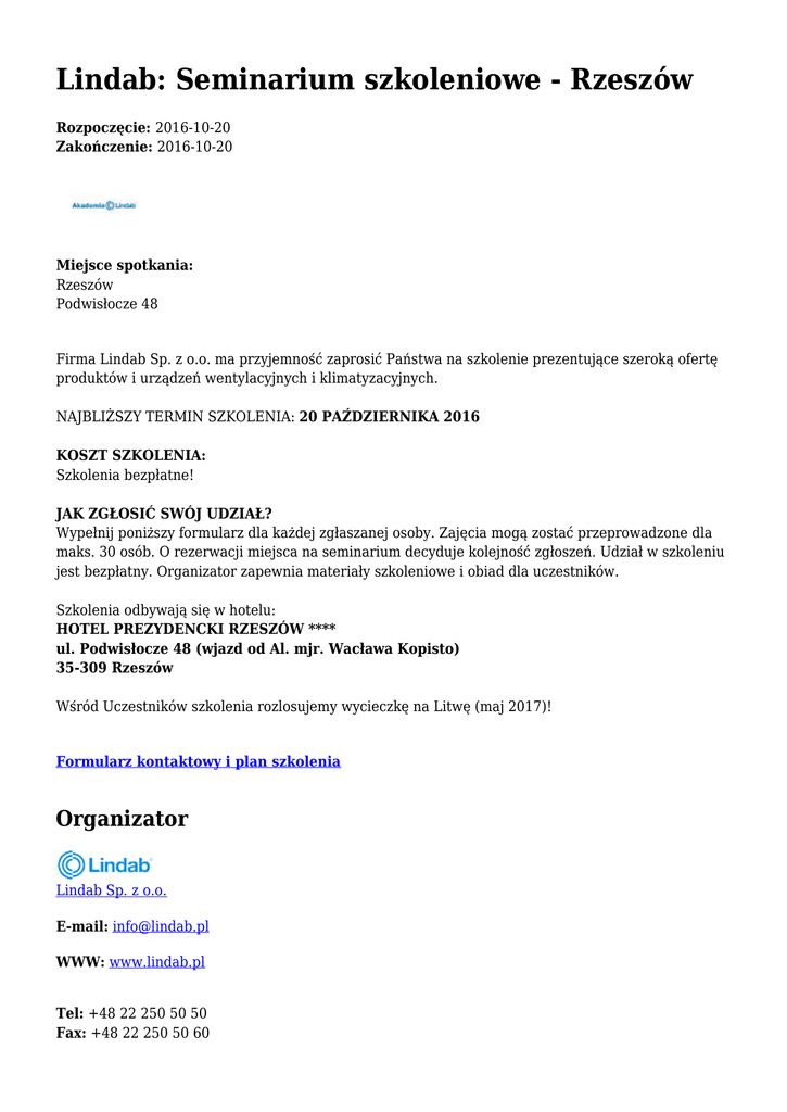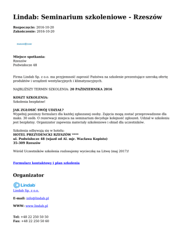 Lindab: Seminarium szkoleniowe - Rzeszów Rozpoczęcie: 2016-10-20 Zakończenie: 2016-10-20 Miejsce spotkania: Rzeszów Podwisłocze 48 Firma Lindab Sp. z o.o. ma przyjemność zaprosić Państwa na szkolenie prezentujące szeroką ofertę produktów i urządzeń wentylacyjnych i klimatyzacyjnych. NAJBLIŻSZY TERMIN SZKOLENIA: 20 PAŹDZIERNIKA 2016 KOSZT SZKOLENIA: Szkolenia bezpłatne! JAK ZGŁOSIĆ SWÓJ UDZIAŁ? Wypełnij poniższy formularz dla każdej zgłaszanej osoby. Zajęcia mogą zostać przeprowadzone dla maks. 30 osób. O rezerwacji miejsca na seminarium decyduje kolejność zgłoszeń. Udział w szkoleniu jest bezpłatny. Organizator zapewnia materiały szkoleniowe i obiad dla uczestników. Szkolenia odbywają się w hotelu: HOTEL PREZYDENCKI RZESZÓW **** ul. Podwisłocze 48 (wjazd od Al. mjr. Wacława Kopisto) 35-309 Rzeszów Wśród Uczestników szkolenia rozlosujemy wycieczkę na Litwę (maj 2017)! Formularz kontaktowy i plan szkolenia Organizator Lindab Sp. z o.o. E-mail: [email protected] WWW: www.lindab.pl Tel: +48 22 250 50 50 Fax: +48 22 250 50 60 Adres: Sochaczewska 144 05-850 Ożarów Mazowiecki, Wieruchów