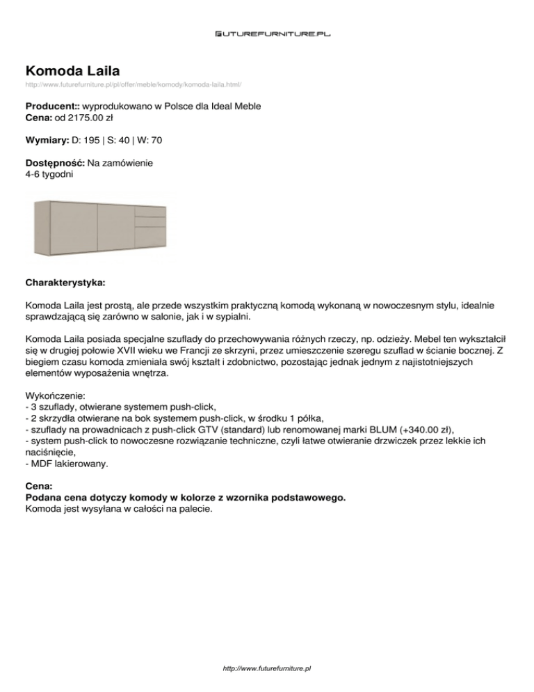 Komoda Laila http://www.futurefurniture.pl/pl/offer/meble/komody/komoda-laila.html/ Producent:: wyprodukowano w Polsce dla Ideal Meble Cena: od 2175.00 zł Wymiary: D: 195 | S: 40 | W: 70 Dostępność: Na zamówienie 4-6 tygodni Charakterystyka: Komoda Laila jest prostą, ale przede wszystkim praktyczną komodą wykonaną w nowoczesnym stylu, idealnie sprawdzającą się zarówno w salonie, jak i w sypialni. Komoda Laila posiada specjalne szuflady do przechowywania różnych rzeczy, np. odzieży. Mebel ten wykształcił się w drugiej połowie XVII wieku we Francji ze skrzyni, przez umieszczenie szeregu szuflad w ścianie bocznej. Z biegiem czasu komoda zmieniała swój kształt i zdobnictwo, pozostając jednak jednym z najistotniejszych elementów wyposażenia wnętrza. Wykończenie: - 3 szuflady, otwierane systemem push-click, - 2 skrzydła otwierane na bok systemem push-click, w środku 1 półka, - szuflady na prowadnicach z push-click GTV (standard) lub renomowanej marki BLUM (+340.00 zł), - system push-click to nowoczesne rozwiązanie techniczne, czyli łatwe otwieranie drzwiczek przez lekkie ich naciśnięcie, - MDF lakierowany. Cena: Podana cena dotyczy komody w kolorze z wzornika podstawowego. Komoda jest wysyłana w całości na palecie. http://www.futurefurniture.pl Dostępne wersje produktu: nazwa produktu Komoda Laila warianty cena wzornik podstawowy, 2175.00zł mat lub wysoki połysk dostępne 4-6 tygodni Komoda Laila wzornik rozszerzony, 2475.00zł mat lub wysoki połysk 4-6 tygodni http://www.futurefurniture.pl Zdjęcia produktu: http://www.futurefurniture.pl Powered by TCPDF (www.tcpdf.org)