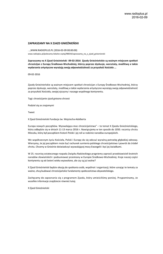 www.radioplus.pl 2016-02-09 ZAPRASZAMY NA X ZJAZD GNIEŹNIEŃSKI . .,WWW.RADIOPLUS.PL (2016-02-09 00:00:00) www.radioplus.pl/polecamy-lokalne-czytaj/98034/zapraszamy_na_x_zjazd_gnieznienski Zapraszamy na X Zjazd Gnieźnieński 09-02-2016 Zjazdy Gnieźnieńskie są ważnym miejscem spotkań chrześcijan z Europy Środkowo-Wschodniej, którzy poprzez dyskusje, warsztaty, modlitwę a także wydarzenia artystyczne wyrażają swoją odpowiedzialność za przyszłość Kościoła ... 09-02-2016 Zjazdy Gnieźnieńskie są ważnym miejscem spotkań chrześcijan z Europy Środkowo-Wschodniej, którzy poprzez dyskusje, warsztaty, modlitwę a także wydarzenia artystyczne wyrażają swoją odpowiedzialność za przyszłość Kościoła, swojej ojczyzny i naszego wspólnego kontynentu. Tagi: chrześcijanie zjazd gniezno chrzest Podziel się ze znajomymi Tweet X Zjazd Gnieźnieński Fundacja św. Wojciecha-Adalberta Europa nowych początków. Wyzwalająca moc chrześcijaństwa” – to temat X Zjazdu Gnieźnieńskiego, który odbędzie się w dniach 11-13 marca 2016 r. Nawiązujemy w ten sposób do 1050. rocznicy chrztu Mieszka, który był początkiem historii Polski i jej roli w rodzinie narodów europejskich. We współczesnym życiu Kościoła, Polski i Europy da się odczuć wyraźną potrzebę głębokiej odnowy. Wierzymy, że jej początkiem może być rachunek sumienia polskiego chrześcijaństwa i powrót do źródeł chrztu. Chcemy w Gnieźnie doświadczyć wyzwalającej mocy Ewangelii i być jej świadkami. W 25. rocznicę ostatecznego rozpadu Związku Radzieckiego pragniemy zaprosić przedstawicieli bratnich narodów słowiańskich i podsumować przemiany w Europie Środkowo-Wschodniej. Kraje naszej części kontynentu są od ćwierć wieku wyzwolone, ale czy są już wolne? X Zjazd Gnieźnieński będzie okazją do spotkania osób, wspólnot i organizacji, które uznając te tematy za ważne, chcą budować chrześcijańskie fundamenty społeczeństwa obywatelskiego. Zachęcamy do zapoznania się z programem Zjazdu, który umieściliśmy poniżej. Przypominamy, że wszelkie informacje znajdziecie również tutaj. X Zjazd Gnieźnieński www.radioplus.pl 2016-02-09 EUROPA NOWYCH POCZĄTKÓW Wyzwalająca moc chrześcijaństwa 11-13 marca 2016 r. program Zjazdu (może podlegać zmianom) Piątek, 11 marca 11.00 Modlitwę prowadzą kapelani Zjazdu z trzech tradycji chrześcijańskich Otwarcie Zjazdu Marta Titaniec, przewodnicząca Komitetu Organizacyjnego X Zjazdu Abp Wojciech Polak, metropolita gnieźnieński, prymas Polski, przewodniczący Zjazdów Gnieźnieńskich Abp Jeremiasz, prawosławny arcybiskup wrocławski i szczeciński, prezes Polskiej Rady Ekumenicznej Przemówienie Prezydenta RP Andrzeja Dudy (niepotwierdzone) 11.30 sesja plenarna Nowe początki: chrzest Mieszka, chrzest Polski, chrzest nasz – referat: prof. Jerzy Kłoczowski Co zrobiliśmy/zrobimy z naszym chrztem? – dyskusja ekumeniczna biskupów trzech tradycji chrześcijańskich: bp prof. Jeremiasz (Kościół prawosławny), bp dr hab. Marcin Hintz (Kościół ewangelicko-augsburski), bp dr hab. Grzegorz Ryś (Kościół rzymskokatolicki) prowadzenie: Zbigniew Nosowski 13.00 Przerwa obiadowa podczas przerwy obiadowej: Otwarcie wystawy w Muzeum Początków Państwa Polskiego „Chrzest – Św. Wojciech – Polska. Dziedzictwo średniowiecznego Gniezna” Spotkanie Prezydenta RP Andrzeja Dudy ze Zwierzchnikami i reprezentantami Kościołów chrześcijańskich uczestniczących w Zjeździe 15.00 sesja plenarna Wiara, czyli wolność – referat: ks. prof. Tomáš Halík, Uniwersytet Karola, Praga – świadectwa: dr Małgorzata Wałejko, pedagog, teolog, Uniwersytet Szczeciński ks. dr Jan Kaczkowski, www.radioplus.pl 2016-02-09 Puckie Hospicjum p.w. św. Ojca Pio prowadzenie: Jarema Piekutowski, socjolog 16.30 Przerwa 17.00 spotkania w małych grupach warsztatowych Warsztaty chrześcijańskiej wolności (część pierwsza) 19.00 Kolacja 20.00 w katedrze gnieźnieńskiej ekumeniczne nabożeństwo dziękczynno-pokutne za 1050 lat wiary chrześcijańskiej w Polsce Rachunek sumienia polskiego chrześcijaństwa (homilia: bp Grzegorz Ryś, historyk Kościoła, biskup pomocniczy archidiecezji krakowskiej) Sobota, 12 marca 9.30 sesje plenarne (spotkania równolegle w dwóch salach) Aula I LO Odkrycie małżeństwa jest przed nami – dyskusja panelowa: dr Jerzy Grzybowski, Stowarzyszenie Spotkania Małżeńskie Maria Hildingsson, Europejska Federacja Stowarzyszeń Rodzin Katolickich FAFCE Agata i Krzysztof Jankowiakowie, Ruch Światło-Życie prof. Stephan Kampowski, Papieski Instytut Studiów nad Małżeństwem i Rodziną im. Jana Pawła II Dariusz Piórkowski SJ, duszpasterz współpracujący z ruchem Małżeńskie Drogi prowadzenie: dr hab. Marek Rymsza, Laboratorium „Więzi”, Equipes Notre Dame Aula IKE UAM Ekonomia bez wykluczenia – referat: prof. Paul H. Dembinski, Obserwatorium Finansowe, Genewa Czy możliwa jest inna gospodarka? – dyskusja panelowa: prof. Andrzej Blikle, , informatyk, przedsiębiorca, moznainaczej.com.pl prof. Krzysztof Jasiecki, socjolog, Instytut Filozofii i Socjologii PAN Marcin Kędzierski, Uniwersytet Ekonomiczny w Krakowie, Dyrektor Programowy Centrum Analiz Klubu Jagiellońskiego Marek Tarnowski, prezes Zarządu Mokate S.A. www.radioplus.pl 2016-02-09 prowadzenie: Michał Drozdek, Instytut Chrześcijańsko-Demokratyczny im. I. Paderewskiego 11.00 Przerwa 11.30 sesje plenarne (spotkania równolegle w dwóch salach) Aula I LO Kultura i wiara: jak zszyć rozerwane przymierze? – referat: bp Michał Janocha, historyk sztuki, biskup pomocniczy warszawski Gdzie jest Bóg we współczesnej kulturze – dyskusja panelowa ks. dr hab. Andrzej Draguła, teolog, Zespół ds. Kompetencji Kulturowych Kościoła NCK Jakub Lubelski, prozaik, publicysta „Teologii Politycznej” Tadeusz Sobolewski, krytyk filmowy dr Irina Tatarowa, historyk sztuki prowadzenie: Tomasz Królak, Katolicka Agencja Informacyjn