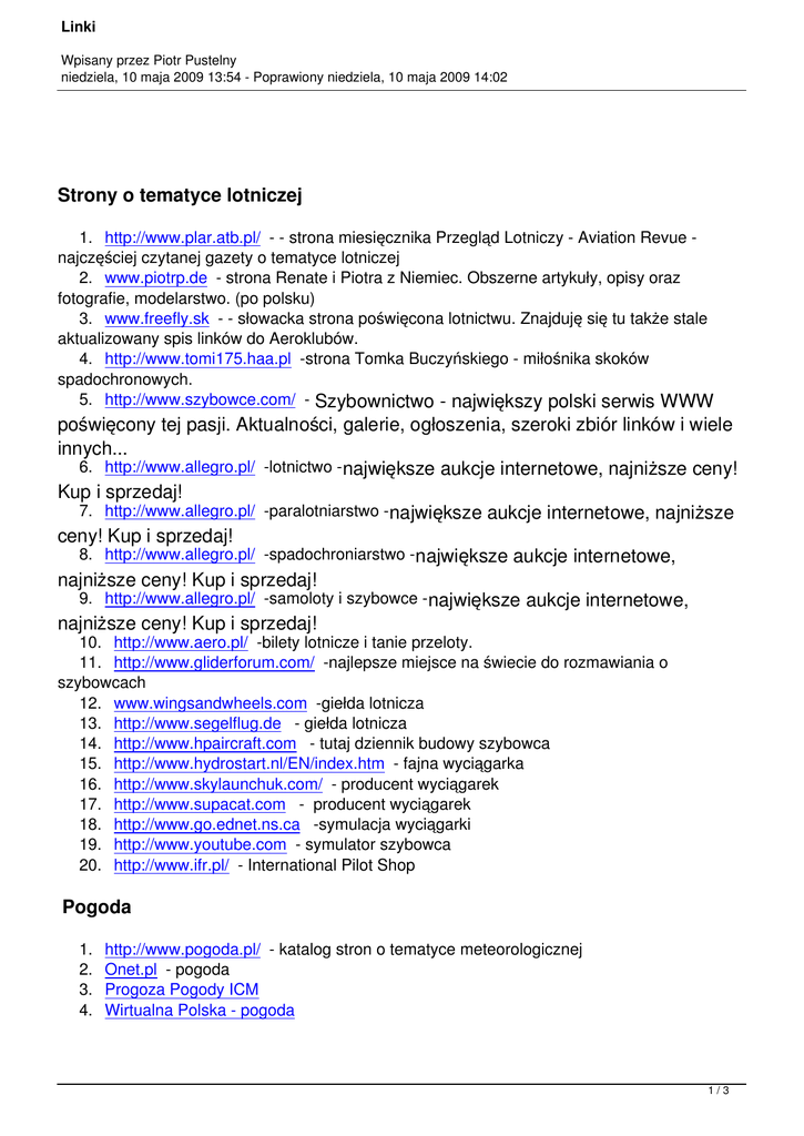 Linki Wpisany przez Piotr Pustelny niedziela, 10 maja 2009 13:54 - Poprawiony niedziela, 10 maja 2009 14:02 Strony o tematyce lotniczej 1. http://www.plar.atb.pl/ - - strona miesięcznika Przegląd Lotniczy - Aviation Revue najczęściej czytanej gazety o tematyce lotniczej 2. www.piotrp.de - strona Renate i Piotra z Niemiec. Obszerne artykuły, opisy oraz fotografie, modelarstwo. (po polsku) 3. www.freefly.sk - - słowacka strona poświęcona lotnictwu. Znajduję się tu także stale aktualizowany spis linków do Aeroklubów. 4. http://www.tomi175.haa.pl -strona Tomka Buczyńskiego - miłośnika skoków spadochronowych. 5. http://www.szybowce.com/ - Szybownictwo - największy polski serwis WWW poświęcony tej pasji. Aktualności, galerie, ogłoszenia, szeroki zbiór linków i wiele innych... 6. http://www.allegro.pl/ -lotnictwo - największe aukcje internetowe, najniższe ceny! Kup i sprzedaj! 7. http://www.allegro.pl/ -paralotniarstwo - największe aukcje internetowe, najniższe ceny! Kup i sprzedaj! 8. http://www.allegro.pl/ -spadochroniarstwo - największe aukcje internetowe, najniższe ceny! Kup i sprzedaj! 9. http://www.allegro.pl/ -samoloty i szybowce - największe aukcje internetowe, najniższe ceny! Kup i sprzedaj! 10. http://www.aero.pl/ -bilety lotnicze i tanie przeloty. 11. http://www.gliderforum.com/ -najlepsze miejsce na świecie do rozmawiania o szybowcach 12. www.wingsandwheels.com -giełda lotnicza 13. http://www.segelflug.de - giełda lotnicza 14. http://www.hpaircraft.com - tutaj dziennik budowy szybowca 15. http://www.hydrostart.nl/EN/index.htm - fajna wyciągarka 16. http://www.skylaunchuk.com/ - producent wyciągarek 17. http://www.supacat.com - producent wyciągarek 18. http://www.go.ednet.ns.ca -symulacja wyciągarki 19. http://www.youtube.com - symulator szybowca 20. http://www.ifr.pl/ - International Pilot Shop Pogoda 1. 2. 3. 4. http://www.pogoda.pl/ - katalog stron o tematyce meteorologicznej Onet.pl - pogoda Progoza Pogody ICM Wirtualna Polska - pogoda 1/3 Linki Wpisany przez Piotr Pustelny niedziela, 10 maja 2009 13:54 - Poprawiony niedziela, 10 maja 2009 14:02 5. IMGW 6. pogoda.info - prognoza pogody 7. Gazeta.pl - pogoda Aerokluby 1. Aeroklub Polski 2. Aeroklub Białostocki 3. Aeroklub Bielsko-Bialski 4. Aeroklub Bieszczadzki 5. Aeroklub Bydgoski 6. Aeroklub Częsochowski 7. Aeroklub Dolnośląski 8. Aeroklub Elbląski 9. Aeroklub Gdański 10. Aeroklub Gliwicki 11. Aeroklub Gorzowski 12. Aeroklub Grudziądzki 13. Aeroklub Jeleniogórski 14. Aeroklub Kielecki 15. Aeroklub Koniński 16. Aeroklub Koszaliński 17. Aeroklub Krainy Jezior - Kętrzyn 18. Aeroklub Kujawski 19. Aeroklub Krakowski / Aeroklub Krakowski 20. Aeroklub Leszczyński 21. Aeroklub Lubelski 22. Aeroklub Łódzki 23. Aeroklub Mielecki 24. Aeroklub Nowy Targ 25. Aeroklub Opolski 26. Aeroklub Orląt 27. Aeroklub Ostrowski 28. Aeroklub Pilski 29. Aeroklub Pińczowski 30. Aeroklub Poznański 31. Aeroklub Północnego Mazowsza 32. Aeroklub Radomski 33. Aeroklub Rybnickiego Okręgu Węglowego 34. Aeroklub Słupski 35. Aeroklub Stalowowolski 36. Aeroklub Suwalski 2/3 Linki Wpisany przez Piotr Pustelny niedziela, 10 maja 2009 13:54 - Poprawiony niedziela, 10 maja 2009 14:02 37. 38. 39. 40. 41. 42. 43. 44. 45. 46. 47. 48. Aeroklub Śląski Aeroklub Świdnik Aeroklub Szczeciński Aeroklub Warmińsko-Mazurski Aeroklub Warszawski Aeroklub Włocławski Aeroklub Wrocławski Aeroklub Zagłębia Miedziowego Aeroklub Ziemi Lubuskiej Centralna Szkoła Lotniczo-Techn. AP Centralna Szkoła Szybowcowa AP Górska Szkoła Szybowcowa AP "ŻAR " 3/3