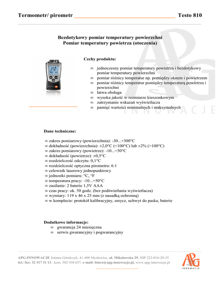 Termometr/ pirometr _______________________________________ Testo 810 ______________________________________________________________ Bezdotykowy pomiar temperatury powierzchni Pomiar temperatury powietrza (otoczenia) Cechy produktu: • • • ______________________ • • • • jednoczesny pomiar temperatury powietrza i bezdotykowy pomiar temperatury powierzchni pomiar różnicy temperatur np. pomiędzy oknem i powietrzem pomiar różnicy temperatur pomiędzy temperaturą powietrza i powierzchni łatwa obsługa wysoka jakość w rozmiarze kieszonkowym zatrzymanie wskazań wyświetlacza pamięć wartości minimalnych i maksymalnych Dane techniczne: • • • • • • • • • • • • • zakres pomiarowy (powierzchnia): -30...+300°C dokładność (powierzchnia): ±2,0°C (<100°C) lub ±2% (>100°C) zakres pomiarowy (powietrze): -10...+50°C dokładność (powietrze): ±0,5°C rozdzielczość odczytu: 0,1°C rozdzielczość optyczna pirometru: 6:1 celownik laserowy jednopunktowy jednostki pomiaru: °C, °F temperatura pracy: -10...+50°C zasilanie: 2 baterie 1,5V AAA czas pracy: ok. 50 godz. (bez podświetlania wyświetlacza) wymiary: 119 x 46 x 25 mm (z nasadką ochronną) w komplecie: protokół kalibracyjny, smycz, uchwyt do paska, baterie Dodatkowe informacje: • gwarancja 24 miesięczna • serwis gwarancyjny i pogwarancyjny ___________________________________________________________________________________ APG-INNOWACJE Jolanta Góralczyk, 41-400 Mysłowice, ul. Mikołowska 29, NIP 222-016-29-35 tel./ fax: 32 317 31 13, kom. 502 430 657, e-mail: [email protected], www.apg-innowacje.pl ___________________