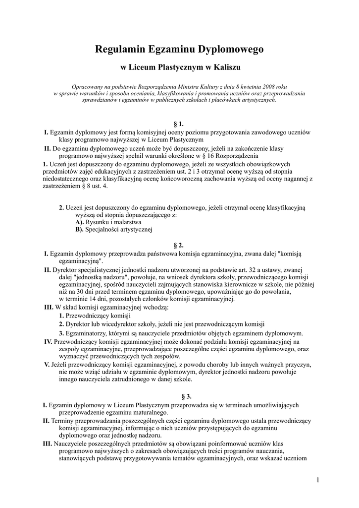 Regulamin Egzaminu Dyplomowego w Liceum Plastycznym w Kaliszu Opracowany na podstawie Rozporządzenia Ministra Kultury z dnia 8 kwietnia 2008 roku w sprawie warunków i sposobu oceniania, klasyfikowania i promowania uczniów oraz przeprowadzania sprawdzianów i egzaminów w publicznych szkołach i placówkach artystycznych. § 1. I. Egzamin dyplomowy jest formą komisyjnej oceny poziomu przygotowania zawodowego uczniów klasy programowo najwyższej w Liceum Plastycznym II. Do egzaminu dyplomowego uczeń może być dopuszczony, jeżeli na zakończenie klasy programowo najwyższej spełnił warunki określone w § 16 Rozporządzenia 1. Uczeń jest dopuszczony do egzaminu dyplomowego, jeżeli ze wszystkich obowiązkowych przedmiotów zajęć edukacyjnych z zastrzeżeniem ust. 2 i 3 otrzymał ocenę wyższą od stopnia niedostatecznego oraz klasyfikacyjną ocenę końcoworoczną zachowania wyższą od oceny nagannej z zastrzeżeniem § 8 ust. 4. 2. Uczeń jest dopuszczony do egzaminu dyplomowego, jeżeli otrzymał ocenę klasyfikacyjną wyższą od stopnia dopuszczającego z: A). Rysunku i malarstwa B). Specjalności artystycznej § 2. I. Egzamin dyplomowy przeprowadza państwowa komisja egzaminacyjna, zwana dalej "komisją egzaminacyjną". II. Dyrektor specjalistycznej jednostki nadzoru utworzonej na podstawie art. 32 a ustawy, zwanej dalej "jednostką nadzoru", powołuje, na wniosek dyrektora szkoły, przewodniczącego komisji egzaminacyjnej, spośród nauczycieli zajmujących stanowiska kierownicze w szkole, nie później niż na 30 dni przed terminem egzaminu dyplomowego, upoważniając go do powołania, w terminie 14 dni, pozostałych członków komisji egzaminacyjnej. III. W skład komisji egzaminacyjnej wchodzą: 1. Przewodniczący komisji 2. Dyrektor lub wicedyrektor szkoły, jeżeli nie jest przewodniczącym komisji 3. Egzaminatorzy, którymi są nauczyciele przedmiotów objętych egzaminem dyplomowym. IV. Przewodniczący komisji egzaminacyjnej może dokonać podziału komisji egzaminacyjnej na zespoły egzaminacyjne, przeprowadzające poszczególne części egzaminu dyplomowego, oraz wyznaczyć przewodniczących tych zespołów. V. Jeżeli przewodniczący komisji egzaminacyjnej, z powodu choroby lub innych ważnych przyczyn, nie może wziąć udziału w egzaminie dyplomowym, dyrektor jednostki nadzoru powołuje innego nauczyciela zatrudnionego w danej szkole. § 3. I. Egzamin dyplomowy w Liceum Plastycznym przeprowadza się w terminach umożliwiających przeprowadzenie egzaminu maturalnego. II. Terminy przeprowadzania poszczególnych części egzaminu dyplomowego ustala przewodniczący komisji egzaminacyjnej, informując o nich uczniów przystępujących do egzaminu dyplomowego oraz jednostkę nadzoru. III. Nauczyciele poszczególnych przedmiotów są obowiązani poinformować uczniów klas programowo najwyższych o zakresach obowiązujących treści programów nauczania, stanowiących podstawę przygotowywania tematów egzaminacyjnych, oraz wskazać uczniom 1 tematy prac dyplomowych, nie później niż na 5 miesięcy przed terminem egzaminu dyplomowego. § 4. I. Obserwatorami egzaminu dyplomowego mogą być przedstawiciele ministra właściwego do spraw kultury i ochrony dziedzictwa narodowego, jednostki nadzoru, szkół wyższych oraz związków zrzeszających artystów. II. Osoby, o których mowa w art. I, nie uczestniczą w przeprowadzaniu egzaminu dyplomowego ani w ustalaniu jego wyników. § 5. I. Egzamin dyplomowy obejmuje: 1. Część praktyczną polegającą na prezentacji i obronie pracy dyplomowej z zakresu odpowiednio kształconej specjalności artystycznej. Część praktyczna może obejmować ponadto prezentację prac z innych przedmiotów artystycznych (tzw. aneks), określonych w statucie szkoły i na warunkach określonych w tym statucie. 2. Część ustną z historii sztuki zdawaną na poziomie podstawowym, z zastrzeżeniem § 32 Rozporządzenia. II. Kolejność zdawania poszczególnych części egzaminu dyplomowego ustala przewodniczący komisji egzaminacyjnej. III. Realizacja pracy dyplomowej 1. Nauczyciele poszczególnych przedmiotów są obowiązani poinformować uczniów klas programowo najwyższych o zakresach obowiązujących treści programów nauczania, stanowiących podstawę przygotowywania tematów egzaminacyjnych, oraz wskazać uczniom tematy prac dyplomowych, nie później niż na 5 miesięcy przed terminem egzaminu dyplomowego. 2. Ogłoszenie tematów musi być udokumentowane wpisem w dzienniku zajęć lekcyjnych. 3. Czas przewidziany na realizację pracy dyplomowej może być różny w poszczególnych specjalnościach zgodnie z uwarunkowaniami techniczno-warsztatowymi. 4. Przebieg realizacji pracy dyplomowej jest udokumentowany w formie wpisów do protokółu egzaminu dyplomowego potwierdzonych podpisem ucznia i nauczyciela. 5. Liczba wymaganych konsultacji nie może być mniejsza niż cztery na różnych etapach realizacji pracy dyplomowej. 6. Realizacja pracy dyplomowej odbywa się wyłącznie na terenie pracowni szkolnych pod kontrolą nauczyciela. 7. Elementy niezbędne do realizacji i prezentacji pracy dyplomowej niemożliwe do przygotowania w pracowniach szkolnych mogą być wykonane za zgodą nauczyciela prowadzącego poza szkołą i wpisane do protokołu egzaminacyjnego ucznia. 8. Prace dyplomowe wraz z dokumentacją zostają zgłoszone do egzaminu w określonym terminie, nie później niż na dwa tygodnie przed częścią praktyczną egzaminów dyplomowych. Na podstawie protokółu przyjęcia pracy dyplomowej ucznia, Rada Pedagogiczna decyduje o dopuszczeniu do egzaminu dyplomowego. § 6. I. Laureat lub finalista olimpiady artystycznej jest zwolniony z części ustnej egzaminu dyplomowego. Zwolnienie jest równoznaczne z uzyskaniem oceny celującej z tej części egzaminu. § 7. I. Kolejność zdawania poszczególnych części egzaminu dyplomowego ustala przewodniczący komisji egzaminacyjnej. § 8. 2 I. Tematy egzaminacyjne dla części u