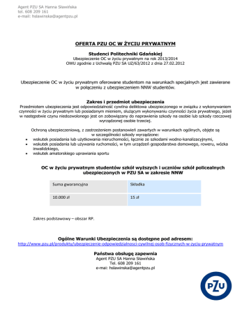 Agent PZU SA Hanna Sławińska tel. 608 209 161 e-mail: [email protected] OFERTA PZU OC W ŻYCIU PRYWATNYM Studenci Politechniki Gdańskiej Ubezpieczenie OC w życiu prywatnym na rok 2013/2014 OWU zgodnie z Uchwałą PZU SA UZ/63/2012 z dnia 27.02.2012 Ubezpieczenie OC w życiu prywatnym oferowane studentom na warunkach specjalnych jest zawierane w połączeniu z ubezpieczeniem NNW studentów. Zakres i przedmiot ubezpieczenia Przedmiotem ubezpieczenia jest odpowiedzialność cywilna deliktowa ubezpieczonego w związku z wykonywaniem czynności w życiu prywatnym lub posiadanym mieniem, służącym wykonywaniu czynności życia prywatnego, jeżeli w następstwie czynu niedozwolonego jest on zobowiązany do naprawienia szkody na osobie lub szkody rzeczowej wyrządzonej osobie trzeciej. Ochroną ubezpieczeniową, z zastrzeżeniem postanowień zawartych w warunkach ogólnych, objęte są w szczególności szkody wyrządzone: wskutek posiadania lub użytkowania nieruchomości, łącznie ze szkodami wodno-kanalizacyjnymi, wskutek posiadania lub używania ruchomości, w tym urządzeń gospodarstwa domowego, roweru, wózka inwalidzkiego, wskutek amatorskiego uprawiania sportu OC w życiu prywatnym studentów szkół wyższych i uczniów szkół policealnych ubezpieczonych w PZU SA w zakresie NNW Suma gwarancyjna Składka 10.000 zł 15 zł Zakres podstawowy – obszar RP. Ogólne Warunki Ubezpieczenia są dostępne pod adresem: http://www.pzu.pl/produkty/ubezpieczenie-odpowiedzialnosci-cywilnej-osob-fizycznych-w-zyciu-prywatnym Państwa obsługę zapewnia Agent PZU SA Hanna Sławińska Tel. 608 209 161 e-mai: [email protected]