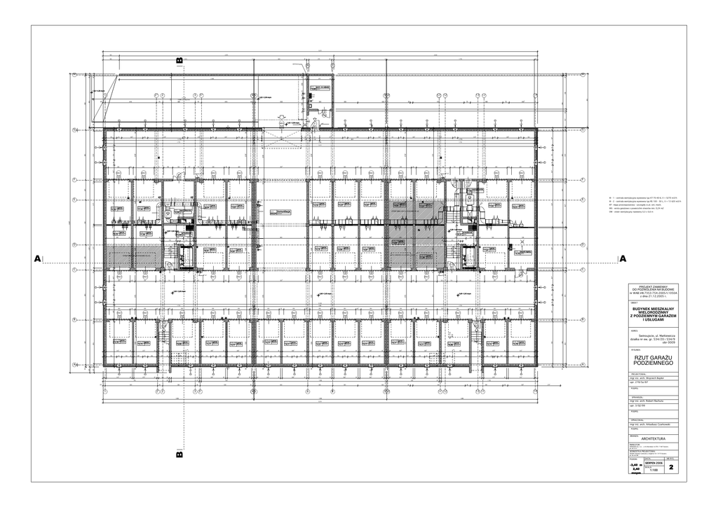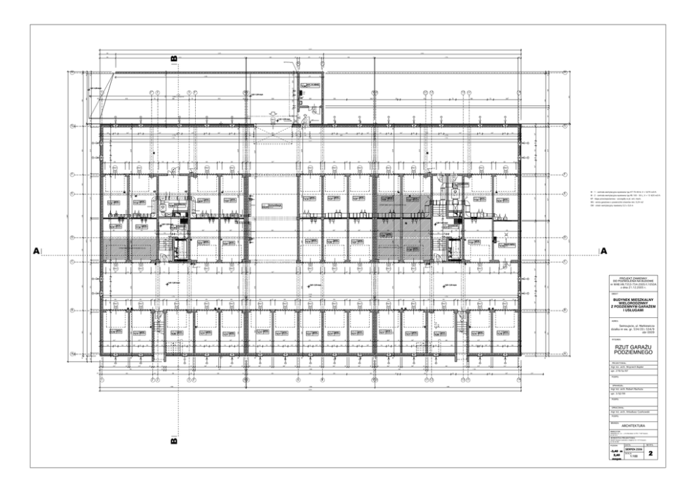5.211 2.573 630 25 275 dylatacja 5 1.770 38 7 155 25 6 630 25 275 25 H 206 2 248 25 25 5 25 155 1.613 25 25 195 H 2.443 B 195 0/1 pom. na odpady 10,88 gres 390 75 615 -3,22 = 2,58 mnpm 30 910 20 630 12 300 300 12 12" 630 30 14 13 13" 615 75 390 645 45 3405 75 660 +1,8 10% L=18,0 m 75 3" 25 200 25 150 128 615 3 40 2 12 555 255 620 660 2" 550 1 398 12 -1,42 = 4,38 mnpm 1 770 5 90 480 100 114 1 770 5 197 250 60 1535 5 801 1.585 141 2525 60 4185 60 2525 60 60 126 38 1.770 38 5 1.770 38 60 120 5745 5745 WG1 WG1 1675 104 250 HP 52 H 10 35 35 485 114 EI 60 50 250 WG1 WG1 0/7 wentylatornia 16,98 gres 0/G-08 garaz 14,84 beton komunikacja 0/2 656,94 beton 0/G-09 garaz 17,91 beton 240 0/G-10 garaz 17,65 beton 0/G-11 garaz 16,25 beton WG - wrota garażowe o powierzchni otworów min. 0,24 m2 225 290 25 350 25 25 105 250 60 20 250 338 50 625 250 250 5 55 45 30 60 250 120 A 300 255 Dźwig hydrauliczny 2 871 0/5 węzeł cieplny 14,19 gres 1000 kg 336 35 EI30 WG1 114 C 35 220 250 125 spadek 100% 150 325 13 osób HP 52 WG1 250 201 H 10 250 50 250 220 250 220 WG1 10 250 220 WG1 250 220 250 220 10 5675 50 WG1 4815 4815 0/G-21 garaz 17,64 beton 1675 5 50 WG1 12 12 65 345 250 110 150 85 60 30 OW 236 WG1 35 100 EI 60 WG1 25 135 300 0/G-20 garaz 17,90 beton 135 STROP OBNIŻONY DO POZIOMU USŁUG H 10 D 30 0/G-18 garaz 14,97 beton 120 25 6 x 19,0 27 0/G-17 garaz 14,96 beton 170 5365 0/G-16 garaz 14,19 beton 5365 0/G-15 garaz 14,97 beton szafa ster. dzwigu 0/4 przedsionek 22,31 gres 235 PROJEKT ZAMIENNY DO POZWOLENIA NA BUDOWE 60 25 200 5 25 160 2925 20 25 2925 25 13 osób spadek 100% 114 275 1000 kg 25 110 25 5365 0/G-14 garaz 18,03 beton HP 52 250 605 0/G-19 garaz 14,84 beton 250 220 Dźwig hydrauliczny 300 201 220 10 250 60 25 25 WG1 250 25 60 OW 35 WG1 2925 20 250 220 1675 35 250 220 35 100 EI 60 60 170 135 300 STROP OBNI˚ONY DO POZIOMU US¸UG C 25 3525 25 135 6 x 19,0 27 5365 5115 5115 2 871 170 30 25 D 120 5365 364 10 1 525 25 25 160 225 0/6 przedsionek 13,29 gres 340 540 25 135 30 12 12 12 1.0355 12 25 12 12 12 540 -2,26 = 3,54 mnpm szafa ster. dzwigu 25 KP - klapa przeciwpożarowa - szczegóły w pt. ent. mech. OW - otwór wentylacyjny nawiewny 0,3 x 0,6 m -2,26 = 3,54 mnpm 0/G-13 garaz 17,39 beton 300 600 575 120 nr WAB.VIII.7353-754-2005/I.1050A z dnia 21.12.2005 r. 60 OBIEKT 1.770 WG1 45 104 45 250 WG1 EI30 60 250 35 WG1 WG1 B BUDYNEK MIESZKALNY WIELORODZINNY Z PODZIEMNYM GARAŻEM I USŁUGAMI 35 WG1 250 1675 WG1 126 35 WG1 250 250 220 WG1 60 220 250 250 45 200 5 90 55 250 220 250 OW 575 575 625 250 250 220 WG1 50 10 WG1 5 250 220 625 250 250 55 10 WG1 250 250 220 WG1 50 250 220 WG1 1.585 5 50 250 220 250 10 60 250 220 250 10 90 121 200 220 10 35 35 5 250 250 220 45 250 220 104 WG1 250 WG1 45 250 220 250 250 220 60 250 220 1675 250 B 60 30 5.135 1 770 35 -3,40 = 2,40 mnpm 575 575 575 575 120 -3,40 = 2,40 mnpm 60 OW 575 600 -3,40 = 2,40 mnpm 60 30 W - 2 - centrala wentylacyjna wywiewna typ RS 100 - 50 L, V = 13 620 m3/h STROP OBNI˚ONY DO POZIOMU US¸UG W-1 0/G-12 garaz 15,35 beton W - 1 - centrala wentylacyjna wywiewna typ KT 70-40-6, V = 5270 m3/h E W-2 5415 0/G-07 garaz 14,97 beton 5415 5365 0/G-06 garaz 15,07 beton 0/G-05 garaz 14,19 beton 5365 0/G-04 garaz 14,97 beton 0/G-03 garaz 18,04 beton 0/G-02 garaz 17,40 beton 0/G-01 garaz 15,35 beton 5365 5365 KP 5365 5115 5115 3655 240 KP F EI 0/3 wentylatornia 7,32 gres E 5 25 35 WG1 156 1675 WG1 250 35 WG1 60 250 220 250 250 220 45 201 25 5 30 90 250 201 625 250 100 50 250 220 250 10 50 220 5675 50 250 WG1 5 250 220 WG1 45 250 220 200 H 250 10 HP 52 EI 60 250 220 250 10 110 250 220 107 250 220 150 150 WG1 10 WG1 108 38 38 2785 60 5 5745 5745 5745 5745 115 250 220 250 0 5 30 0 60 60 120 1675 50 35 F 3.5895 60 38 2775 600 114 5745 100 1675 480 OW 90 60 30 250 G 38 5 60 60 30 25 A OW 30 60 30 60 30 60 30 60 60 30 30 60 201 38 0 5 OW 60 1415 OW OW 60 OW 60 2525 60 220 450 2785 60 OW OW 30 250 220 OW 600 4185 60 OW D 5.211 60 30 5745 OW 38 2525 60 155 210 -3,42 = 2,38 mnpm 38 38 38 38 126 1675 38 SEG 60 30 60 30 OW 100 OW 60 30 75 60 30 60 30 38 5 0 0 5 38 65 G OW OW 197 EI30 OW EI30 126 60 2725 20 126 1065 20 60 25 125 106 150 25 335 203 2925 25 60 72 25 116 60 2925 20 1165 20 116 60 5 25 1165 5 25 2925 25 25 116 60 2925 20 116 20 116 25 60 1165 275 25 109 60 2925 25 1065 25 106 60 0/G-32 garaz 14,77 beton 0/G-31 garaz 14,77 beton 0/G-30 garaz 14,77 beton 2925 20 126 20 104 60 25 1585 5 2925 25 25 0/G-33 garaz 14,77 beton 116 2925 20 1165 60 20 116 25 60 1165 485 25 72 0/G-36 garaz 15,78 beton 0/G-35 garaz 13,75 beton 0/G-34 garaz 16,86 beton 60 2725 25 353 25 106 19 3125 20 41 1065 20 126 60 RYSUNEK: 38 126 38 3125 125 630 1 60 2' OW 25 335 25 25 335 25 390 2 60 3 3' 1 808 2925 25 2925 OW 25 275 5 30 5 2925 OW 25 5 25 300 8 7 1.590 5.210 630 20 30 910 2925 OW 485 2725 25 25 3125 38 12' 60 12 390 13 13' 1.808 38 mgr inż. arch. Wojciech Bajdor 1 153 630 RZUT GARAŻU PODZIEMNEGO PROJEKTOWAŁ: OW 20 A 255 30 60 60 OW 25 30 60 30 OW 2925 630 300 6 30 60 38 60 OW 20 30 60 30 30 OW 2925 25 1.590 630 45 60 38 OW 2925 20 60 30 30 60 OW 5 25 630 630 60 38 OW 2925 20 30 38 60 30 60 30 OW 25 793 255 30 60 OW 2725 20 upr. 278/Sz/87 60 3555 2745 14 PODPIS: SPRAWDZIŁ: mgr inż. arch. Robert Rachuta upr. 3/SZ/99 PODPIS: OPRACOWAŁ: mgr inż. arch. Arkadiusz Czarkowski PODPIS: BRANŻA: ARCHITEKTURA INWESTOR: SIEMASZKO Sp. z o.o. , ul. Ks Warcisława I nr 27D/1, 71-667 Szczecin, tel. 422 16 51 B OW 38 60 30 60 30 38 38 38 255 685 685 38 90 A Swinoujscie, ul. Markiewicza dzialka nr ew. gr. 534/20 i 534/9 obr 0009 505 0/G-29 garaz 14,01 beton 505 530 0/G-28 garaz 14,77 beton 530 0/G-27 garaz 14,77 beton 540 14 x 17,5 28,5 25 0/G-26 garaz 14,77 beton 530 0/G-25 garaz 14,77 beton 0/G-24 garaz 16,86 beton 0/G-23 garaz 13,75 beton 540 14 x 17,5 28,5 3125 38 38 530 505 0/G-22 garaz 15,78 beton 505 540 ADRES: JEDNOSTKA PROJEKTOWA: ASUMPT Arkadiusz Czarkowski, ul. Bagienna 12/1, 70-772 Szczecin, tel. 502 542 586 POZIOM: -3,40 m 2,40 mnpm DATA: SIERPIEN 2006 SKALA: 1:100 NR RYS. 2