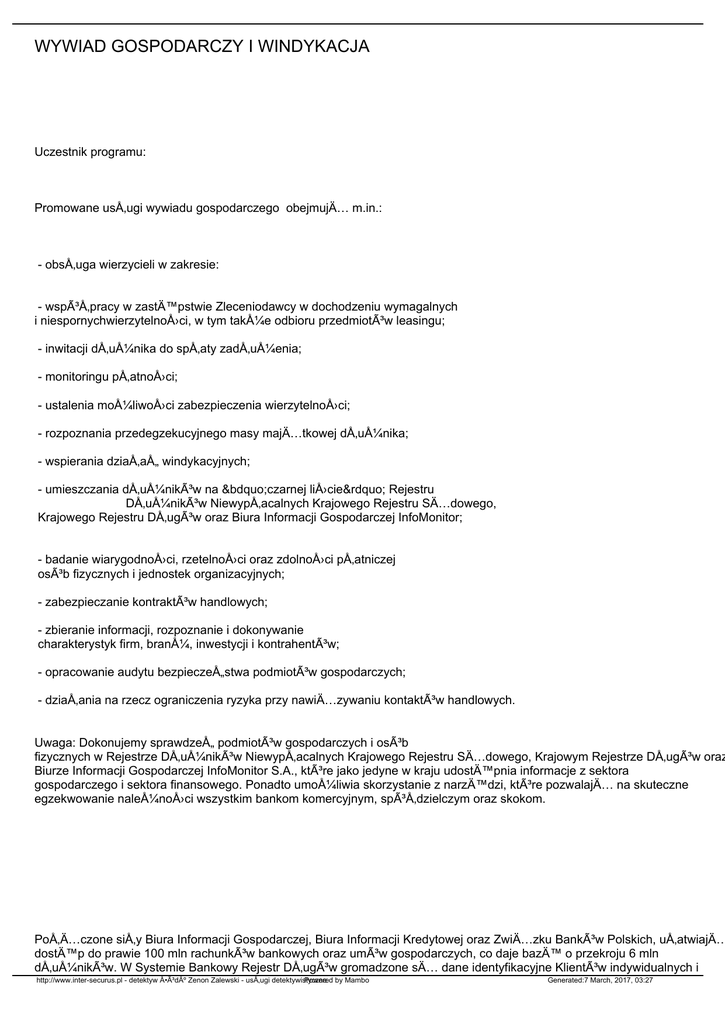 WYWIAD GOSPODARCZY I WINDYKACJA Uczestnik programu: Promowane usÅ‚ugi wywiadu gospodarczego obejmujÄ… m.in.: - obsÅ‚uga wierzycieli w zakresie: - współpracy w zastÄ™pstwie Zleceniodawcy w dochodzeniu wymagalnych i niespornychwierzytelnoÅ›ci, w tym także odbioru przedmiotów leasingu; - inwitacji dÅ‚użnika do spÅ‚aty zadÅ‚użenia; - monitoringu pÅ‚atnoÅ›ci; - ustalenia możliwoÅ›ci zabezpieczenia wierzytelnoÅ›ci; - rozpoznania przedegzekucyjnego masy majÄ…tkowej dÅ‚użnika; - wspierania dziaÅ‚aÅ„ windykacyjnych; - umieszczania dÅ‚użników na „czarnej liÅ›cie” Rejestru DÅ‚użników NiewypÅ‚acalnych Krajowego Rejestru SÄ…dowego, Krajowego Rejestru DÅ‚ugów oraz Biura Informacji Gospodarczej InfoMonitor; - badanie wiarygodnoÅ›ci, rzetelnoÅ›ci oraz zdolnoÅ›ci pÅ‚atniczej osób fizycznych i jednostek organizacyjnych; - zabezpieczanie kontraktów handlowych; - zbieranie informacji, rozpoznanie i dokonywanie charakterystyk firm, branż, inwestycji i kontrahentów; - opracowanie audytu bezpieczeÅ„stwa podmiotów gospodarczych; - dziaÅ‚ania na rzecz ograniczenia ryzyka przy nawiÄ…zywaniu kontaktów handlowych. Uwaga: Dokonujemy sprawdzeÅ„ podmiotów gospodarczych i osób fizycznych w Rejestrze DÅ‚użników NiewypÅ‚acalnych Krajowego Rejestru SÄ…dowego, Krajowym Rejestrze DÅ‚ugów oraz Biurze Informacji Gospodarczej InfoMonitor S.A., które jako jedyne w kraju udostÄ™pnia informacje z sektora gospodarczego i sektora finansowego. Ponadto umożliwia skorzystanie z narzÄ™dzi, które pozwalajÄ… na skuteczne egzekwowanie należnoÅ›ci wszystkim bankom komercyjnym, spółdzielczym oraz skokom. Połączone siÅ‚y Biura Informacji Gospodarczej, Biura Informacji Kredytowej oraz ZwiÄ…zku Banków Polskich, uÅ‚atwiajÄ… dostÄ™p do prawie 100 mln rachunków bankowych oraz umów gospodarczych, co daje bazÄ™ o przekroju 6 mln dÅ‚użników. W Systemie Bankowy Rejestr DÅ‚ugów gromadzone sÄ… dane identyfikacyjne Klientów indywidualnych i http://www.inter-securus.pl - detektyw ŕódź Zenon Zalewski - usÅ‚ugi detektywistyczne Powered by Mambo Generated:7 March, 2017, 03:27 przedsiÄ™biorców, niewywiÄ…zujÄ…cych siÄ™ ze swoich zobowiÄ…zaÅ„ wobec banków. Opóźnienie w spÅ‚acie zadÅ‚uÅ powinno wynosić minimum 2 miesiÄ…ce, a łączna kwota zalegÅ‚oÅ›ci powinna opiewać na co najmniej 200 zÅ‚ w przypa konsumentów oraz co najmniej 500 zÅ‚ w przypadku przedsiÄ™biorców. NarzÄ™dzia prewencyjne oraz 10-letnia blokada finansowa, skutecznie i bezprowizyjnie pozwoli na odzyskanie nie tylko aktualnych dÅ‚ugów, ale także sprzed 5, 10 a nawet 15 lat. Warto podkreÅ›lić, iż blokada obejmuje, m.in. kredyty, leasingi, raty, karty kredytowe, limity debetowe, podpisywanie umów cywilno-prawnych, umów najmu, telefoniÄ™ komórkowÄ… i stacjonarnÄ…, umowy z dostawcami gazu i energii oraz zakupy przez internet. Aktywnie uczestniczymy w licznych projektach o zasiÄ™gu miÄ™dzynarodowym, np. w ramach Polsko-ChiÅ„skiej Izby Gospodarczej, zrzeszajÄ…cej ponad 250 firm czÅ‚onkowskich. Niedawno uruchomiony zostaÅ‚ specjalny serwis www.chinskiraport.pl, dziÄ™ki któremu można zweryfikować wiarygodność chiÅ„skiej firmy (podobnie jak w Polsce za poÅ›rednictwem Krajowego Rejestru SÄ…dowego). Czekamy na zgÅ‚oszenia polskich podmiotów gospodarczych i osób fizycznych poszkodowanych przez chiÅ„skich kontrahentów lub pragnÄ…cych uwiarygodnić partnera z Chin przed podpisaniem umowy i podjÄ™ciem współpracy. DziaÅ‚amy także na rzecz przedsiÄ™biorców chiÅ„skich, poszkodowanych przez nierzetelne polskie firmy, wspierajÄ…c je dziaÅ‚aniami w zakresie dochodzenia wymagalnych wierzytelnoÅ›ci, monitorowania pÅ‚atnoÅ›ci oraz ustalaniu skÅ‚adników stanu majÄ…tku dÅ‚użników. ZAPRASZAMY DO KORZYSTANIA Z NASZYCH USÅ•UG - WYWIADU GOSPODARCZEGO http://www.inter-securus.pl - detektyw ŕódź Zenon Zalewski - usÅ‚ugi detektywistyczne Powered by Mambo Generated:7 March, 2017, 03:27