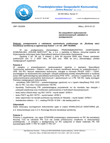 Przedsiębiorstwo Gospodarki Komunalnej „Dolina Baryczy” sp. z o.o. 56-300 Milicz, Rynek 21 tel./fax 071 38 40 987 www.pgkdolinabaryczy.pl JRP-19/2009 e-mail: [email protected] Milicz, 2010-01-21 Do wszystkich wykonawców zainteresowanych udziałem w postępowaniu Dotyczy: postępowania o udzielenie zamówienia publicznego na „Budowę sieci kanalizacji sanitarnej w aglomeracji Sułów” ( nr ref. JRP-19/2009) W ww. postępowaniu Zamawiający, PRZEDSIĘBIORSTWO GOSPODARKI KOMUNALNEJ „DOLINA BARYCZY” Sp. z o.o. z siedzibą w Miliczu, otrzymał pytania od Wykonawców dotyczące treści Specyfikacji Istotnych Warunków Zamówienia. Zgodnie z art. 38 ust. 2 ustawy z dnia 29 stycznia 2009 roku Prawo zamówień publicznych (Dz. U. z 2007 roku, Nr 223, poz. 1655 ze zm.), Zamawiający udziela następujących wyjaśnień: Pytanie 2 W związku z przewidywanym zastosowaniem zgodnie z zapisami Specyfikacji Technicznej wykonania i Odbioru robót do budowy kanalizacji tłocznej rur polietylenowych z OPE 100 RC- których właściwości techniczne, nieujęte w normach PN-EN 12021 i 13244, pozwalające na stosowanie bez podsypki i obsypki piaskowej zostały sklasyfikowane w wydanej przez DIN ogólnodostępnej specyfikacji technicznej PAS 1075 – prosimy o wyjaśnienie, czy dla udokumentowania parametrów technicznych i jakościowych rur z PE 100 RC, będą wymagać Państwo następujących dokumentów: - certyfikatu DIN CERTCO – potwierdzającego zgodność rur z typem klasyfikacji PAS 1075 dla rur RC: rury dwu i trzywarstwowe 100 RC - Aprobaty Technicznej ITB: potwierdzającej przydatność rur do montażu bez obsypki i podsypki piaskowej oraz możliwości zastosowania w technikach bezwykopowych - testu karbu (Notch-test): wg ISO 13479 – wynik badań >8760 h - testu FNCT wg ISO 16770 – wynik badań >8760 h - testu odporności na naciski punktowe wg metody dr Hessela – wynik badań >8760 h - świadectwa odbioru – 3.1., według PN EN 10 204 – dla każdej partii rur. Odpowiedź Zapis dotyczący wymaganych dokumentów ujęto w części KANALIZACJA SANITARNA pkt. 2.2. Dokumentacja oraz 2.3.4. Rurociągi tłoczne kanalizacji sanitarnej. Pytanie 3: Prosimy o wyjaśnienie, czy zapis STWIORB przewidujący zastosowanie rur RC dla kanalizacji tłocznej 13,6 na ciśnienie PN 12,5 nie został umieszczony omyłkowo w dokumentacji przetargowej – w związku z dostępnością rur RC wyłącznie w klasie materiału PE 100 typoszeregów SDR 11 PN 16 I SDR 17 PN 10? Sąd Rejonowy Wrocław – Fabryczna KRS 0000255485, Kapitał zakładowy - 58 091 000,00 zł Konto B.S. Milicz 49 9582 0000 2000 0011 5414 0001, NIP: 916-13-54-050 Odpowiedź Zapis w części KANALIZACJA SANITARNA 2.3.4. Rurociągi tłoczne kanalizacji sanitarnej informuje o stosowaniu rur PE100 PN10 lub PN12,5, SDR17 lub SDR11. Pytanie 4: Czy w wypadku realizacji przewiertów dopuszczają Państwo zamienne w stosunku do użycia rur stalowych jako osłonowych (do których wciągane będą rury przewodowe) zastosowanie rur przewodowych polietylenowych z PE 100 RC z dodatkowym płaszczem polipropylenowym (typ 3 wg ogólnodostępnej klasyfikacji PAS 1075) przeznaczonych do technik bezwykopowych o właściwościach technicznych udokumentowanych poprzez: - Aprobatę Techniczną ITB: potwierdzającą przydatność rur do montażu bez obsypki i podsypki piaskowej oraz możliwości zastosowania w technikach bezwykopowych - test karbu (Notch-test): wg ISO 13479 – wynik badań >8760 h - test FNCT wg ISO 16770 – wynik badań >8760 h - testu odporności na naciski punktowe wg metody dr Hessela – wynik badań >8760 h - certyfikat DIN CERTCO (lub równoważnego TUV SUD) wydanego przez niezależny akredytowany instytut (potwierdzający zgodność rur z typem 3 według klasyfikacji PAS 1075 dla rur RC) - świadectwa odbioru – 3.1., według PN EN 10 204 – dla każdej partii rur. Odpowiedź Informacje dotyczące realizacji przewiertów zawarto w części BUDOWA RUROCIĄGÓW KANALIZACJI SANITARNEJ METODĄ BEZWYKOPOWĄ pkt. 2 Materiały. Pytanie 5 Zwracamy się z wnioskiem o udostępnienie na stronie internetowej załączników do IDW dla w/w przetargu w wersji WORD. Umożliwi nam to sprawniejsze i rzetelniejsze przygotowanie dla Państwa oferty. Odpowiedź Zamawiający udostępni na swojej stronie internetowej www.pgkdolinabaryczy.pl załączniki do IDW w wersji MS WORD. Wykonawca nie może dokonywać w treści tych dokumentów jakichkolwiek zmian. Prezes Zarządu /-/ Władysław Szydełko Sąd Rejonowy Wrocław – Fabryczna KRS 0000255485, Kapitał zakładowy - 58 091 000,00 zł Konto B.S. Milicz 49 9582 0000 2000 0011 5414 0001, NIP: 916-13-54-050