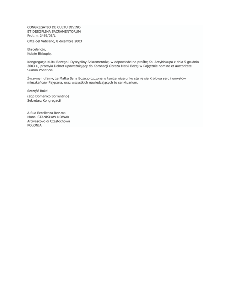 CONGREGATIO DE CULTU DIVINO ET DISCIPLINA SACRAMENTORUM Prot. n. 2439/03/L Citta del Vaticano, 8 dicembre 2003 Ekscelencjo, Księże Biskupie, Kongregacja Kultu Bożego i Dyscypliny Sakramentów, w odpowiedzi na prośbę Ks. Arcybiskupa z dnia 5 grudnia 2003 r., przesyła Dekret upoważniający do Koronacji Obrazu Matki Bożej w Pajęcznie nomine et auctoritate Summi Pontificis. Życzymy i ufamy, że Matka Syna Bożego czczona w tymże wizerunku stanie się Królowa serc i umysłów mieszkańców Pajęczna, oraz wszystkich nawiedzających to sanktuarium. Szczęść Boże! (abp Domenico Sorrentino) Sekretarz Kongregacji A Sua Eccellenza Rev.ma Mons. STANISŁAW NOWAK Arcivescovo di Częstochowa POLONIA