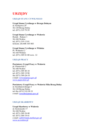 URZĘDY URZĄD STANU CYWILNEGO Urząd Stanu Cywilnego w Brzegu Dolnym ul. Kolejowa 29 56-120 Brzeg Dolny tel. (071) 319 79 59 Urząd Stanu Cywilnego w Wołowie Rynek - Ratusz 1 56-100 Wołów tel. (071) 319 13 01 tel.kom. (0) 608 345 883 Urząd Stanu Cywilnego w Wińsku Pl. Wolności 2 56-160 Wińsko tel. (071) 389 81 00 wew. 12 URZĄD PRACY Powiatowy Urząd Pracy w Wołowie pl. Piastowski 2 56-100 Wołów tel. (071) 389 48 10 tel. (071) 389 19 90 fax (071) 389-26-55 e-mail: [email protected] www.pupwolow.pl Powiatowy Urząd Pracy w Wołowie Filia Brzeg Dolny ul. Kochanowskiego 5 56-120 Brzeg Dolny tel./fax (071) 319 50 33 e-mail: [email protected] URZĄD SKARBOWY Urząd Skarbowy w Wołowie ul. Kościuszki 17 56-100 Wołów tel. (071) 389 24 40 tel. (071) 389 19 41 e-mail: [email protected] www.us.wolow.pl URZĄD POCZTOWY Urząd Pocztowy w Wołowie ul. Wojska Polskiego36 56-100 Wołów tel. (071) 380 91 62 tel. (071) 380 91 63 Urząd Pocztowy w Wińsku ul. Marsz. Piłsudskiego 21 56-160 Wińsko tel. (071) 380 91 61 fax (071) 380 82 91 Urzędy Pocztowe w Brzegu Dolnym Urząd Pocztowy 1 ul. Kolejowa 17 56-120 Brzeg Dolny tel. (071) 319 50 28 – naczelnik Urząd Pocztowy 3 ul. Zwycięstwa 9 56-120 Brzeg Dolnym tel. (071) 319 59 16 – naczelnik Urząd Pocztowy 4 ul. Osiedlowa 1 56-120 Brzeg Dolnym tel. (071) 319 55 35 – naczelnik POZOSTAŁE URZĘDY Sąd Rejonowy w Wołowie ul. Reja 11 56-100 Wołów tel. (071) 380 81 02 fax (071) 380 81 39 Sąd Rejonowy w Wołowie VI Wydział Grodzki ul. Rynek 26 56-100 Wołów tel./fax (071) 380 90 42 Komornik Sądowy w Wołowie ul. Zaułek Zielony 15 56-100 Wołów tel. (071) 389 42 25 fax (071) 389 56 31 e-mail: [email protected] Prokuratura Rejonowa w Wołowie ul. Wojska Polskiego 2 56-100 Wołów tel. (071) 389 36 60 fax (071) 389 23 12 Powiatowa Stacja Sanitarno-Epidemiologiczna ul. Marsz. Piłsudskiego 36 56-100 Wołów tel./ fax (071) 389 28 56 e-mail: [email protected] Agencja Restrukturyzacji i Modernizacji Rolnictwa - Biuro Powiatowe ul. Zaułek Zielony 20 56-100 Wołów tel. (071) 389 59 46 fax (071) 389 59 90 Powiatowy Inspektorat Nadzoru Budowlanego Pl. Piastowski 2 56-100 Wołów tel. (071) 389 53 66 Powiatowy Inspektorat Weterynarii ul. M. Skłodowskiej-Curie 9 56-100 Wołów tel. (071) 389 27 93 Wojewódzki Inspektorat Inspekcji Ochrony Roślin i Nasiennictwa we Wrocławiu. Oddział Terenowy Pl. Piastowski 2 56-100 Wołów tel./fax (071) 389 90 11 POLICJA Komenda Powiatowa Policji w Wołowie ul. Marsz. Piłsudskiego 23 56-100 Wołów tel. (071) 389 24 08 tel./fax (071) 389 59 97 www.wolow.policja.gov.pl Komenda Powiatowa Policji w Wołowie. Rewir Dzielnicowy Pl. Wolności 1 56-160 Wińsko tel. (071) 389 80 07 Komenda Powiatowa Policji w Wołowie. Rewir Dzielnicowy ul. M.L. Willmanna 42 56-110 Lubiąż tel. (071) 389 71 07 Komisariat Policji w Brzegu Dolnym ul. Al. Jerozolimskie 49 56-120 Brzeg Dolny tel. (071) 319 50 38 tel./fax(071) 319 50 37 STRAŻ Komenda Powiatowa Państwowej Straży Pożarnej w Wołowie ul. Wojska Polskiego 38 56-100 Wołów tel. (071) 389 27 02 fax (071) 389 11 90 http://www.strazwolow.cba.pl/ Ochotnicza Straż Pożarna ul. Odrodzenia 19 56-120 Brzeg Dolny tel. 71 319 58 49 Numery alarmowe: 998, 112 oraz 663890017 (awaryjny telefon alarmowy - sieć GSM) SŁUŻBA ZDROWIA NZOZ Powiatowe Centrum Medyczne w Wołowie ul. Inwalidów Wojennych 26 56-100 Wołów Tel: 71 380 58 01, Fax: 389 27 99 e-mail: [email protected] http://www.pcmwolow.pl/ Szpital w Wołowie ul. Inwalidów Wojennych 26 56-100 Wołów tel. (071) 380 58 11 Przychodnia Rejonowo-Specjalistyczna w Wołowie ul. Marsz. Piłsudskiego 34 56-100 Wołów tel. (071) 389 26 62, 389 28 86 Zakład Pielęgnacyjno-Opiekuńczy ul. Inwalidów Wojennych 18 56-100 Wołów tel. (071) 380 58 45, 380 58 44, 380 58 40, 380 58 28, 380 58 27 Szpital i Przychodnia Rejonowo-Specjalistyczna w Brzegu Dolnym ul. Al. Jerozolimskie 26 56-120 Brzeg Dolny tel. 71 319 55 00 – centrala Oddziały szpitalne: Izba przyjęć i ambulatorium pediatryczne: 380 53 23 Oddział ginekologiczno-położniczy: 380 53 60 lub 61 Oddział neonatologiczny: 380 53 53 Oddział chirurgii ogólnej: 380 53 69 lub 70 Przychodnia: 71 319 94 03 – rejestracja 71 380 53 33 Wojewódzki Szpital dla Nerwowo i Psychicznie Chorych w Lubiążu ul. Mickiewicza 1 56-100 Lubiąż tel. 71 389 71 09 71 389 71 13 http://www.bip.szpital-lubiaz.dolnyslask.pl/ http://www.lubszpital.republika.pl/ Pogotowie Ratunkowe we Wrocławiu. Odział Wołów ul. Inwalidów Wojennych 24a 56-100 Wołów tel. (071) 389 56 70 Ośrodek Zdrowia w Lubiążu ul. M.L. Willmanna 23 56-100 Lubiąż tel. 71 389 71 84 Ośrodek Zdrowia w Wińsku ul. Marsz. Piłsudskiego 29 56-160 Wińsko tel. 71 389 80 25 Ośrodek Zdrowia w Głębowicach Głębowice 32 56-160 Wińsko tel. 71 389 04 92 Ośrodek Zdrowia w Krzelowie Krzelów 49 56-160 Wińsko tel. 71 389 91 81 BANKI Bank Zachodni WBK S.A. Oddział w Wołowie Rynek 1- 4 56-100 Wołów tel. (071) 389 42 22 Oddział w Brzegu Dolnym ul. 1-go Maja 10 a 56-120 Brzeg Dolny tel. (071) 319 64 57 Bank Polski PKO S.A. Oddział w Wołowie ul. Poznańska 27 56-100 Wołów tel. (071) 389 29 41 Agencje PKO BP S.A. ul. Kościuszki 17 b 56-100 Wołów tel. (071) 389 28 62 ul. Marsz. Piłsudskiego 24 56-100 Wołów tel. (071) 389 48 34 Oddział w Brzegu Dolnym Rynek 10 56-120 Brzeg Dolny tel. (071) 319 01 21 Bank Spółdzielczy Oddział w Wołowie ul. Marsz. Piłsudskiego 27 56-100 Wołów tel./fax (071) 389 27 57 Punkt kasowy w Wołowie ul. Rynek 26 56-100 Wołów Oddział w Wińsku ul. Mickiewicza 16 56-160 Wińsko tel. (071) 389 80 02 Oddział w Brzegu Dolnym ul. Kolejowa 8 56 -120 Brzeg Dolny tel./fax (071) 380 91 12 Punkt kasowy w Brzegu Dolnym ul. Słowackiego 4,Osiedle Wawrzyń 56-120 Brzeg Dolny tel. (071)380 91 16 ul. Zwycięstwa 9, Osiedle Fabryczne 56-120 Brzeg Dolny tel. (071) 380 91 15 Punkt kasowy w Lubiążu ul. M.L. Willmanna 39 a 56-110 Lubiąż tel. (071) 380 91 10