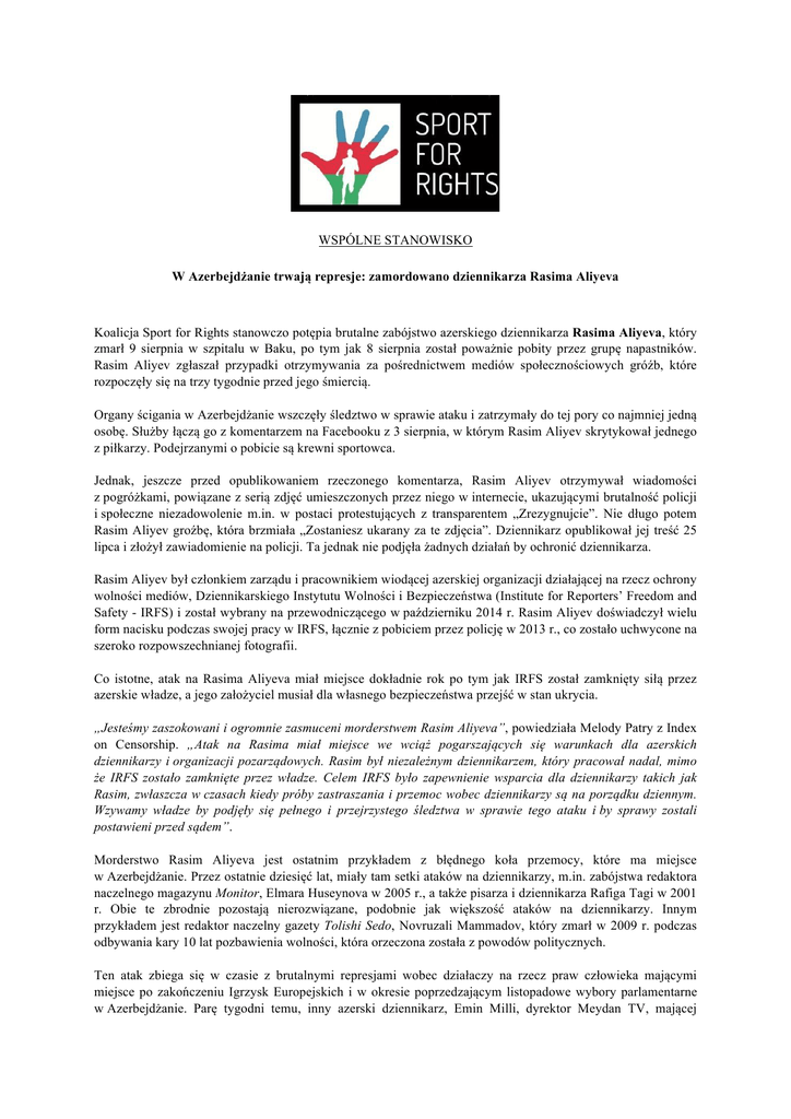 WSPÓLNE STANOWISKO W Azerbejdżanie trwają represje: zamordowano dziennikarza Rasima Aliyeva Koalicja Sport for Rights stanowczo potępia brutalne zabójstwo azerskiego dziennikarza Rasima Aliyeva, który zmarł 9 sierpnia w szpitalu w Baku, po tym jak 8 sierpnia został poważnie pobity przez grupę napastników. Rasim Aliyev zgłaszał przypadki otrzymywania za pośrednictwem mediów społecznościowych gróźb, które rozpoczęły się na trzy tygodnie przed jego śmiercią. Organy ścigania w Azerbejdżanie wszczęły śledztwo w sprawie ataku i zatrzymały do tej pory co najmniej jedną osobę. Służby łączą go z komentarzem na Facebooku z 3 sierpnia, w którym Rasim Aliyev skrytykował jednego z piłkarzy. Podejrzanymi o pobicie są krewni sportowca. Jednak, jeszcze przed opublikowaniem rzeczonego komentarza, Rasim Aliyev otrzymywał wiadomości z pogróżkami, powiązane z serią zdjęć umieszczonych przez niego w internecie, ukazującymi brutalność policji i społeczne niezadowolenie m.in. w postaci protestujących z transparentem „Zrezygnujcie”. Nie długo potem Rasim Aliyev groźbę, która brzmiała „Zostaniesz ukarany za te zdjęcia”. Dziennikarz opublikował jej treść 25 lipca i złożył zawiadomienie na policji. Ta jednak nie podjęła żadnych działań by ochronić dziennikarza. Rasim Aliyev był członkiem zarządu i pracownikiem wiodącej azerskiej organizacji działającej na rzecz ochrony wolności mediów, Dziennikarskiego Instytutu Wolności i Bezpieczeństwa (Institute for Reporters’ Freedom and Safety - IRFS) i został wybrany na przewodniczącego w październiku 2014 r. Rasim Aliyev doświadczył wielu form nacisku podczas swojej pracy w IRFS, łącznie z pobiciem przez policję w 2013 r., co zostało uchwycone na szeroko rozpowszechnianej fotografii. Co istotne, atak na Rasima Aliyeva miał miejsce dokładnie rok po tym jak IRFS został zamknięty siłą przez azerskie władze, a jego założyciel musiał dla własnego bezpieczeństwa przejść w stan ukrycia. „Jesteśmy zaszokowani i ogromnie zasmuceni morderstwem Rasim Aliyeva”, powiedziała Melody Patry z Index on Censorship. „Atak na Rasima miał miejsce we wciąż pogarszających się warunkach dla azerskich dziennikarzy i organizacji pozarządowych. Rasim był niezależnym dziennikarzem, który pracował nadal, mimo że IRFS zostało zamknięte przez władze. Celem IRFS było zapewnienie wsparcia dla dziennikarzy takich jak Rasim, zwłaszcza w czasach kiedy próby zastraszania i przemoc wobec dziennikarzy są na porządku dziennym. Wzywamy władze by podjęły się pełnego i przejrzystego śledztwa w sprawie tego ataku i by sprawy zostali postawieni przed sądem”. Morderstwo Rasim Aliyeva jest ostatnim przykładem z błędnego koła przemocy, które ma miejsce w Azerbejdżanie. Przez ostatnie dziesięć lat, miały tam setki ataków na dziennikarzy, m.in. zabójstwa redaktora naczelnego magazynu Monitor, Elmara Huseynova w 2005 r., a także pisarza i dziennikarza Rafiga Tagi w 2001 r. Obie te zbrodnie pozostają nierozwiązane, podobnie jak większość ataków na dziennikarzy. Innym przykładem jest redaktor naczelny gazety Tolishi Sedo, Novruzali Mammadov, który zmarł w 2009 r. podczas odbywania kary 10 lat pozbawienia wolności, która orzeczona została z powodów politycznych. Ten atak zbiega się w czasie z brutalnymi represjami wobec działaczy na rzecz praw człowieka mającymi miejsce po zakończeniu Igrzysk Europejskich i w okresie poprzedzającym listopadowe wybory parlamentarne w Azerbejdżanie. Parę tygodni temu, inny azerski dziennikarz, Emin Milli, dyrektor Meydan TV, mającej siedzibę w Berlinie, również miał otrzymać groźbę, a niedługo po niej na wielu jego krewnych zaczęto wywierać presję. Czterech pracowników z Meydan TV zostali później powstrzymani przed opuszczeniem Azerbejdżanu. „Dalsze przykłady nieustających wysiłków władz w Azerbejdżanie zmierzających do zduszenia wszelkich form krytyki i sprzeciwu można znaleźć w sprawach obrońców praw człowieka Leyli i Arifa Yunus, a także dziennikarki Khadiji Ismayilovej, wobec których toczy się właśnie postępowanie sądowe mające wyraźne podłoże polityczne”, mówią honorowa przewodnicząca FIDH Souhayr Belhassen i sekretarz generalny OMCT Gerald Staberock, których organizacje pracują razem w ramach Obserwatorium Ochrony Obrońców Praw Człowieka (Observatory for the Protection of Human Rights Defenders). Prokurator zażądał zdumiewająco wysokiej kary pozbawienia wolności, mimo iż Yunusowie mają poważne problemy zdrowotne i powinni zostać natychmiast zwolnieni z powodów humanitarnych, jeżeli nie politycznych. Sport for Rights domaga się by władze w Azerbejdżanie przeprowadziły pełne i przejrzyste śledztwo w sprawie zabójstwa Rasima Aliyeva i by doprowadziły zarówno sprawców jak i organizatorów przed sąd. Krąg przemocy wobec dziennikarzy w Azerbejdżanie musi się skończyć i ci odpowiedzialni za te zbrodnie muszą ponieść odpowiedzialność. Groźby wobec dziennikarzy muszą zostać wzięte na poważnie, a zastraszani dziennikarze i ich rodziny muszą mieć zapewnioną odpowiednią ochronę. Koalicja domaga się również by władze podjęły konkretne działania mające na celu poprawienie sytuacji w zakresie przestrzegania praw człowieka, włączając w to natychmiastowe i bezwarunkowe zwolnienie z więzienia wszystkich dziennikarzy i obrońców praw człowieka. Sport for Rights domaga się również by społeczność międzynarodowa nadal kierowała swoją uwagę na Azerbejdżan, szczególnie teraz gdy zainteresowanie mediów tym krajem po Igrzyskach Europejskich zmalało. Jak pokazuje zabójstwo Rasima Aliyeva, głosy krytyki są w jeszcze większym niebezpieczeństwie niż kiedykolwiek wcześniej. Społeczność międzynarodowa musi zacząć działać teraz by pociągnąć Azerbejdżan do odpowiedzialności, za łamanie jego zobowiąza