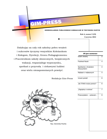 S S E R P M I G NIEREGULARNIK PUBLICZNEGO GIMNAZJUM W TRZYDNIKU DUŻYM Rok 4, numer 5 (19) Czerwiec 2012 Dziękując za cały rok szkolny pełen wrażeń i sukcesów życzymy wszystkim Koleżankom i Kolegom, Dyrekcji, Gronu Pedagogicznemu W tym numerze: Dzień otwarty 2 Festiwal Nauki 4 Spotkanie z Anatolem Diaczyńskim 4 Najlepsi z najlepszych 5 Uczeń potrafi 6 Jak ITAKA może pomóc? 6 „Zagrajmy o sukces” 7 Przeczytałam… polecam... 8 i Pracownikom szkoły słonecznych, bezpiecznych wakacji, wspaniałego wypoczynku, spotkań z przyrodą i ciekawymi ludźmi oraz wielu niezapomnianych przeżyć. Redakcja Gim-Press Rys. Dominika Pachla STR. 2 GIM-PRESS Z życia szkoły... Dzień Otwarty dla szóstoklasistów 16 maja Samorząd Uczniowski zorganizował Dni Otwarte dla szóstoklasistów. Odwiedzili nas uczniowie ze szkół podstawowych z naszej gminy oraz z Gościeradowa. Początek imprezy nastąpił na hali sportowej o godzinie 10:00. Gości powitał Pan Dyrektor i Pani Małgorzata Nowak – opiekun SU, następnie głos zabrała przewodnicząca samorządu Amanda, która zachęcała przybyłych, by od września zawitali do nas do szkoły, mówiła do organizacjach działających w gimnazjum oraz ich sukcesach. Następnie pani Ewa Sobota razem z zespołem wokalnym uczyła uczniów klas VI dwóch piosenek: „Zapłakany świat” oraz „Czy pani ma”. Fot. Klaudia Stola Fot. Klaudia Stola Fot. Klaudia Stola Fot. Klaudia Stola ROK 4, NUMER 5 (19) STR. 3 Po części oficjalnej szóstoklasistów podzieliliśmy na grupy, którymi opiekowali się starsi koledzy i koleżanki z gimnazjum. Następnie opiekunowie prezentowali walory naszej szkoły. W klasie biologicznej pan Henryk Flis opowiadał o działalności LOP-u, SKW oraz klubu 4H. W klasie fizyczno-chemicznej pani Iwona Głuchowska z pomocą uczniów Radka i Patryka wykonała pokaz doświadczeń. W kolejnej klasie pani Anna Skrzypek z uczennicami Klaudią i Alą przedstawiły prezentacje o Euro-Week’u oraz zaprezentowały nasz nowy sprzęt - tablicę interaktywną. Fot. Klaudia Stola Fot. Klaudia Stola W sali nr 24 uczniowie klas VI oglądali prezentację multimedialną przygotowaną przez panią Ewę Gałczyńską. W bibliotece pani Dorota Laskowska przedstawiła szóstoklasistom prezentację „Z życia biblioteki” jak również częstowała cukierkami i zachęcała do obejrzenia wcześniejszych numerów naszej gazety. Fot. Klaudia Stola Fot. Klaudia Stola Goście mieli również okazję piec muffinki razem z panią Małgorzatą Naborczyk i jej uczennicami. Fot. Klaudia Stola Fot. Klaudia Stola Na koniec wizyty, mimo wietrznej pogody, wszyscy wyszli na Orlika i kibicowali swoim starszym kolegom grającym w piłkę nożną. Dominika Resztak STR. 4 GIM-PRESS Tegoroczny Dzień Dziecka w naszej szkole przebiegał pod hasłem „Festiwal Nauki”. Na początku przedstawiciele Samorządu Uczniowskiego przypomnieli nam prawa dziecka. Następnie z krótkim recitalem wystąpiła Karolina Rak, a uczniowie klasy IIIc zaprezentowali pokaz udzielania pierwszej pomocy. Ponadto na hali zorganizowano wystawy z fizyki, biologii oraz historii. Ten dzień był również świetną okazją do wręczenia nagród i wyróżnień. Wójt Gminy Trzydnik Duży wręczył stypendia za I semestr roku szkolnego 2011/2012. Otrzymali je: Sylwia Gac z klasy IIIa, Justyna Maciąg z klasy IIb, Dominika Ćwik z klasy IIIc, Alicja Wolanin z klasy IIIb oraz Agnieszka Kosikowska z klasy IIIa. Wręczone zostały również nagrody za konkursy, które przeprowadzono w pierwszym semestrze. Po zakończeniu części oficjalnej uczniowie otrzymali lody i cukierki ufundowane przez Radę Rodziców. Dominika Resztak Fot. Ala Wolanin Fot. Ala Wolanin Spotkanie autorskie z Anatolem Diaczyńskim Fot. Ala Wolanin Fot. Ala Wolanin 22 maja w naszej szkole odbyło się spotkanie autorskie z Anatolem Diaczyńskim. Zorganizowane ono zostało przy współpracy biblioteki szkolnej i Gminnej Biblioteki Publicznej w Trzydniku Dużym. Spotkanie związane było z promocją najnowszej książki pana Anatola - „Tętent koni przez wieki” Uczniowie wysłuchali historii życia pisarza oraz dowiedzieli się, jaki miała wpływ na jego twórczość. Uczestnicy spotkania mogli uzyskać odpowiedzi na nurtujące ich pytania związane z życiem pisarza, warsztatem jego pracy oraz otrzymać autograf. Krystian Dziewa ROK 4, NUMER 5 (19) STR. 5 N ajle p s i z n ajle ps zy c h Uczniowie z najwyższą średnią Wolanin Alicja - IIIB - średnia ocen 5,67 Wojtaś Klaudia - IIIA - średnia o cen 5,66 Ćwik Dominika - IIIC - średnia ocen 5,61 Gołąb Małgorzata - IIIC - średnia ocen 5,61 Włoda Martyna - IIIA - średnia ocen 5,61 Rak Karolina - IIC - średnia ocen 5,50 Kosikowska Agnieszka - IIIA - średnia ocen 5,50 Wójtowicz Patrycja - IIID - średnia ocen 5,50 Kosikowska Beata - IIIA - średnia ocen 5,43 Ranking klas według średnich ocen 1 miejsce - klasa IIIA (średnia 3,98) 2 miejsce - klasa IIIB (średnia 3,96) 3 miejsce - klasa IIIC (średnia 3,92) 4 miejsce - klasa IIID (średnia 3,65) 5 miejsce - klasa IIC (średnia 3,60) 6 miejsce - klasa IA (średnia 3,48) 7 miejsce - klasa IB (średnia 3,45) 8 miejsce - klasa IIB (średnia 3,39) 8 miejsce - klasa IIA (średnia 3,39) Gac Sylwia - IIIA - średnia ocen 5,43 Najlepsi czytelnicy w roku szkolnym 2011/2012: Pączek Katarzyna - IIID - średnia ocen 5,39 Resztak Dominika - IIID - średnia ocen 5,39 Partyka Paulina - IIIA - średnia ocen 5,38 Wójcik Ewa - IIIC - średnia ocen 5,35 Wieleba Justyna - IIIB - średnia ocen 5,33 Maciąg Justyna - IIB - średnia ocen 5,31 Chmielewska Aleksandra - IIB - średnia ocen 5,25 Dziewa Krystian - IA - średnia ocen 5,21 Jabłońska Patrycja - IA - średnia ocen 5,21 Pikula Joanna - IIID - średnia ocen 5,17 Bancer Kinga - IIIA - średnia ocen 5,16 Mazur Aleksandra - IA - średnia ocen 5,14 Kuryło Aleksandra - IIB - średnia ocen 5,13 Rydzewska Patrycja - IB - 5,07 Kuzdralińska Joanna - IIC - średnia ocen 5,06 Wa