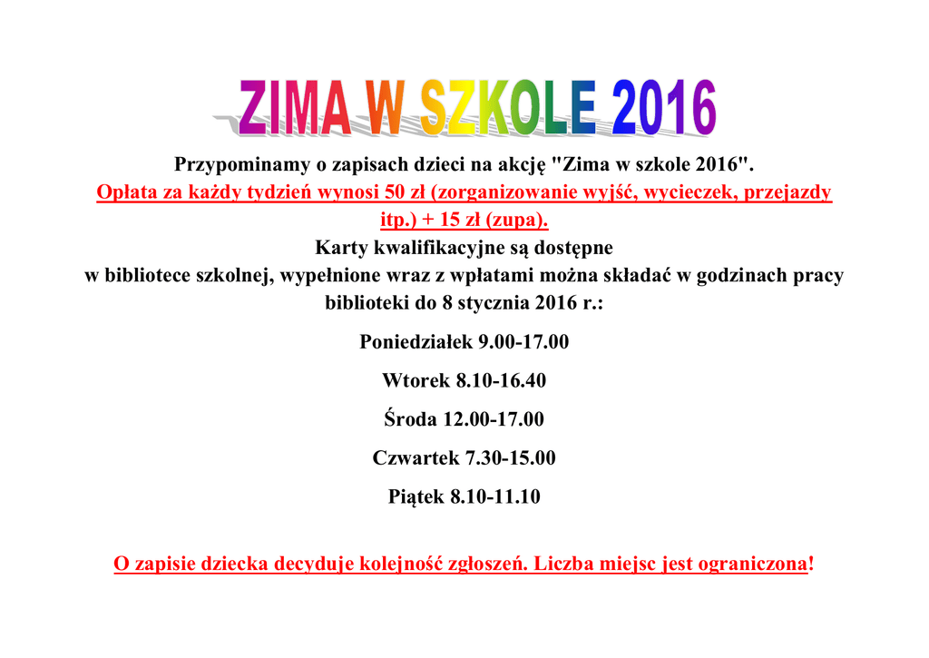 Przypominamy o zapisach dzieci na akcję "Zima w szkole 2016". Opłata za każdy tydzień wynosi 50 zł (zorganizowanie wyjść, wycieczek, przejazdy itp.) + 15 zł (zupa). Karty kwalifikacyjne są dostępne w bibliotece szkolnej, wypełnione wraz z wpłatami można składać w godzinach pracy biblioteki do 8 stycznia 2016 r.: Poniedziałek 9.00-17.00 Wtorek 8.10-16.40 Środa 12.00-17.00 Czwartek 7.30-15.00 Piątek 8.10-11.10 O zapisie dziecka decyduje kolejność zgłoszeń. Liczba miejsc jest ograniczona!