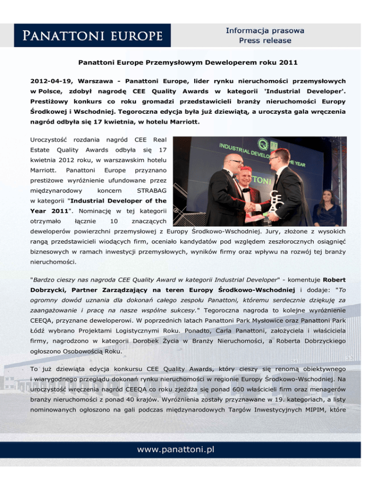 Panattoni Europe Przemysłowym Deweloperem roku 2011 2012-04-19, Warszawa - Panattoni Europe, lider rynku nieruchomości przemysłowych w Polsce, zdobył nagrodę CEE Quality Awards w kategorii 'Industrial Developer'. Prestiżowy konkurs co roku gromadzi przedstawicieli branży nieruchomości Europy Środkowej i Wschodniej. Tegoroczna edycja była już dziewiątą, a uroczysta gala wręczenia nagród odbyła się 17 kwietnia, w hotelu Marriott. Uroczystość Estate rozdania Quality nagród Awards CEE odbyła się Real 17 kwietnia 2012 roku, w warszawskim hotelu Marriott. Panattoni Europe przyznano prestiżowe wyróżnienie ufundowane przez międzynarodowy koncern STRABAG w kategorii "Industrial Developer of the Year 2011". Nominację w tej kategorii otrzymało łącznie 10 znaczących deweloperów powierzchni przemysłowej z Europy Środkowo-Wschodniej. Jury, złożone z wysokich rangą przedstawicieli wiodących firm, oceniało kandydatów pod względem zeszłorocznych osiągnięć biznesowych w ramach inwestycji przemysłowych, wyników firmy oraz wpływu na rozwój tej branży nieruchomości. "Bardzo cieszy nas nagroda CEE Quality Award w kategorii Industrial Developer" - komentuje Robert Dobrzycki, Partner Zarządzający na teren Europy Środkowo-Wschodniej i dodaje: "To ogromny dowód uznania dla dokonań całego zespołu Panattoni, któremu serdecznie dziękuję za zaangażowanie i pracę na nasze wspólne sukcesy." Tegoroczna nagroda to kolejne wyróżnienie CEEQA, przyznane deweloperowi. W poprzednich latach Panattoni Park Mysłowice oraz Panattoni Park Łódź wybrano Projektami Logistycznymi Roku. Ponadto, Carla Panattoni, założyciela i właściciela firmy, nagrodzono w kategorii Dorobek Życia w Branży Nieruchomości, a Roberta Dobrzyckiego ogłoszono Osobowością Roku. To już dziewiąta edycja konkursu CEE Quality Awards, który cieszy się renomą obiektywnego i wiarygodnego przeglądu dokonań rynku nieruchomości w regionie Europy Środkowo-Wschodniej. Na uroczystość wręczenia nagród CEEQA co roku zjeżdża się ponad 600 właścicieli firm oraz menagerów branży nieruchomości z ponad 40 krajów. Wyróżnienia zostały przyznawane w 19. kategoriach, a listy nominowanych ogłoszono na gali podczas międzynarodowych Targów Inwestycyjnych MIPIM, które miały miejsce na początku marca br. w Cannes. Tegoroczną imprezę uzupełnił bogaty program rozrywkowy. Wśród artystów znaleźli się między innymi Wet Fingers, Nick Sinckler, Lenny Kravitz czy Lindsay Martell. Galę piąty raz z kolei poprowadziła znana polska prezenterka telewizyjna Monika Richardson. www.panattoni.pl (http://panattoni.pl/) Dodatkowe informacje: Anita Pietrykowska, Panattoni Europe, tel. 22 540 73 02, [email protected] Ewelina Ciuchta, KONKRET PR tel. 508 338 267, [email protected] O Panattoni Europe Panattoni Europe jest częścią Panattoni Development Company, jednego z największych deweloperów powierzchni przemysłowych na świecie, prowadzącego działalność w 40 oddziałach w Ameryce Północnej i Europie. Panattoni obecny jest w Europie Środkowej od 2005 roku i przez ten czas zrealizował 36 projekty o łącznej wartości 648 mln EUR. Deweloper wybudował dotychczas w Polsce i Czechach ok. 1,5 miliona m2 nowoczesnej powierzchni przemysłowej. W ramach Panattoni Europe działa struktura, dedykowana projektom dopasowanym do indywidualnych potrzeb najemców, typu build-to-suit. Wśród kluczowych klientów są takie firmy jak arvato services Polska, Coty Cosmetics, DSV, H&M, Intermarché, Leroy Merlin, ND Logistics, Still, Schenker i Tesco. Oprócz Polski Panattoni Europe ma swoje przedstawicielstwa w Wielkiej Brytanii, Czechach, Francji, Włoszech, Hiszpanii, Luksemburgu i Niemczech.